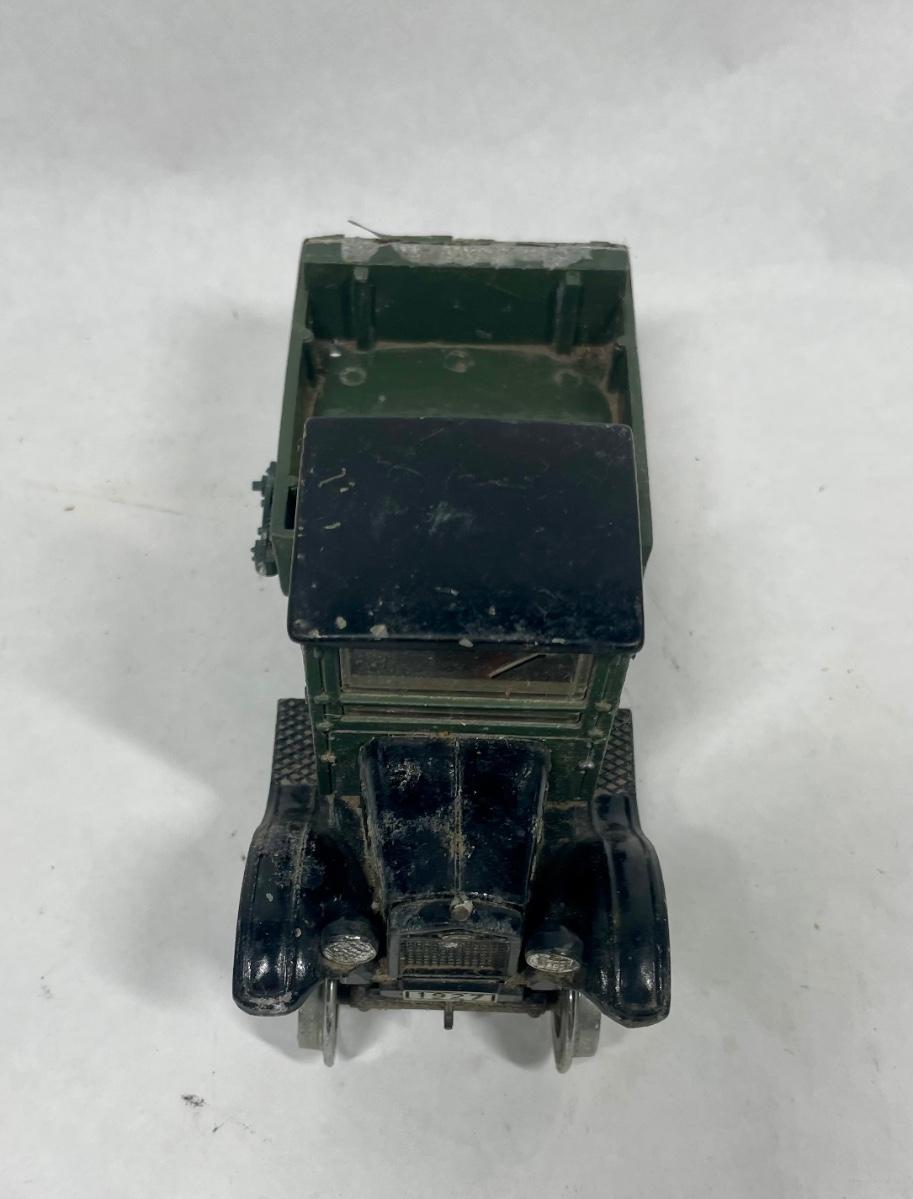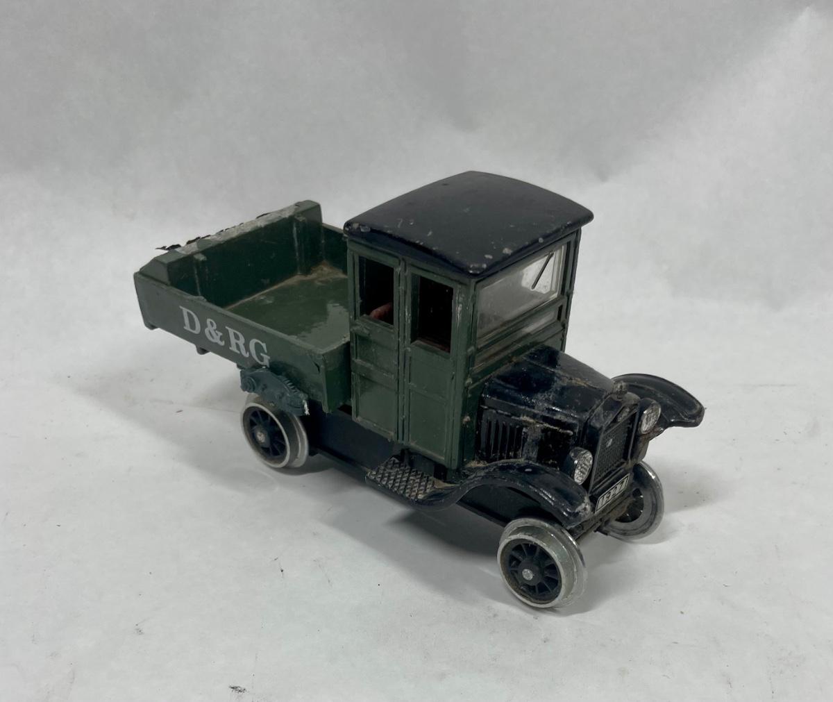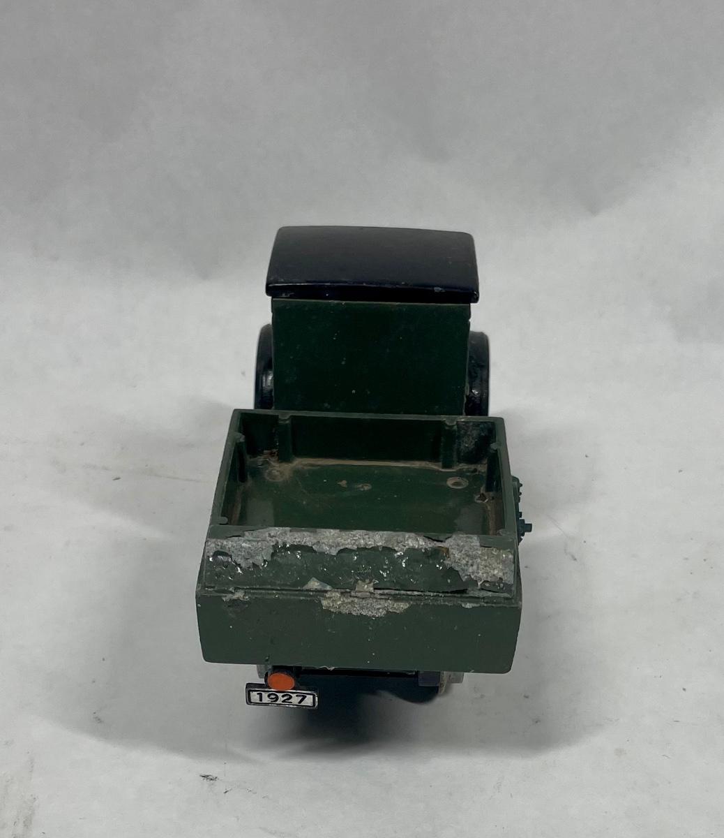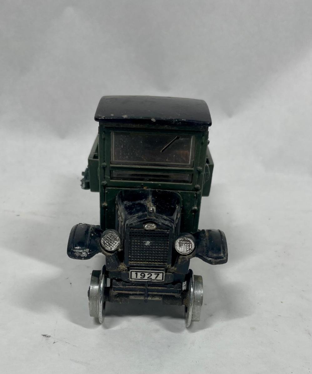 Die cast construction. Has train wheels instead of regular tires, was used by track maintenance crews. Some paint flaking but otherwise in good condition.