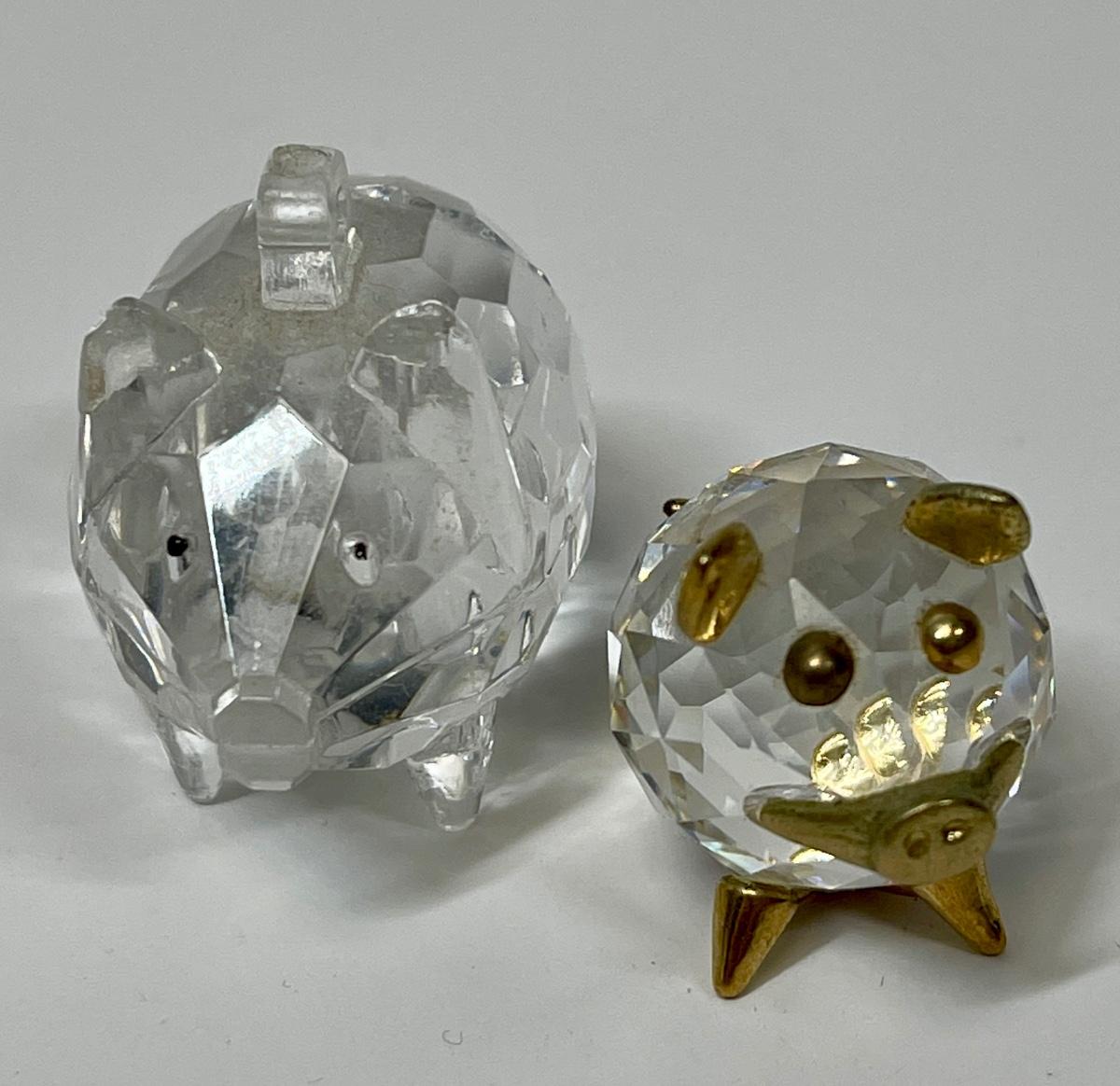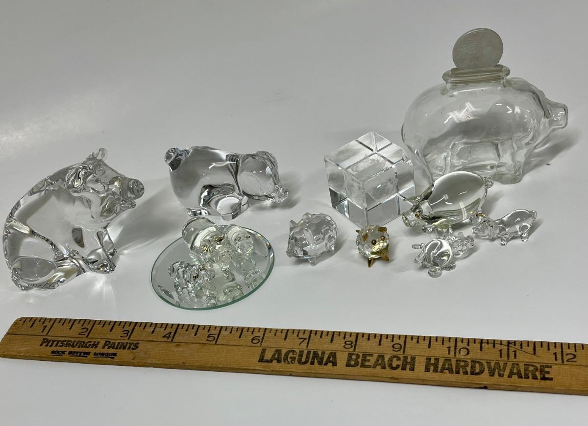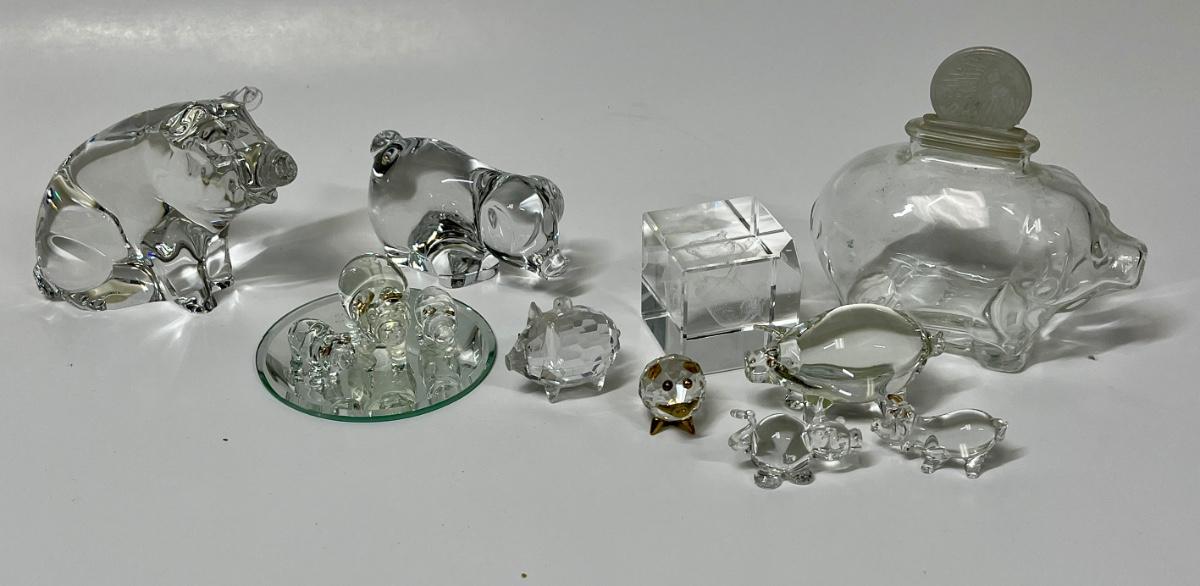 Includes a German-made small piggy bank, some faceted crystal pigs, a larger paperweight pig, and etched image of a pig in a cube, and more.