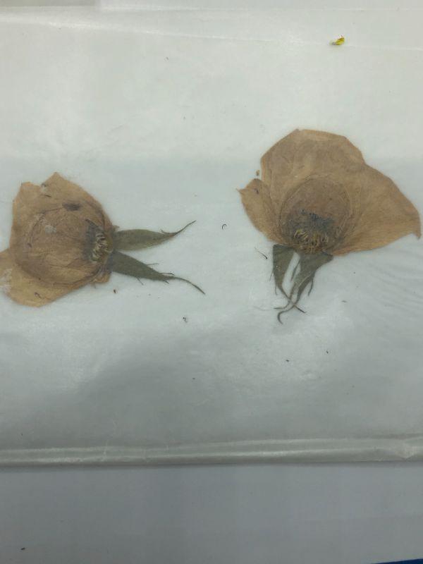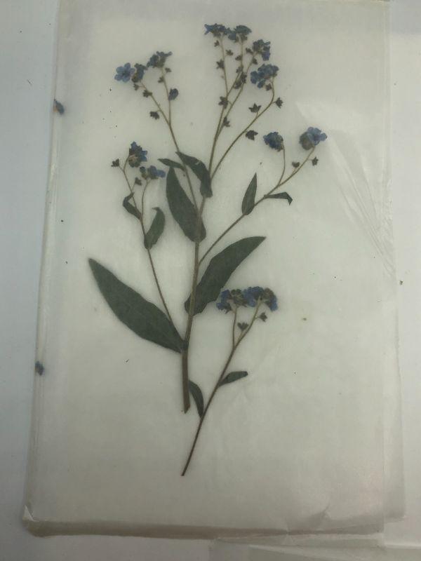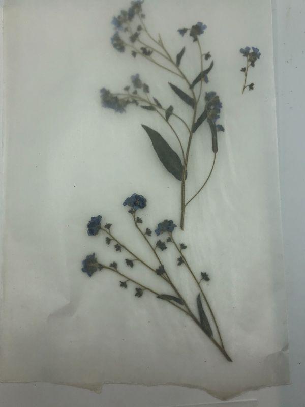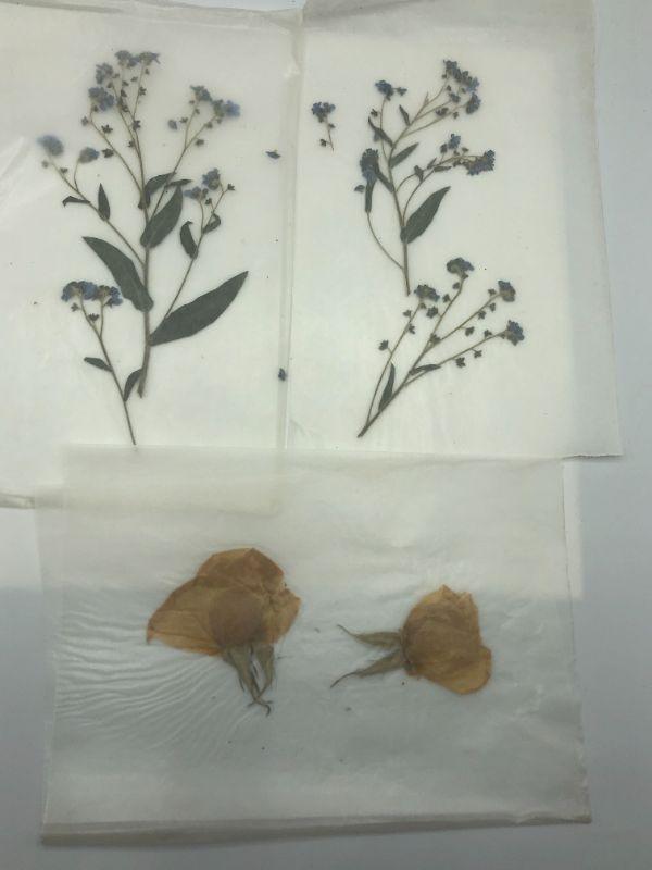 Dried flowers pressed between sheets of wax paper. Age unknown, they were found between the pages of an old book.