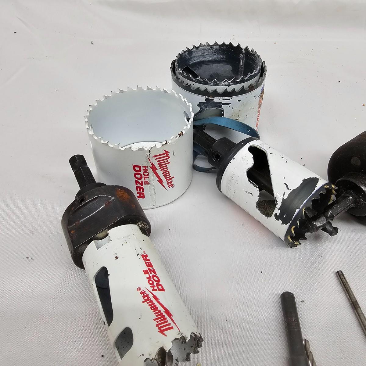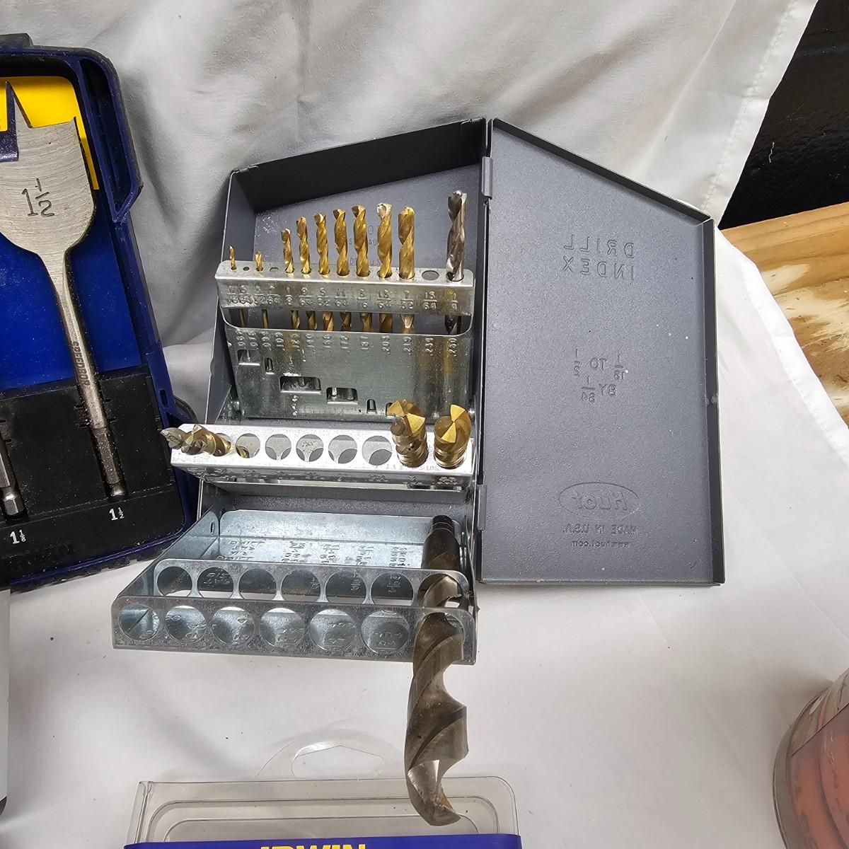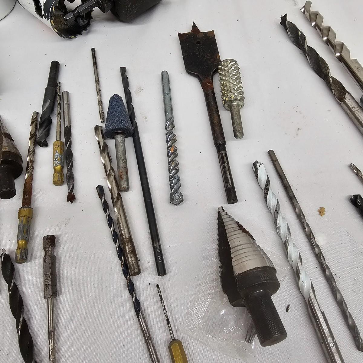 Various types and sizes of drill bits including spade bits, twist, masonry and more. Items by Irwin, DeWalt, Milwaukee and others. Screw extractor, stop collars, hole boring items. Most items used but some new in package. See photos for details. Local pickup only.