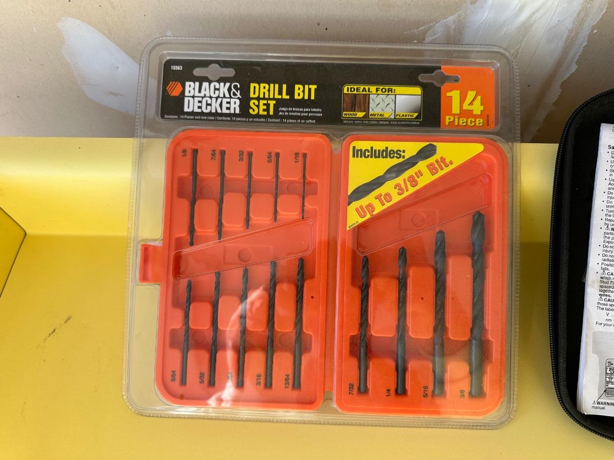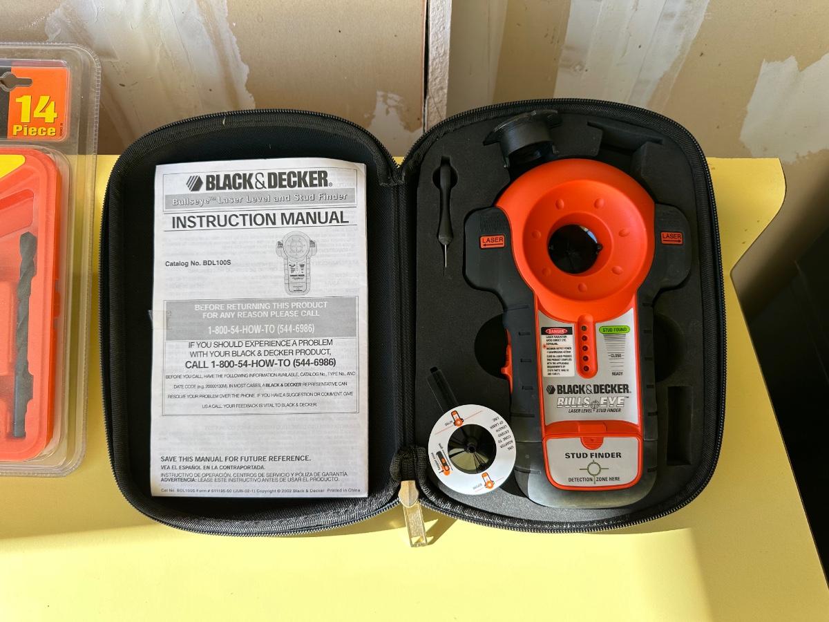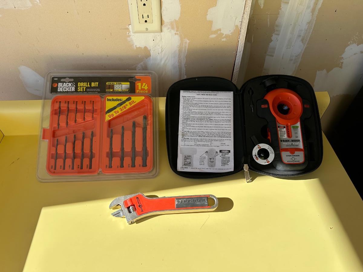 DRILL BIT SET, BULLS-EYE STUD FINDER AND CRESCENT WRENCH