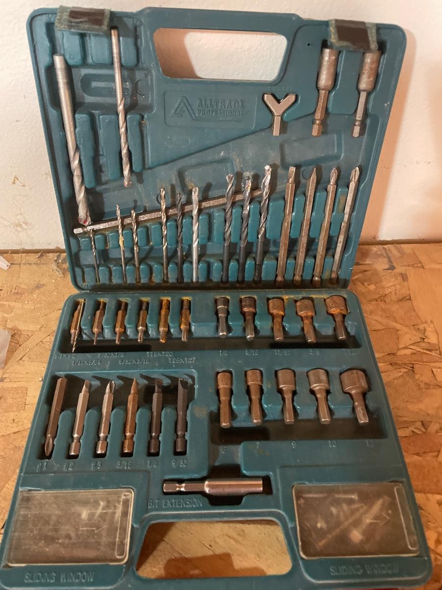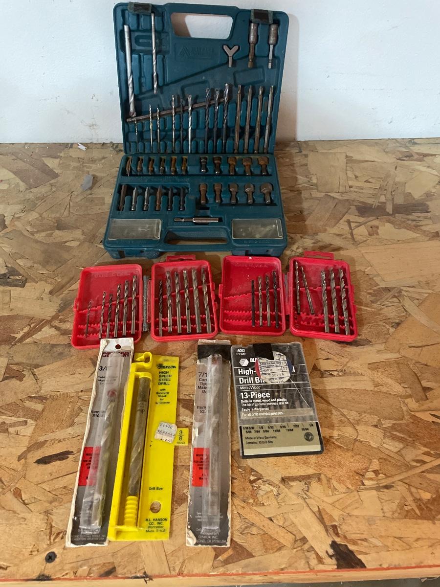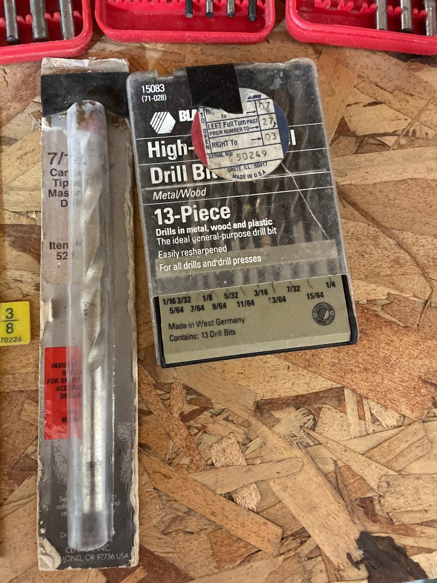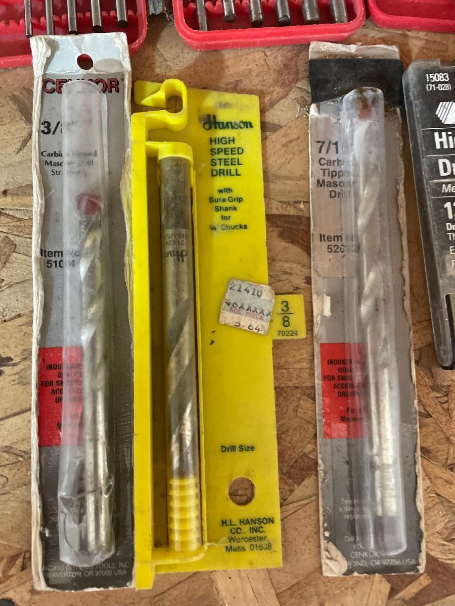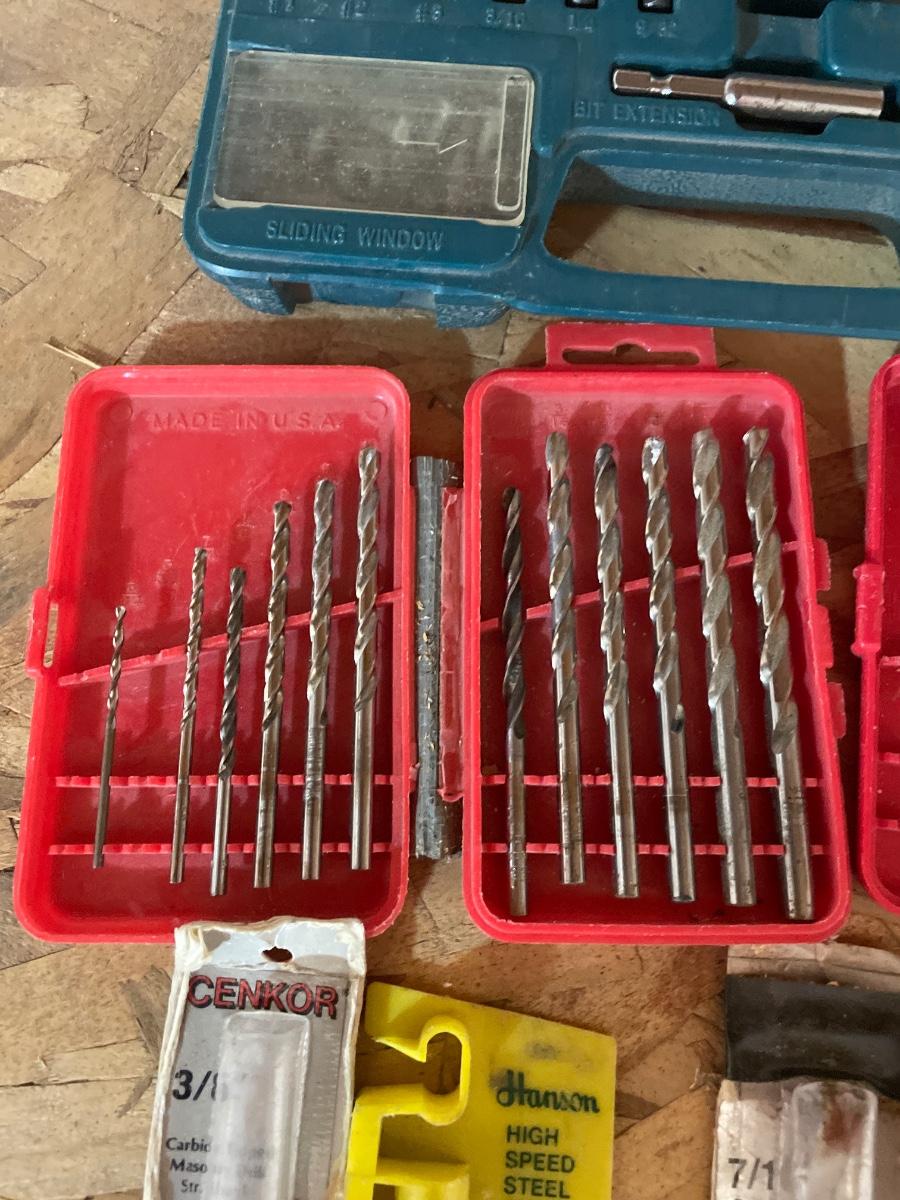 Drill bits lot. Green case, 2 red cases black/silver case and. 3 individual drill bits.