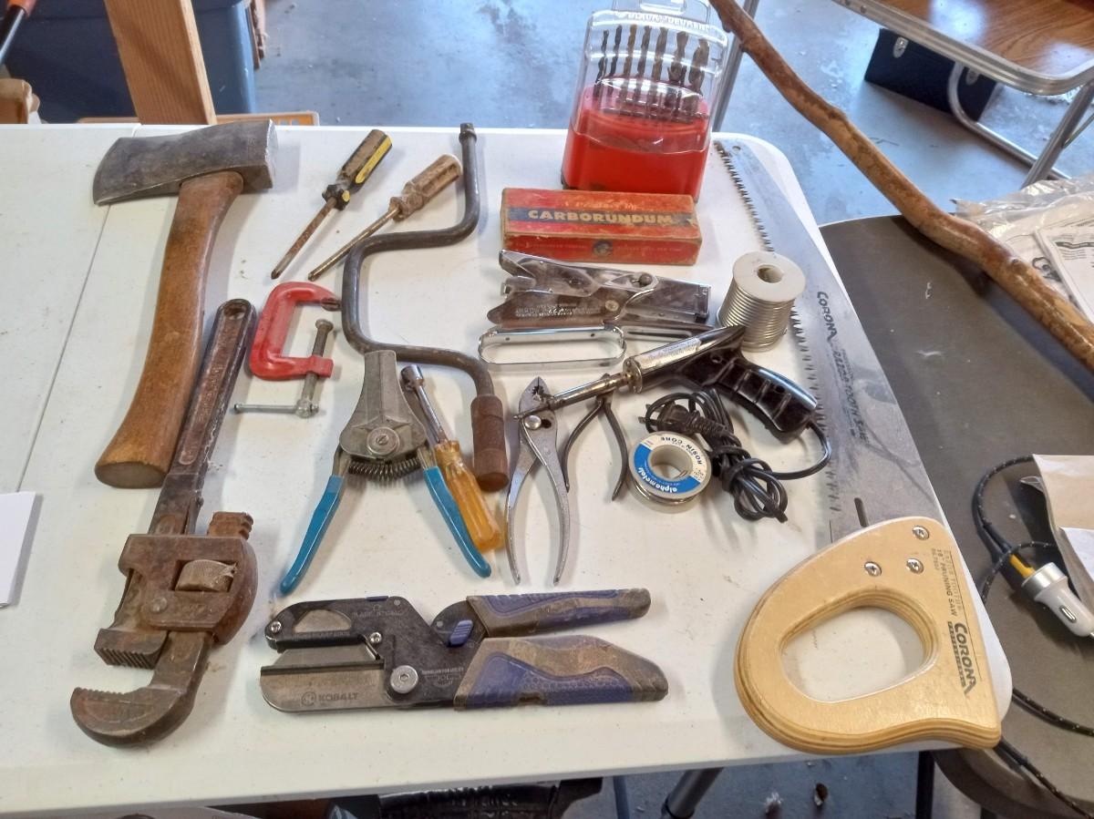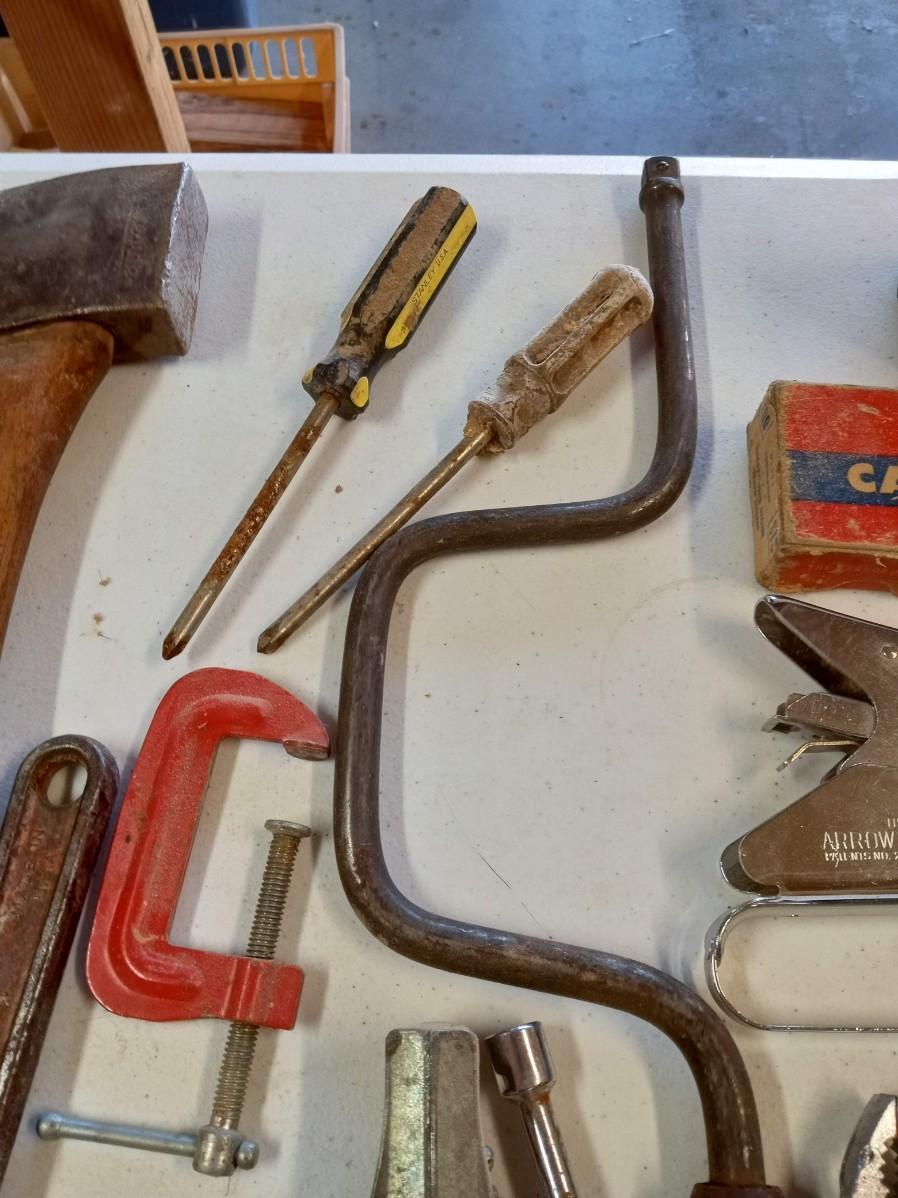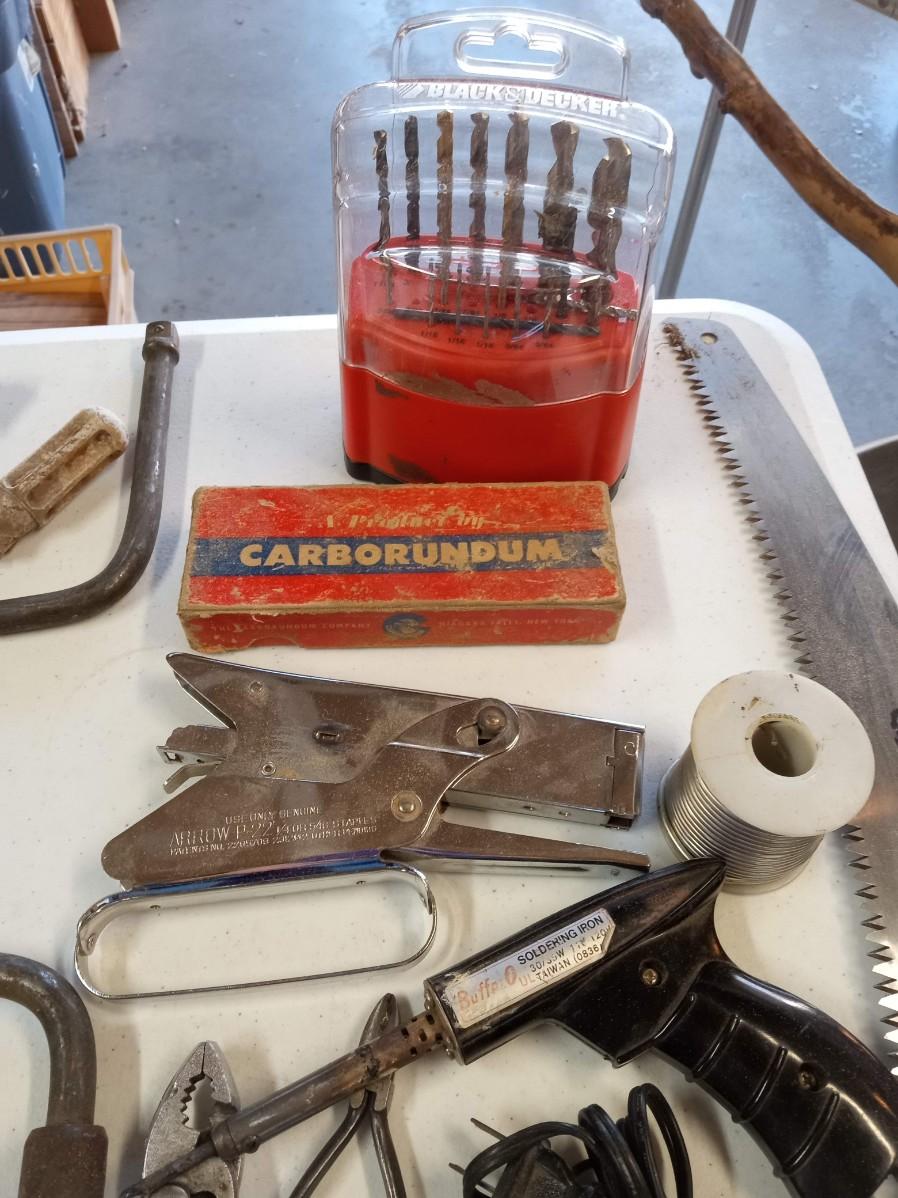 DRILL BITS AND A COLLECTION OF HAND TOOLS