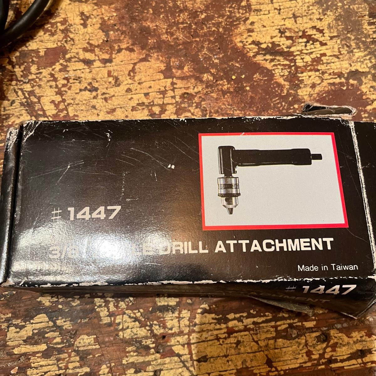Lot includes a Craftsman electric drill, Speedbor2000 wood bits. Irwin masonry bits, two metal boxes filled with bits. Hellas damaged screw extractor, 3/8” angle drill attachment and more drill boots. Drill powered on when plugged in.
