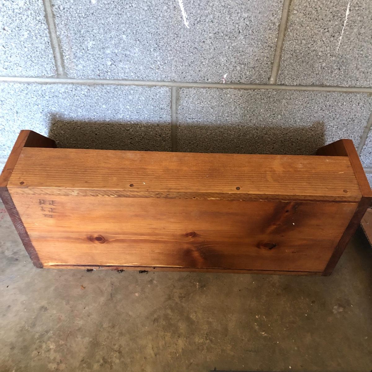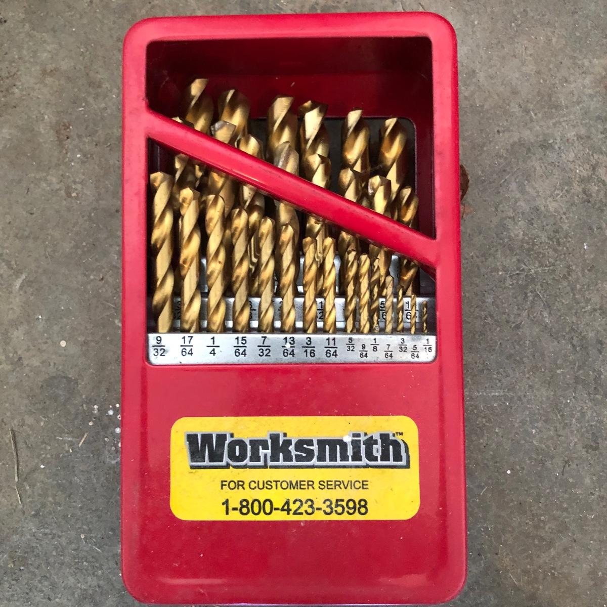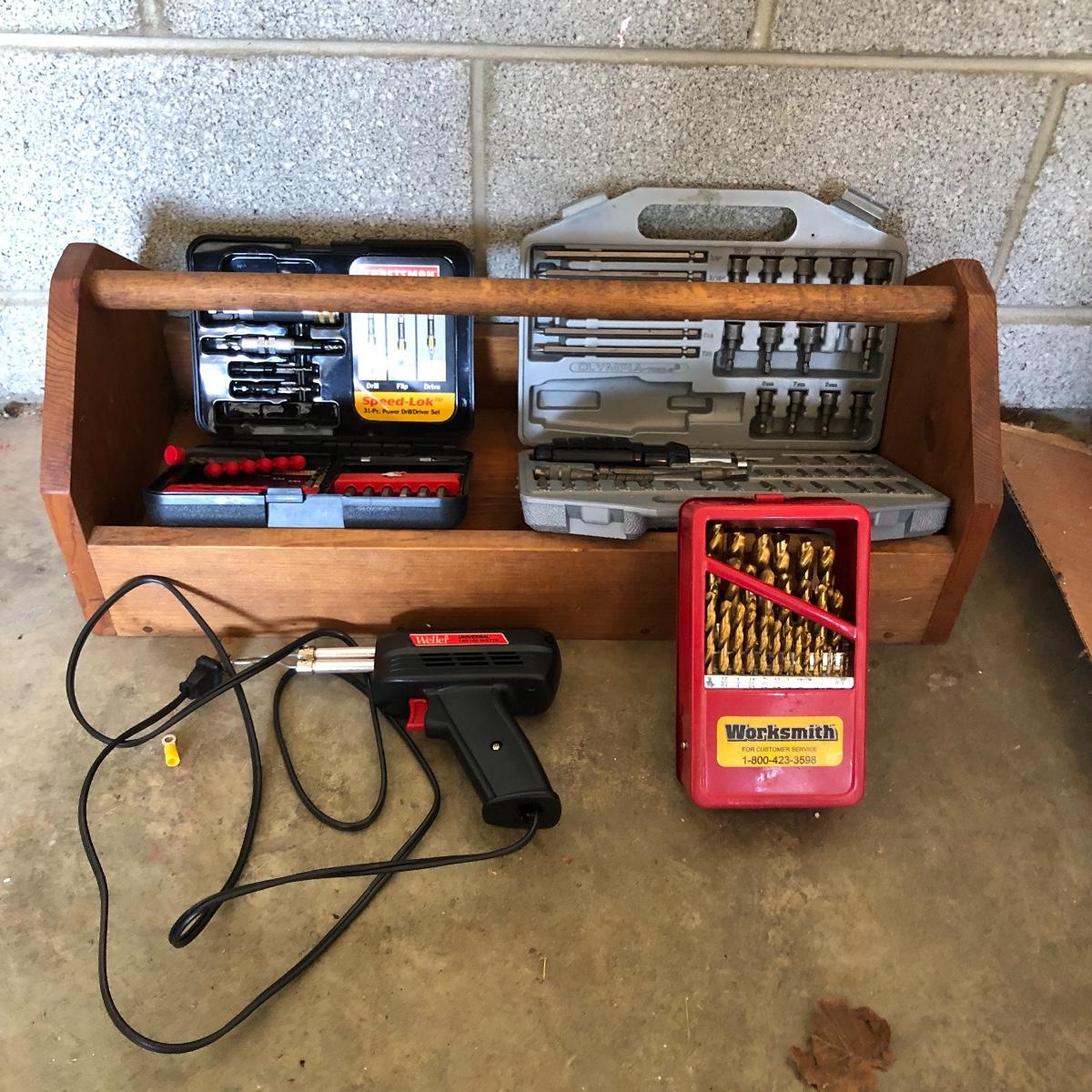Lot includes Worksmith Drill bits, Craftsman Speed-Lok drill bits, Weller soldering iron, Olympia screwdriver set and a wooden toolbox. Wooden box measures 10” x 24” x 9”.