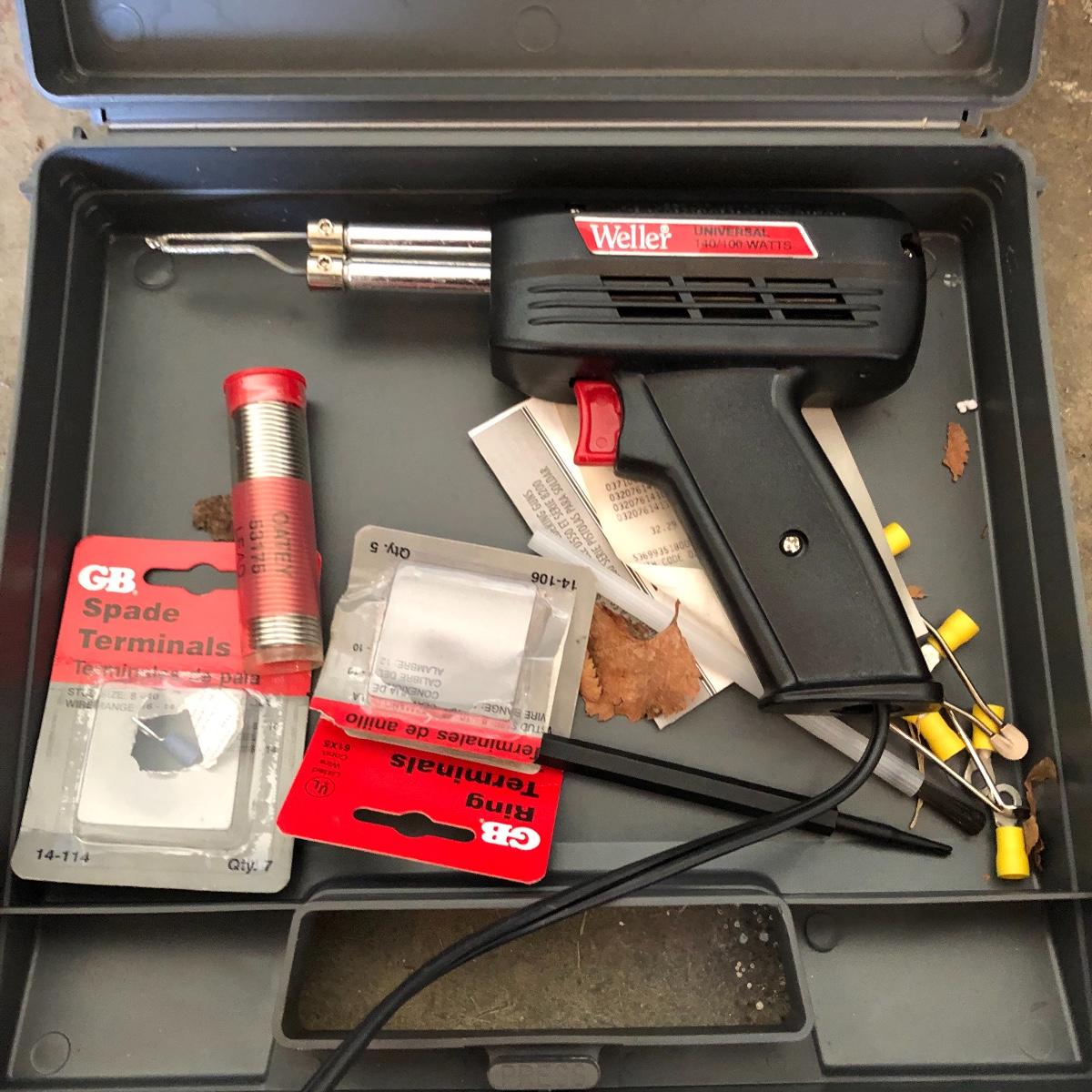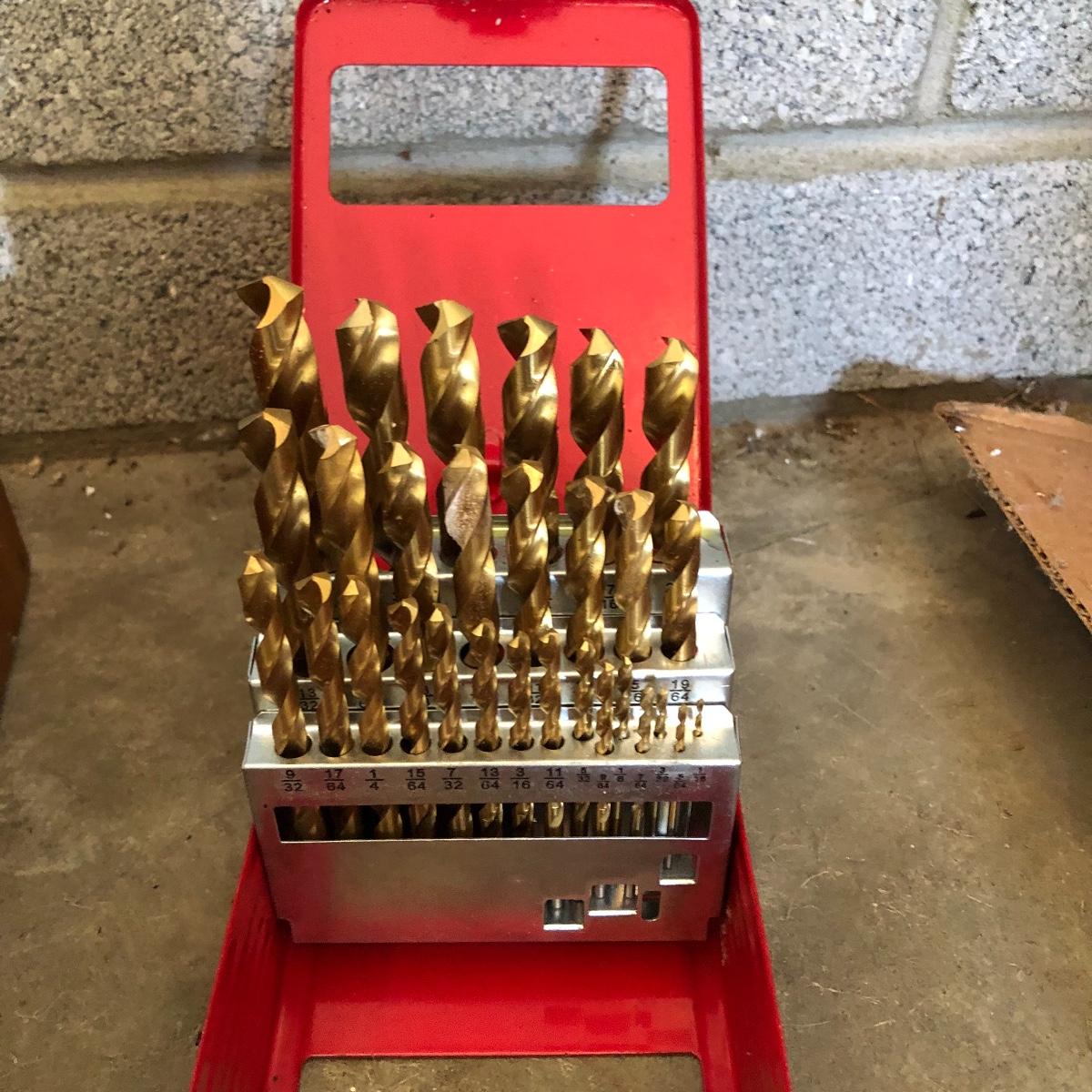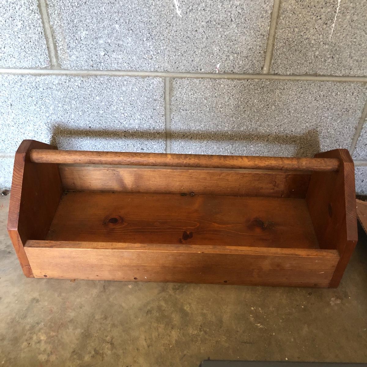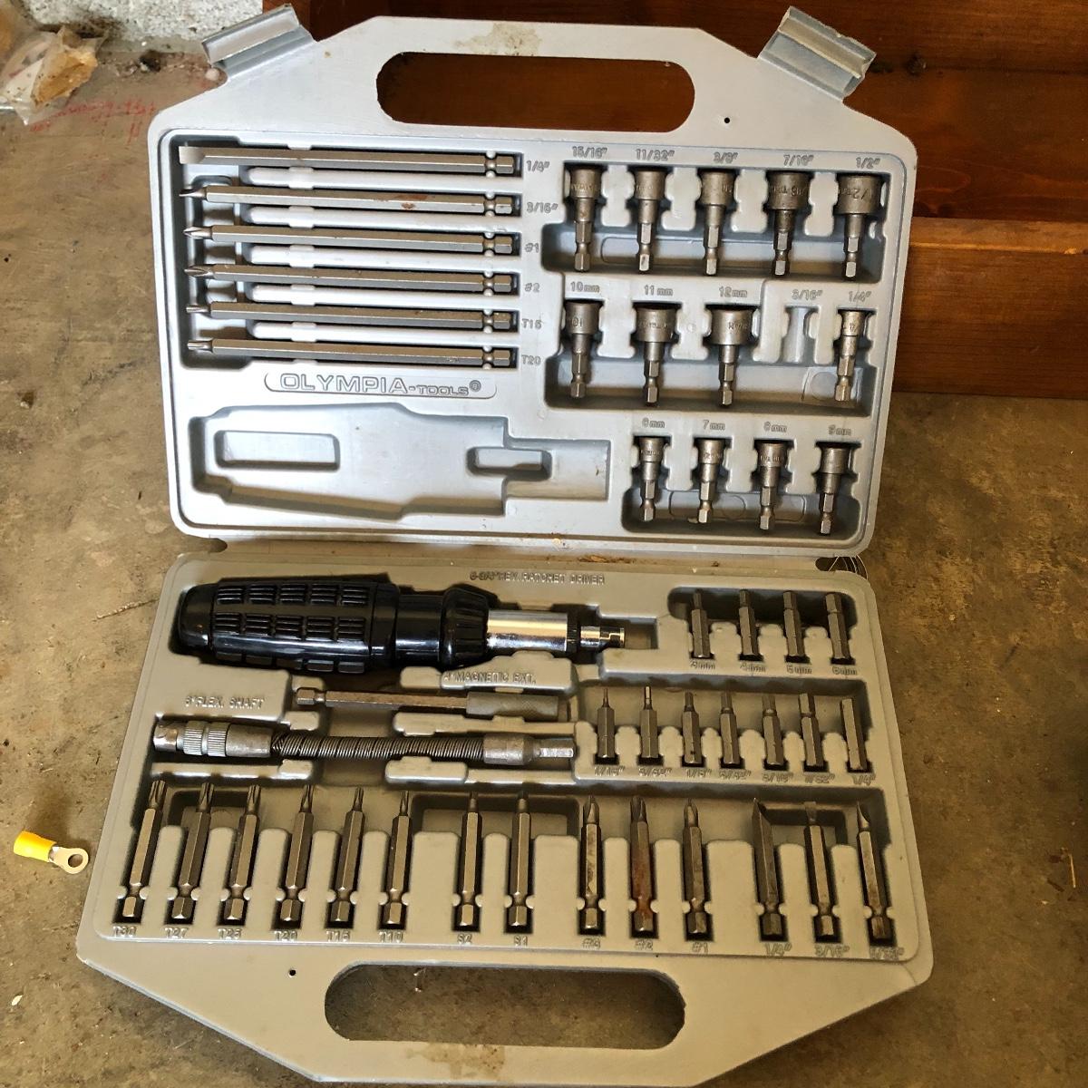 Lot includes Worksmith Drill bits, Craftsman Speed-Lok drill bits, Weller soldering iron, Olympia screwdriver set and a wooden toolbox. Wooden box measures 10” x 24” x 9”.