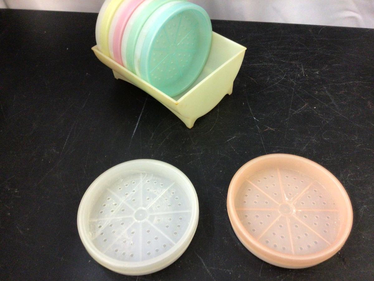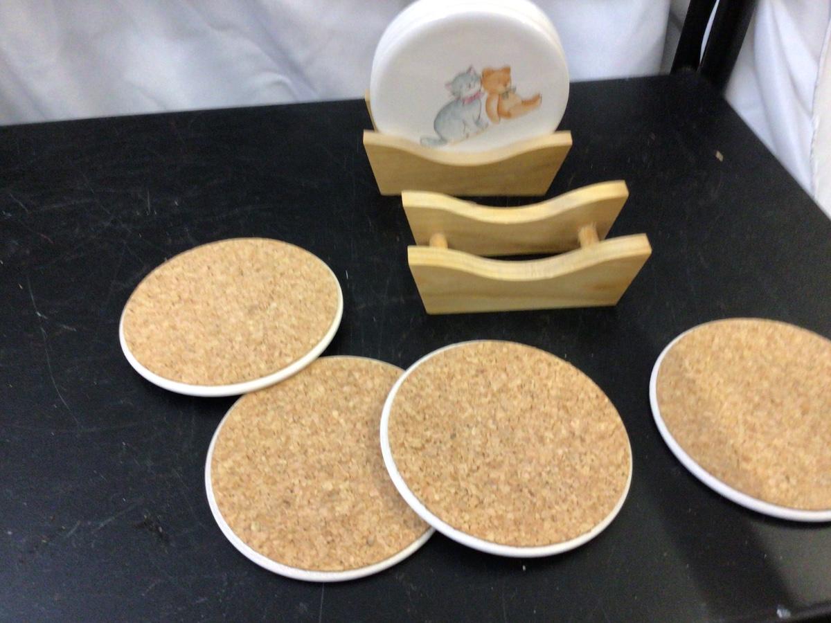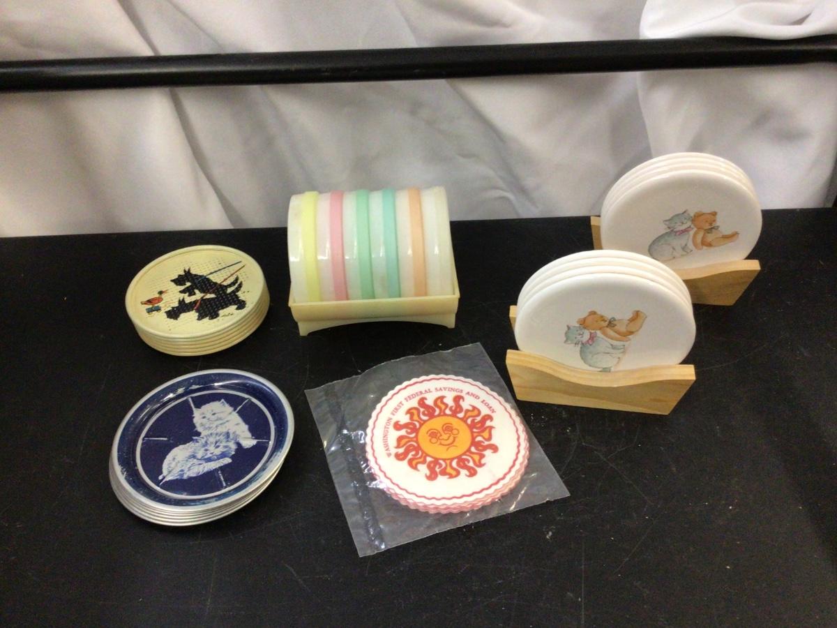 You get a great lot of drink coasters. There is Tupperware set, two sets of cats and bears with wood holders, two sets of metal coasters one with cats and another with dogs, and finally cloth Sun coasters.