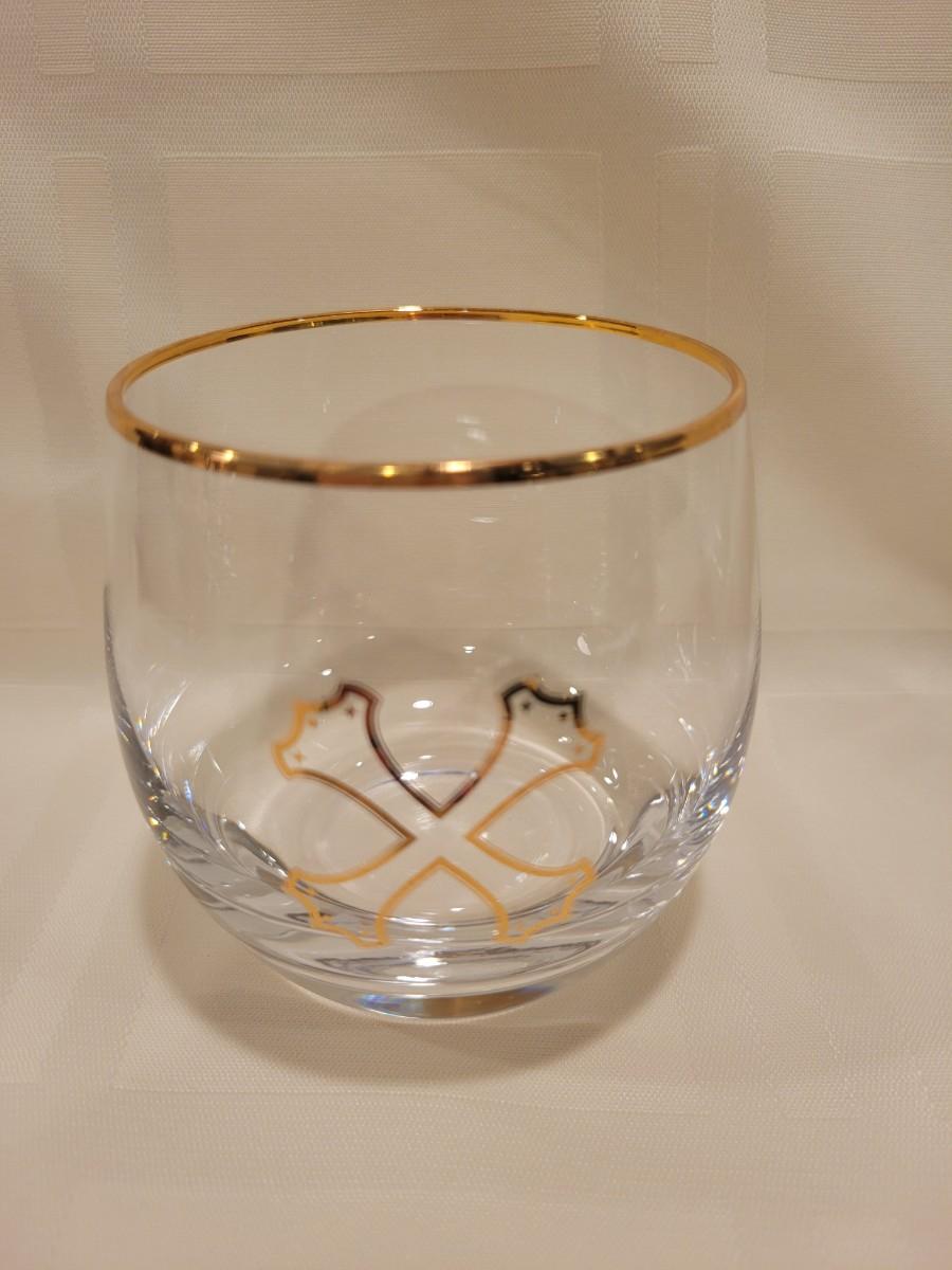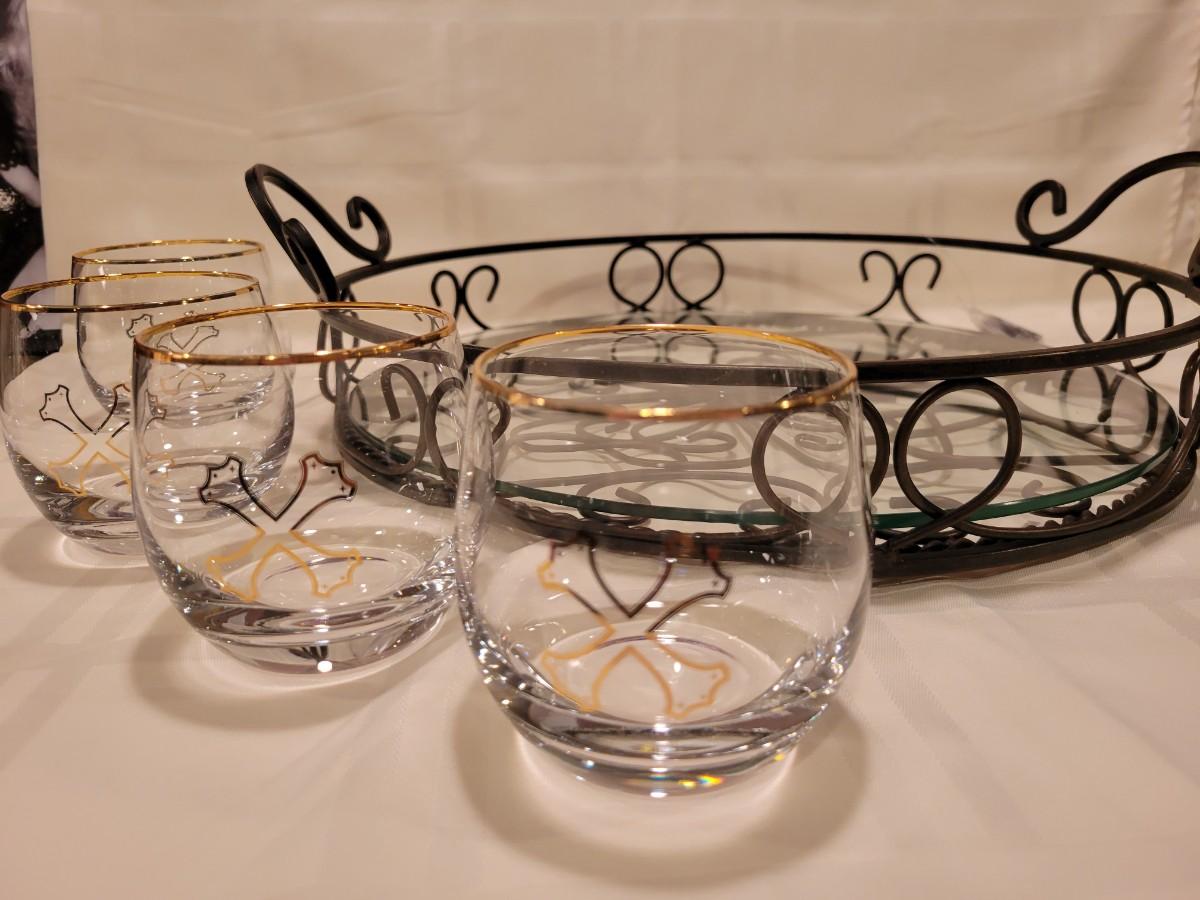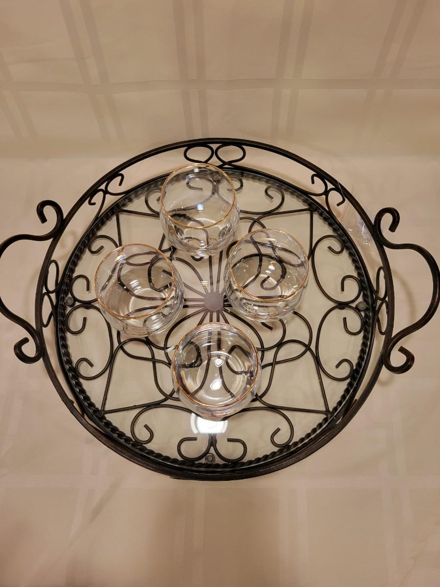 Metal platter with glass bottom. 4 short glasses with gold rims and gold print.