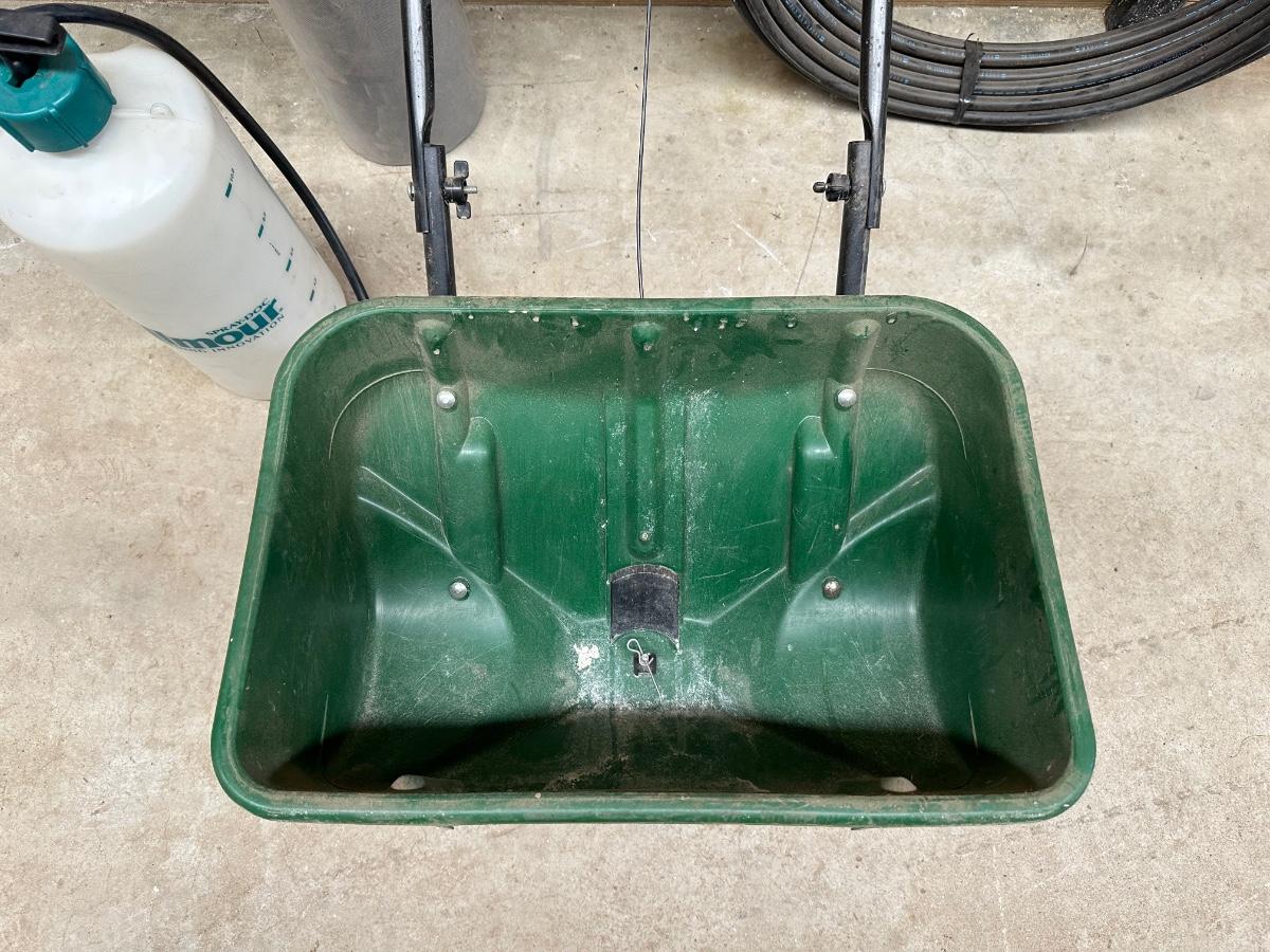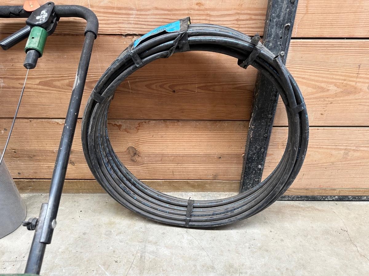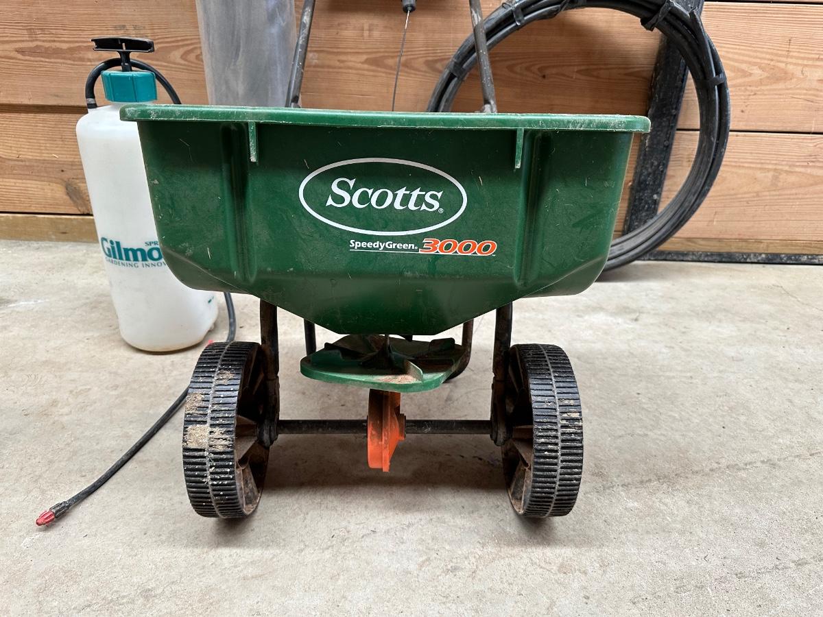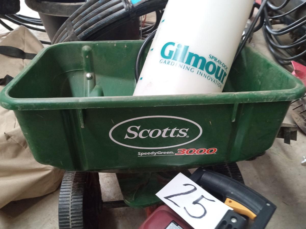 DRIP TUBING, SCOTTS SPREADER AND A WEED SPRAYER