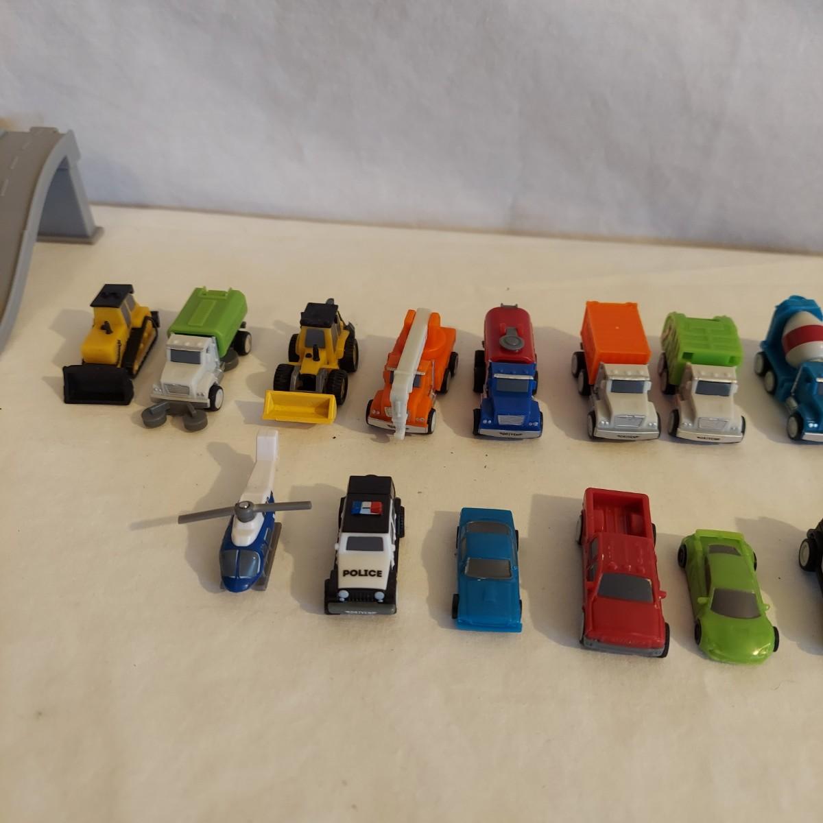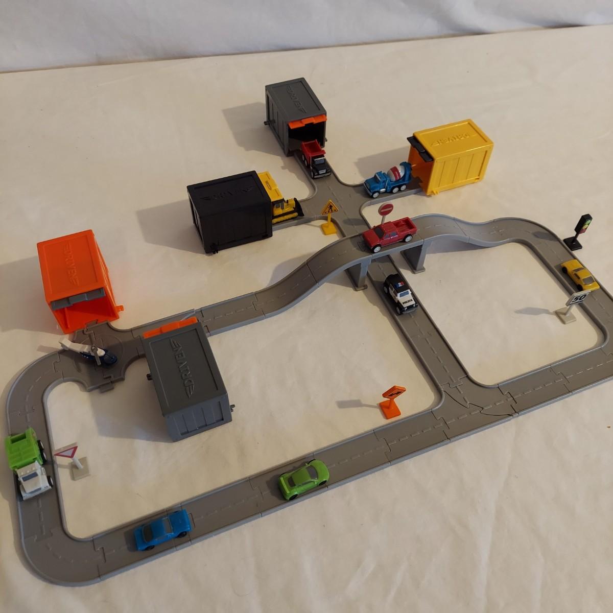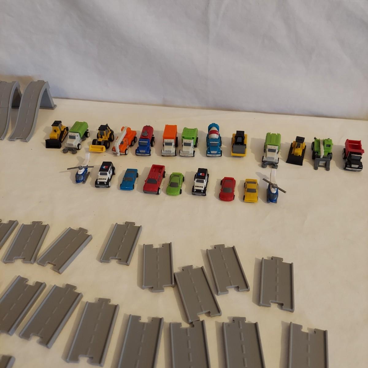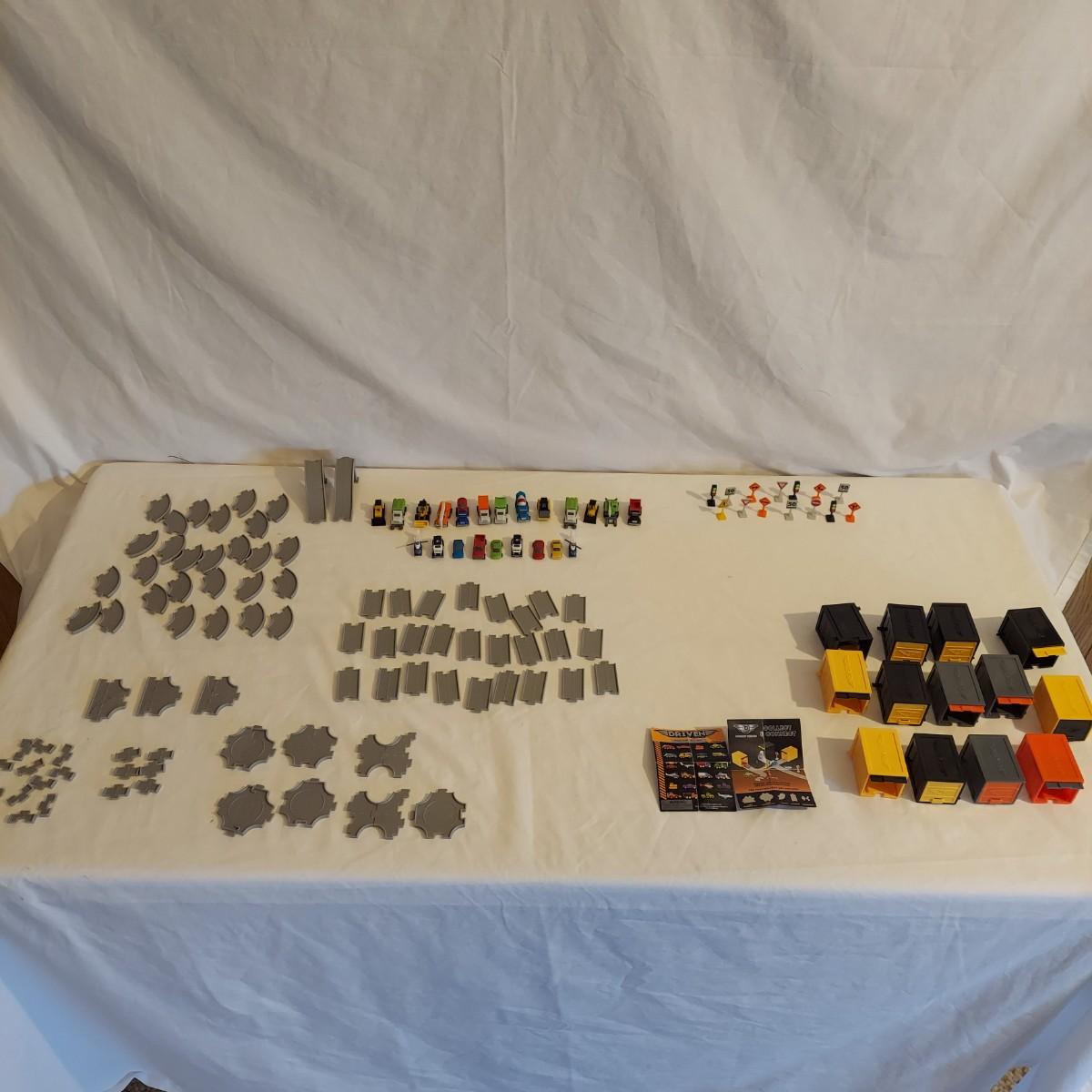 Driven Mini Cars and Roadway Tack. Lot includes 22 plastic mini cars, 14 road signs, 13 garages and 75+ assorted road track pieces. Please see photos for details. Shipping available.
