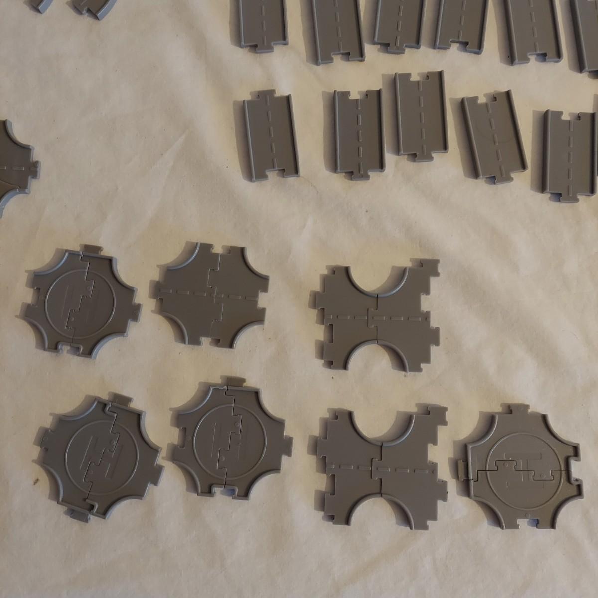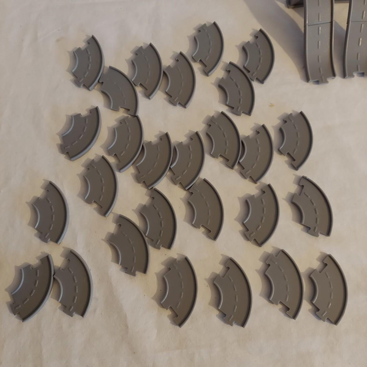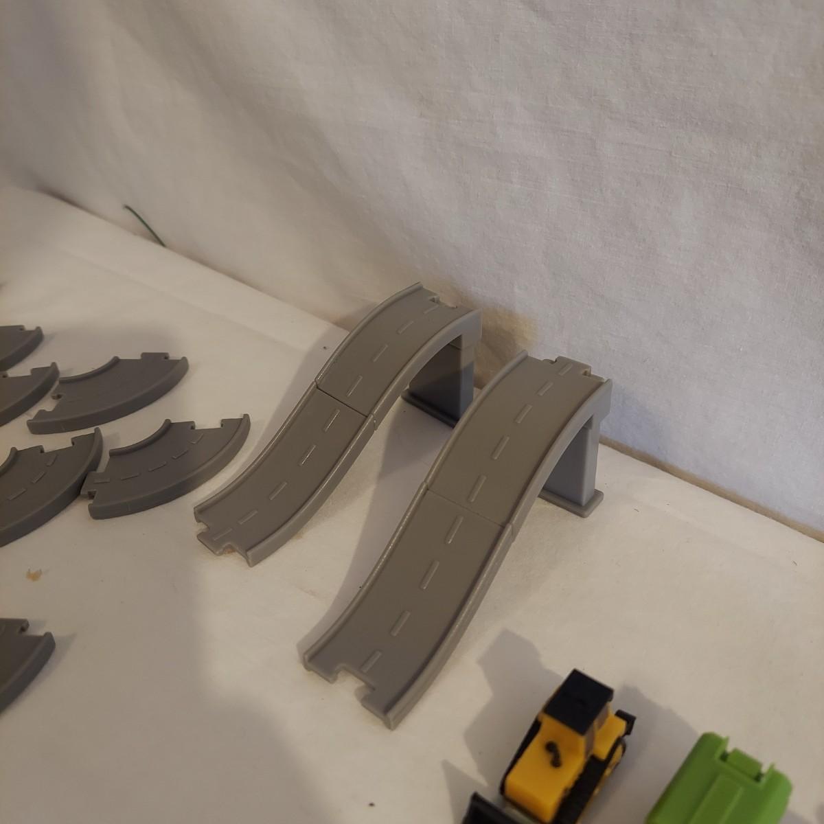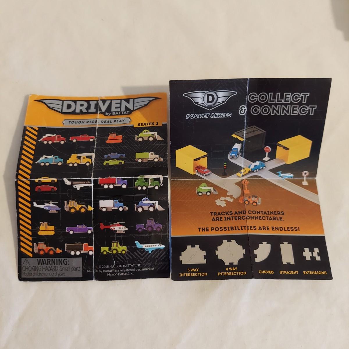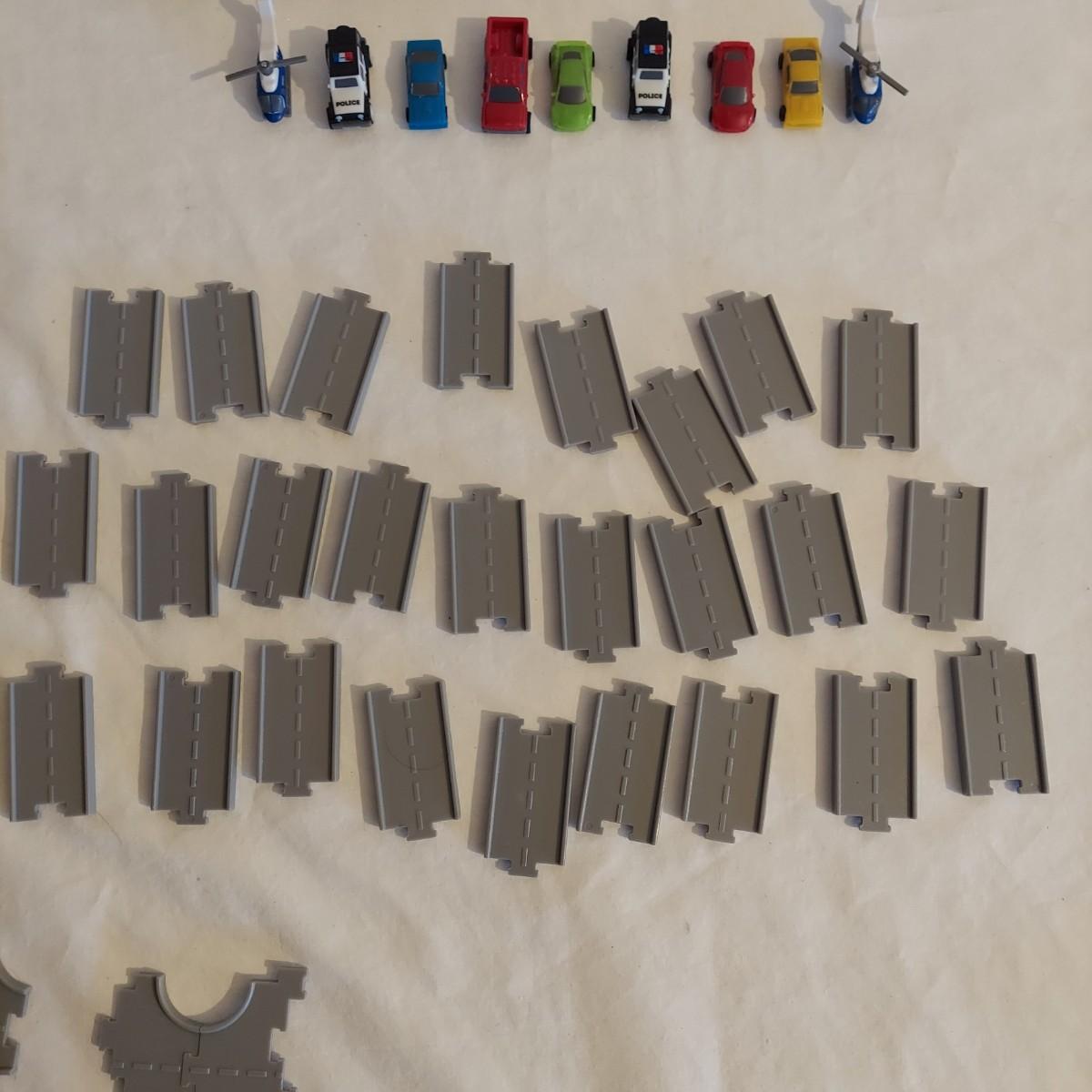 Driven Mini Cars and Roadway Tack. Lot includes 22 plastic mini cars, 14 road signs, 13 garages and 75+ assorted road track pieces. Please see photos for details. Shipping available.