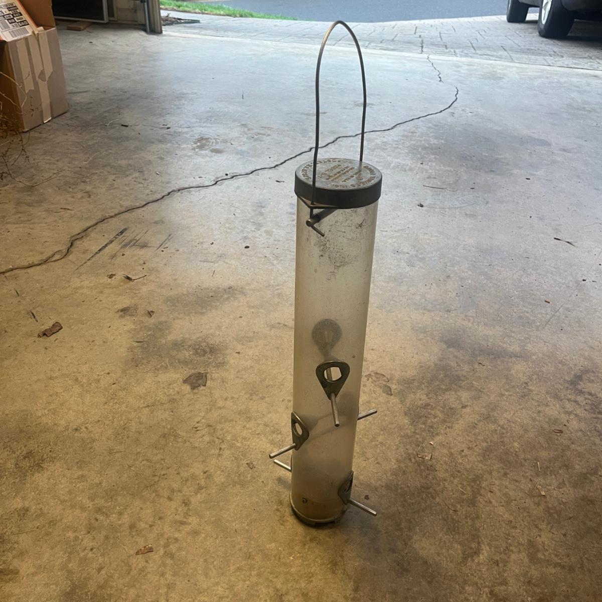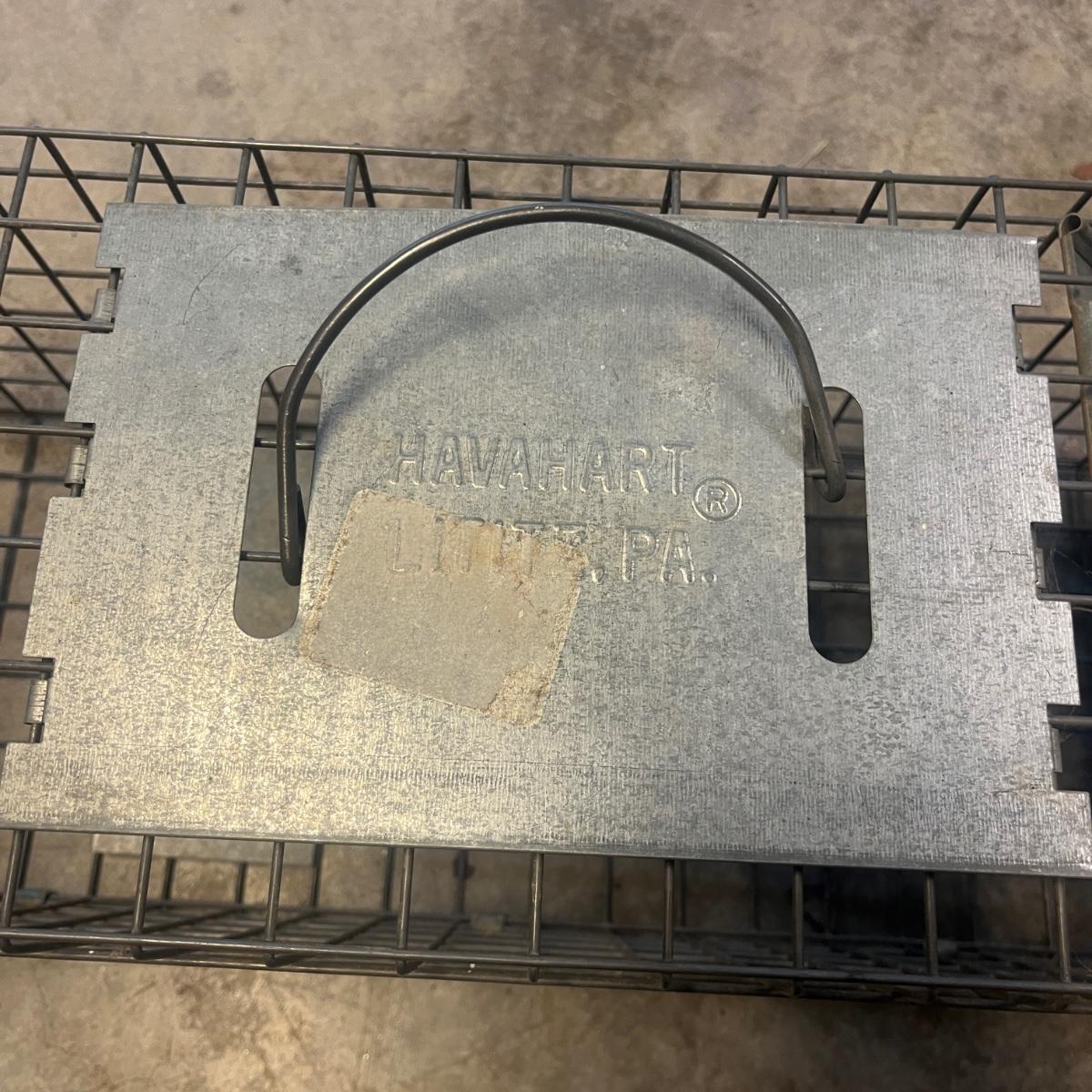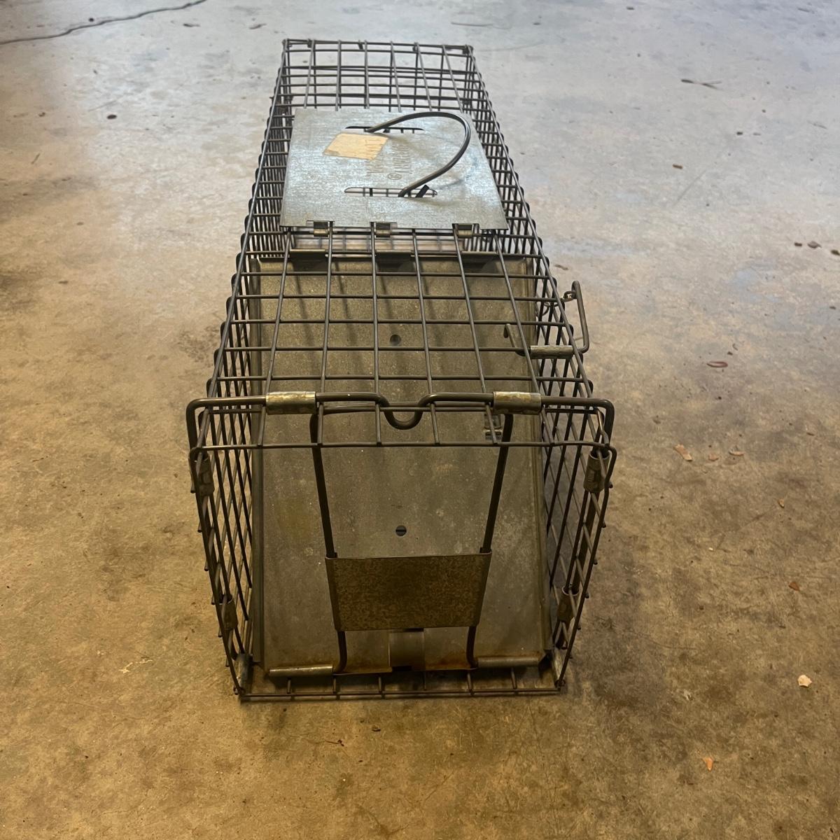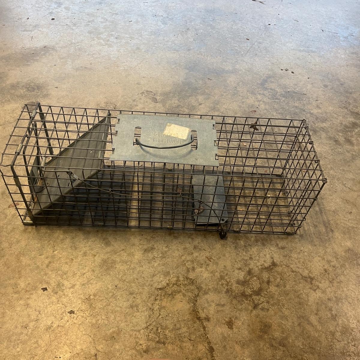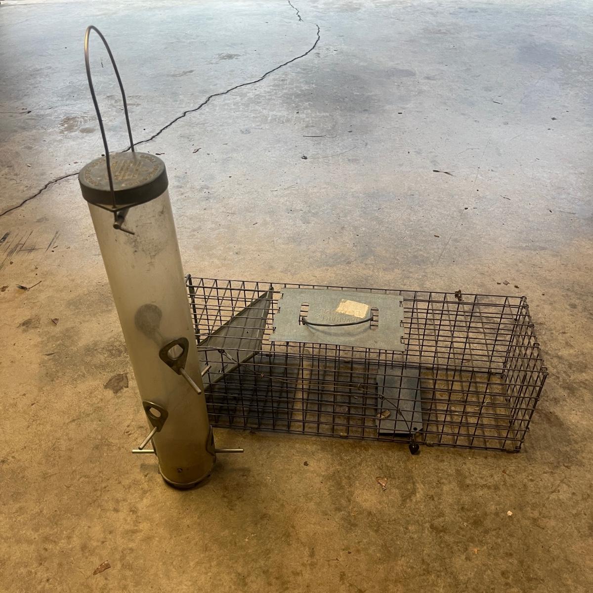 This Havahart brand metal humane animal trap measures 24” x 8” x 8”H. Also includes Droll Yankees brand metal and plastic bird feeder that measures 8” x 8” x 27”H.