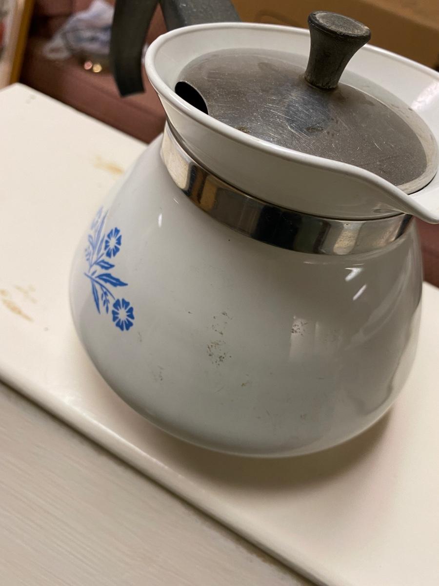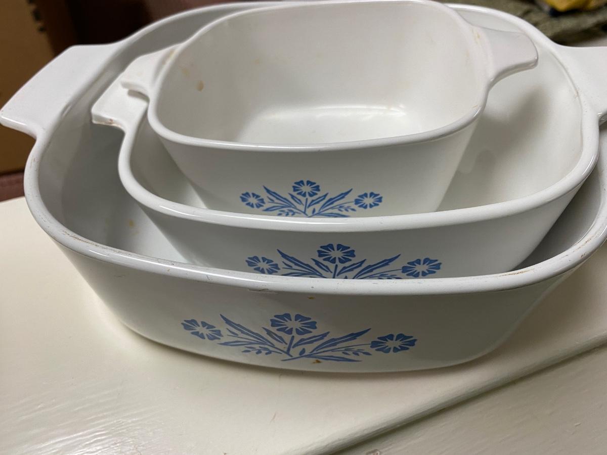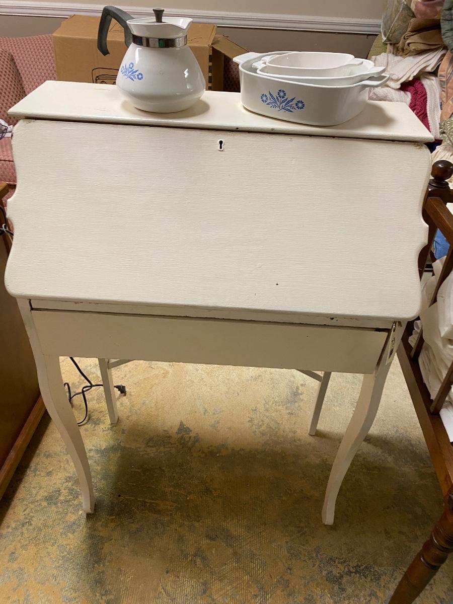 White Drop Front Desk, and Misc Blue Cornflower Corning Ware Lot, Great Paint Project