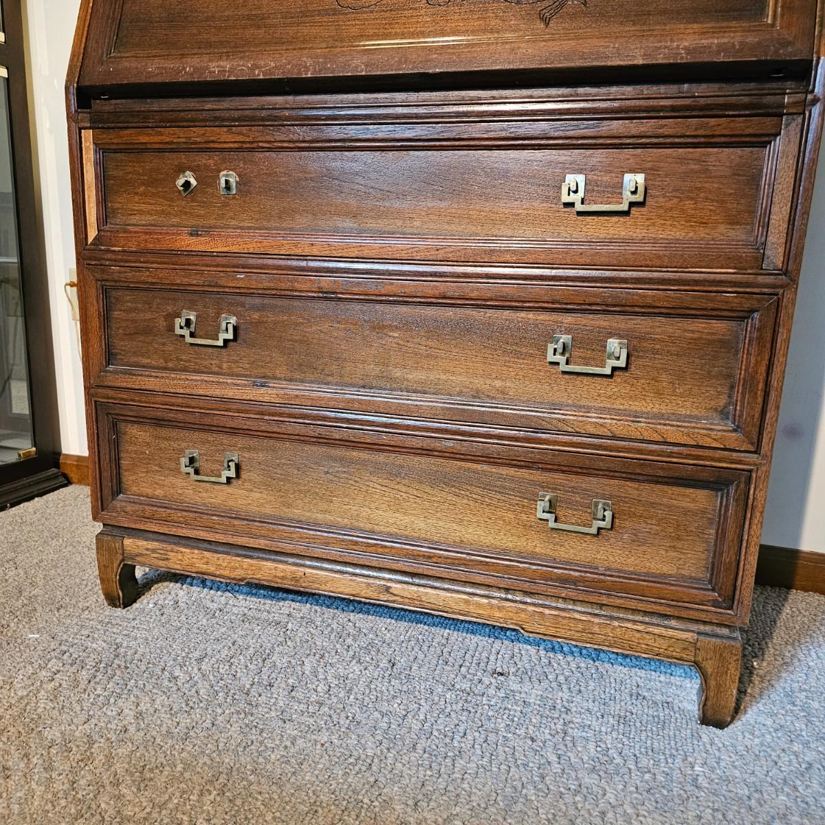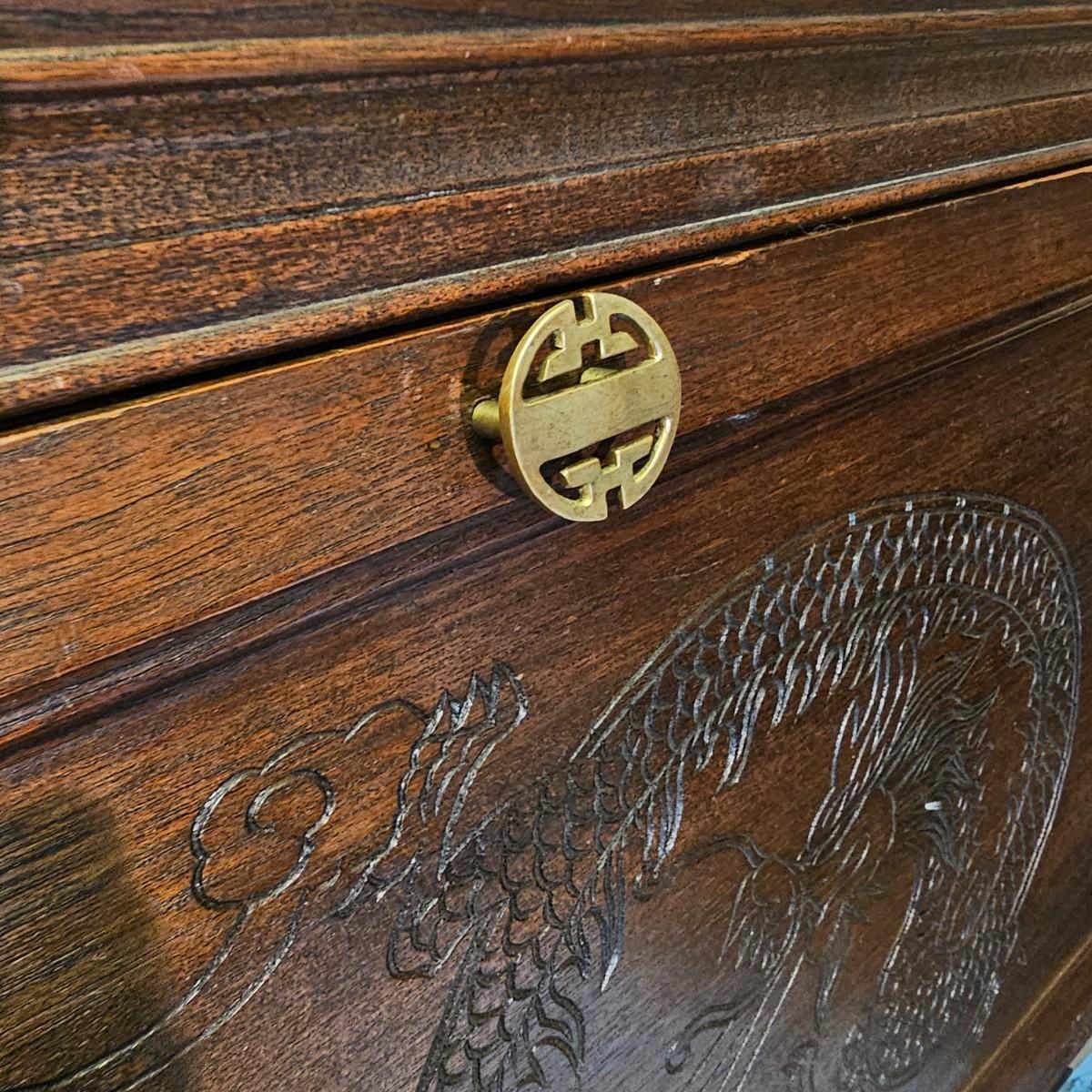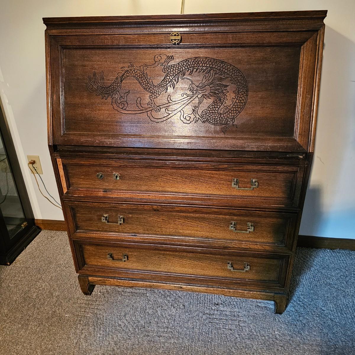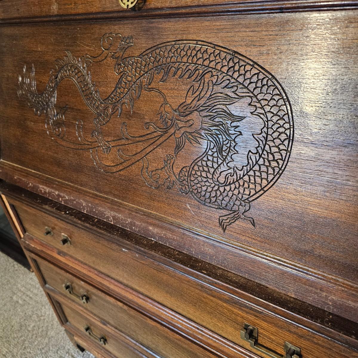 This Asian style desk has a dragon engraved on the drop front, by Vincent Yeh & Co. of Taiwan. It features three pullout drawers, an engraved drop front, with small cubbies and storage inside the top. Desk measures 36" x 18" 45"H. Missing one drop front support on left side, one drawer handle top left, and has numerous scratches and blemishes. See photos for details.