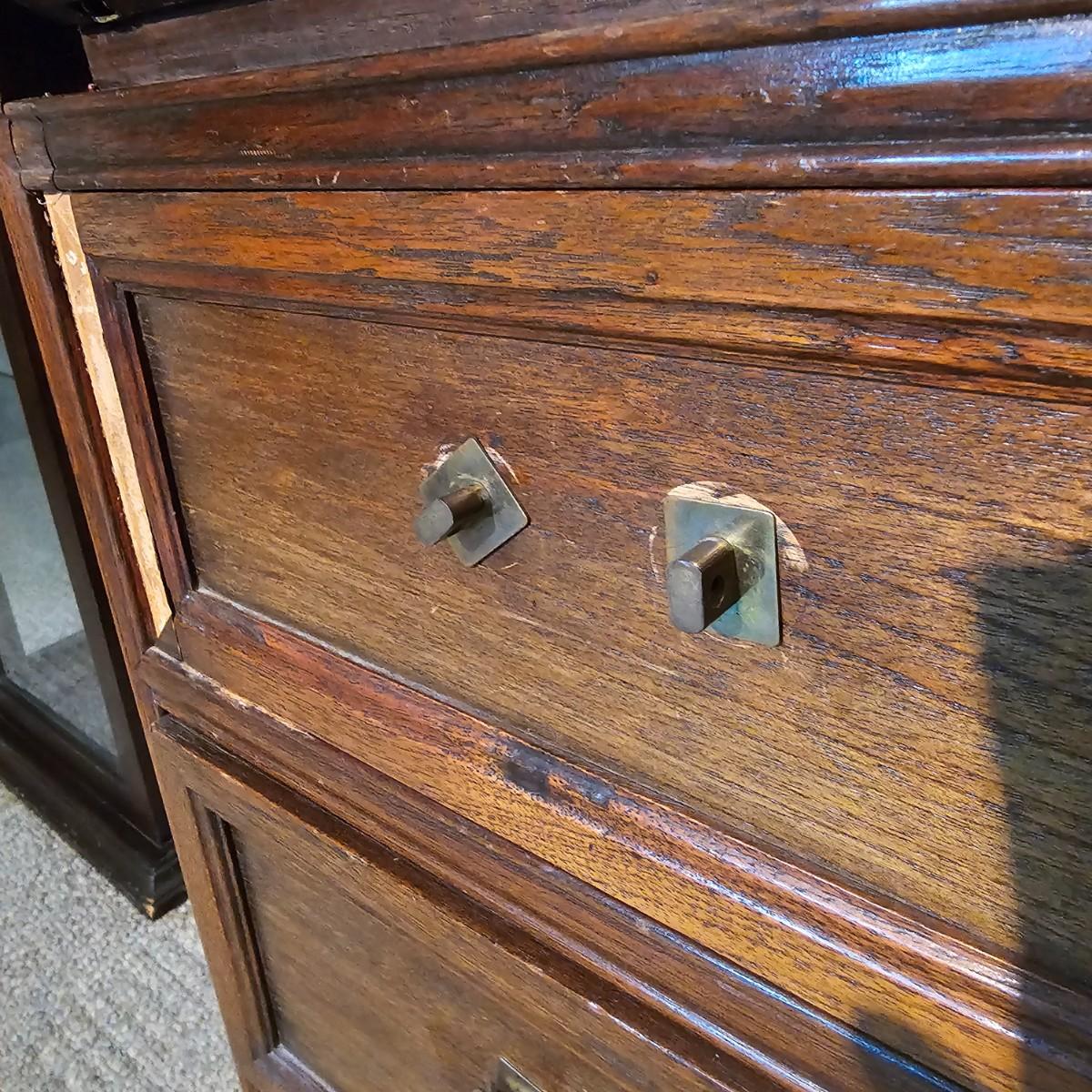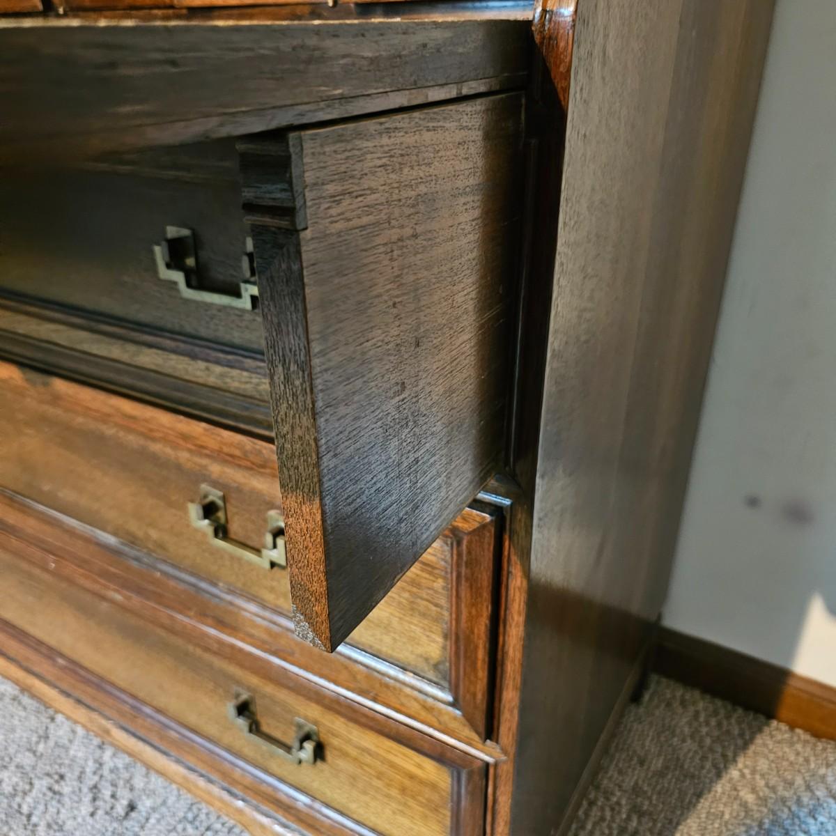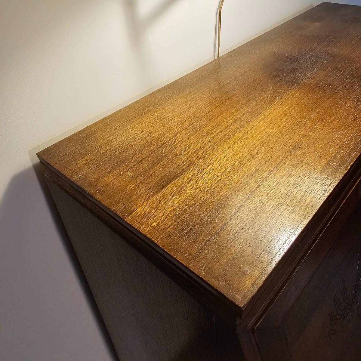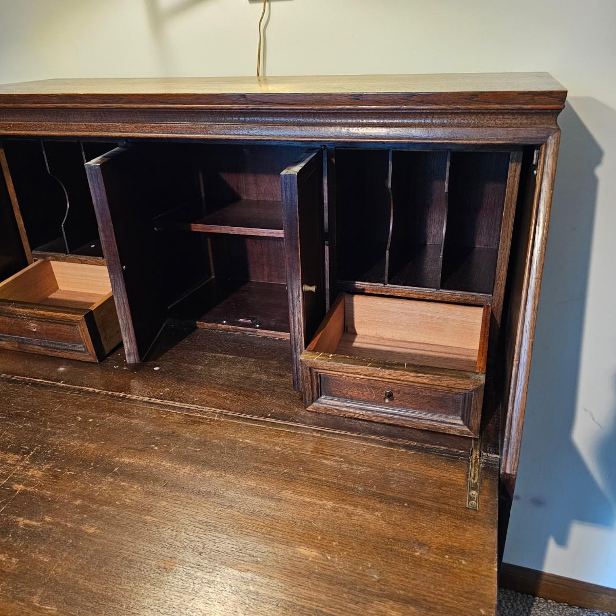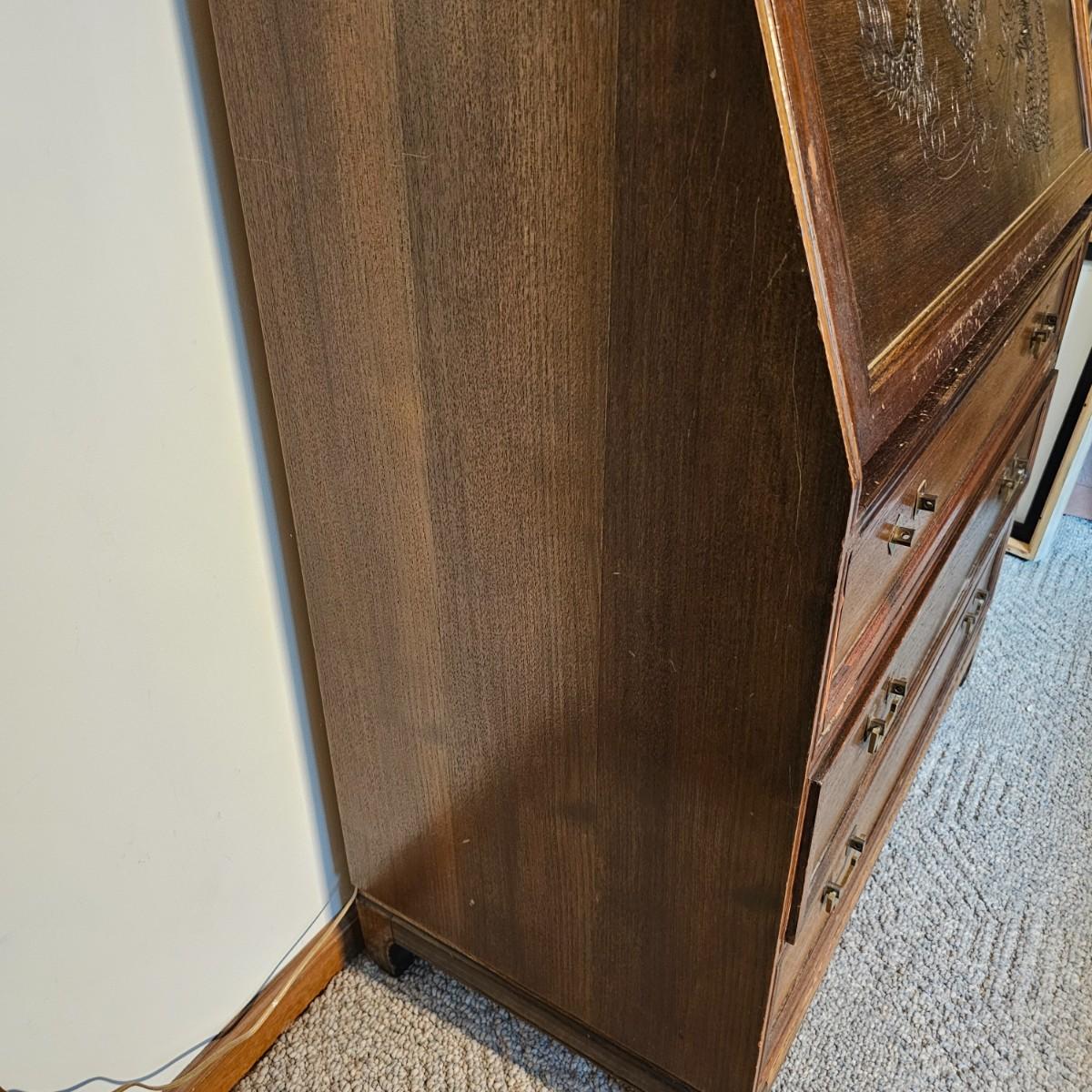 This Asian style desk has a dragon engraved on the drop front, by Vincent Yeh & Co. of Taiwan. It features three pullout drawers, an engraved drop front, with small cubbies and storage inside the top. Desk measures 36" x 18" 45"H. Missing one drop front support on left side, one drawer handle top left, and has numerous scratches and blemishes. See photos for details.