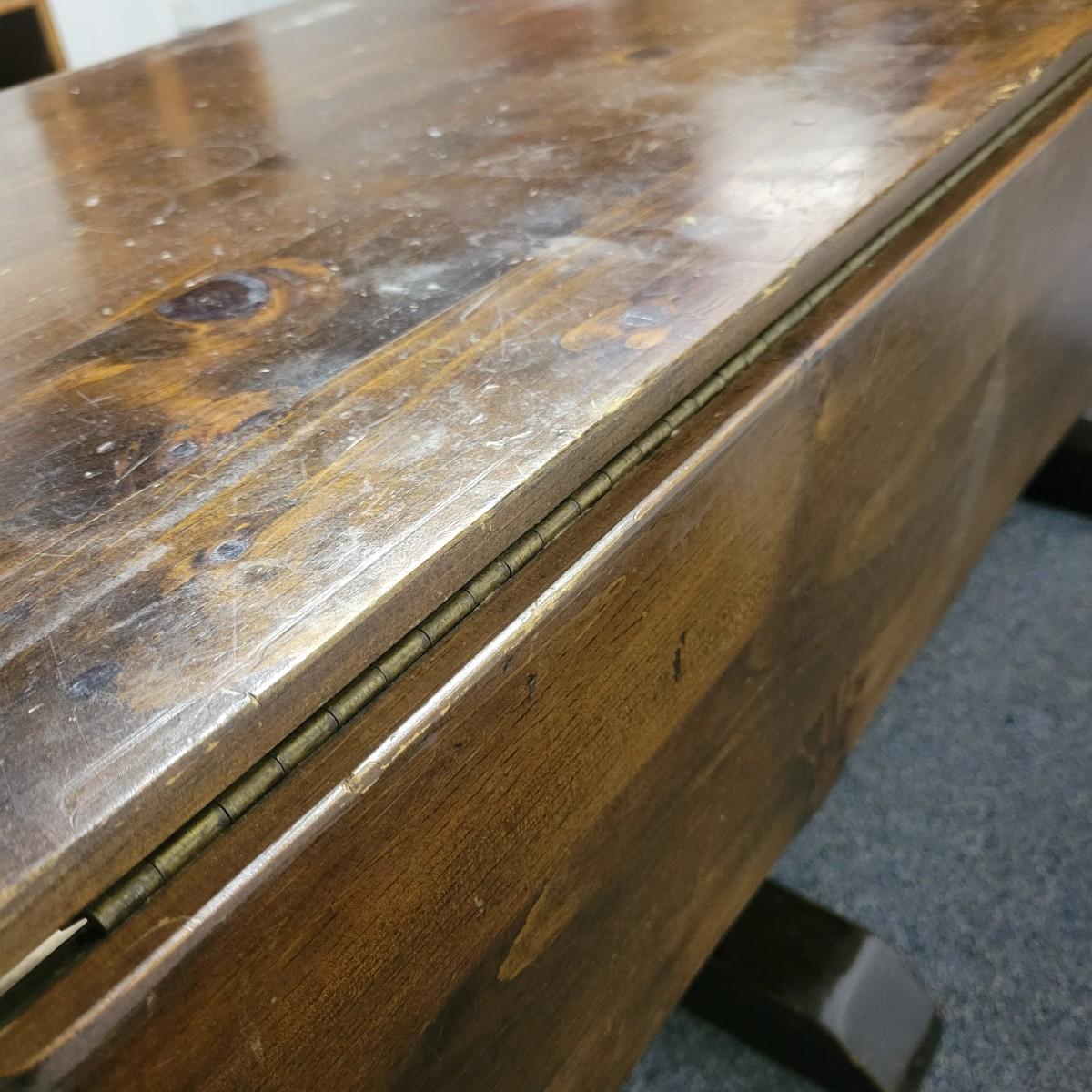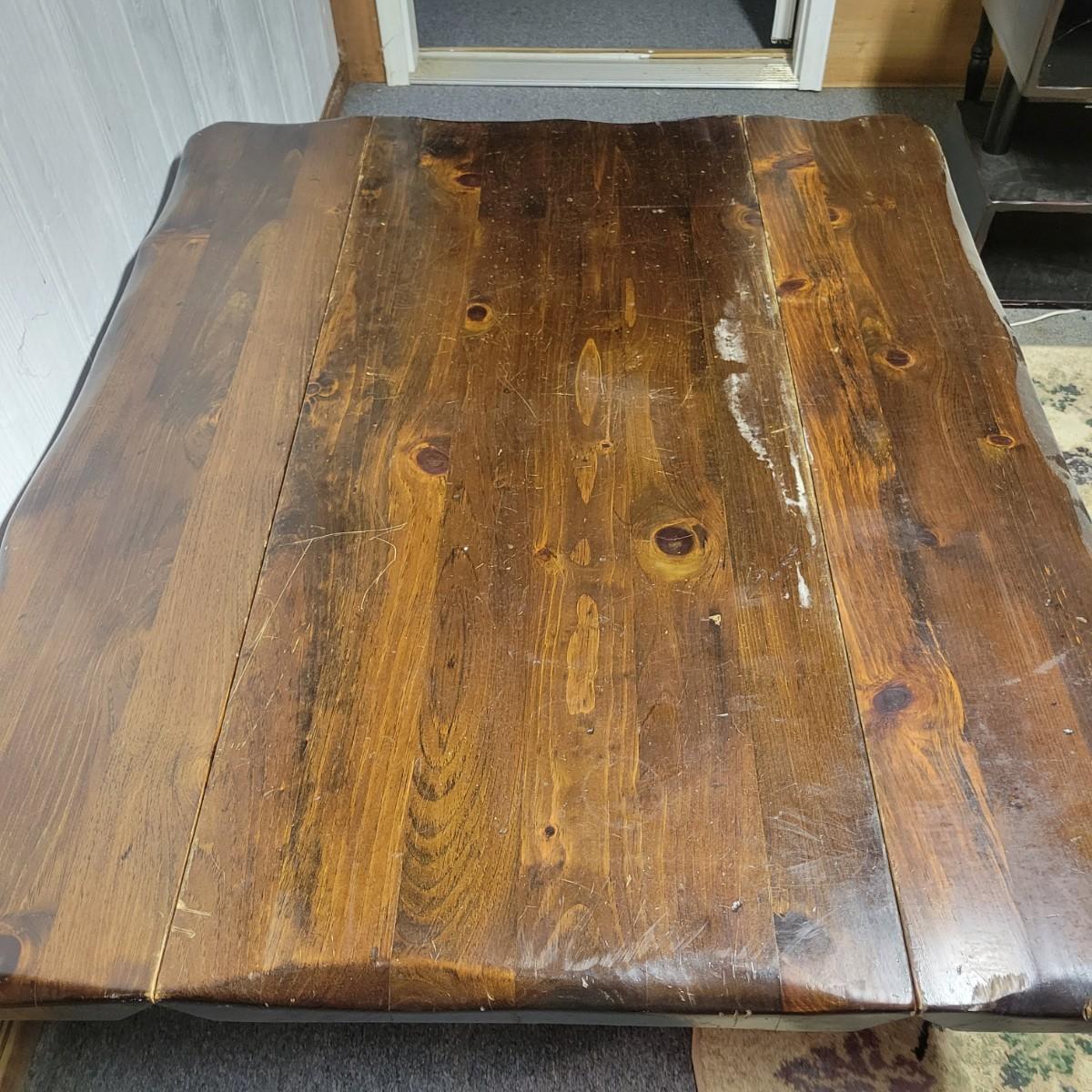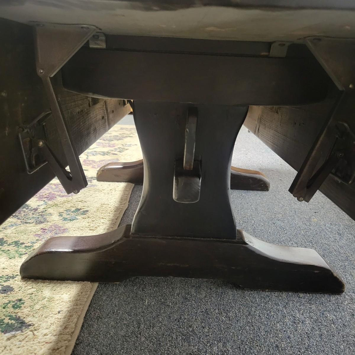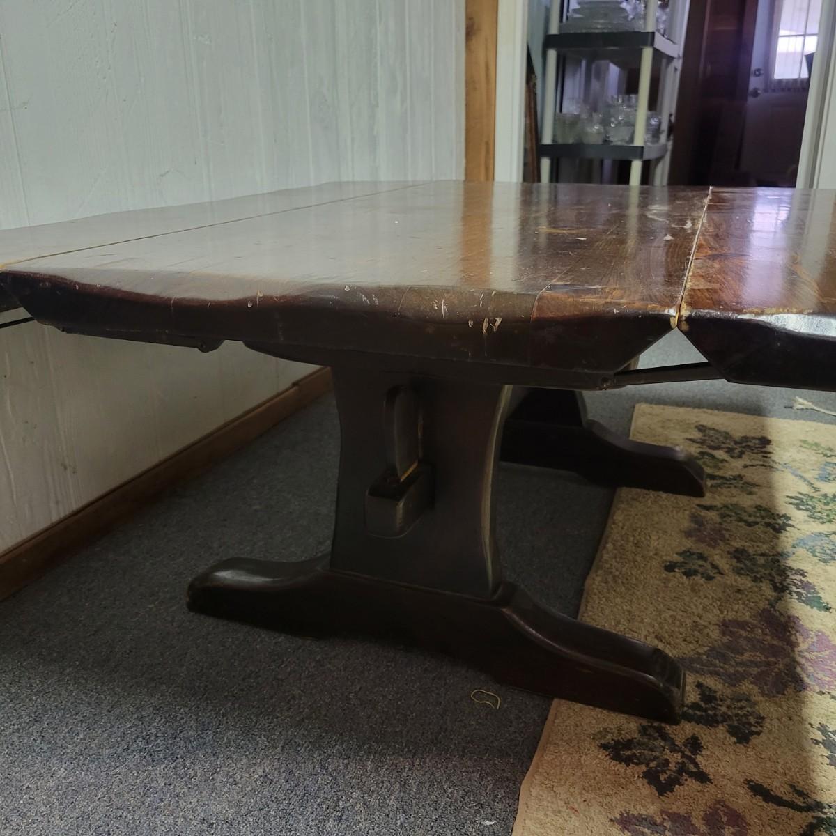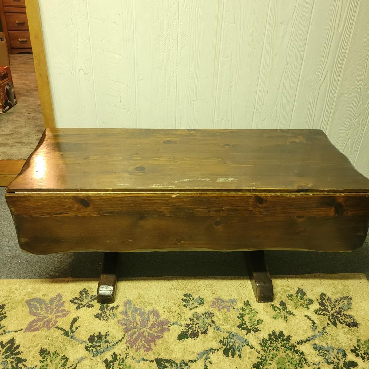 A solid wood drop leaf coffee table in fair condition. There are some notable scratches and blemishes, but this table could be easily refurbished to bring it new life. The table features a 2" slab for the table top and locking, spring loaded steel arms to support the leafs. Table measures approximately 40" x 48" x 19" with the leafs open. Local pickup only
