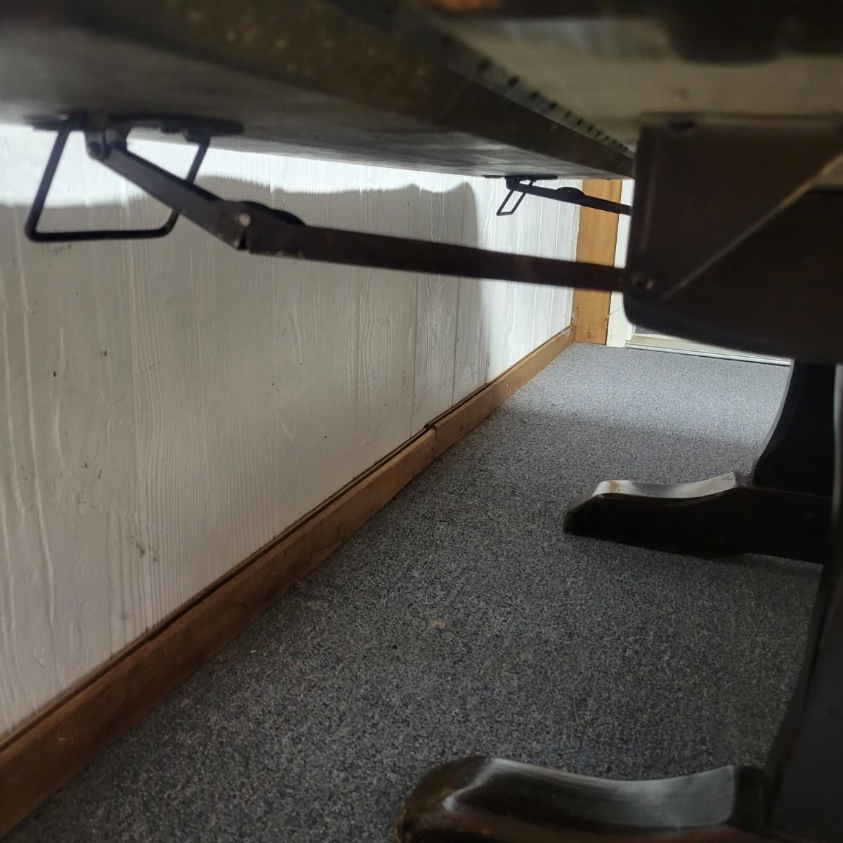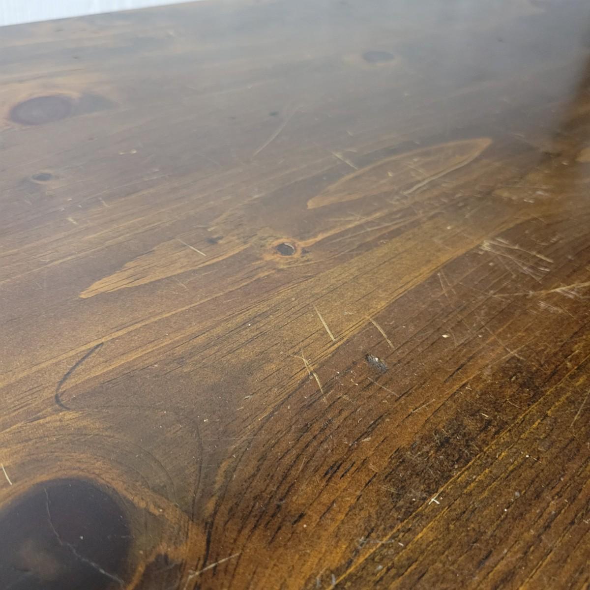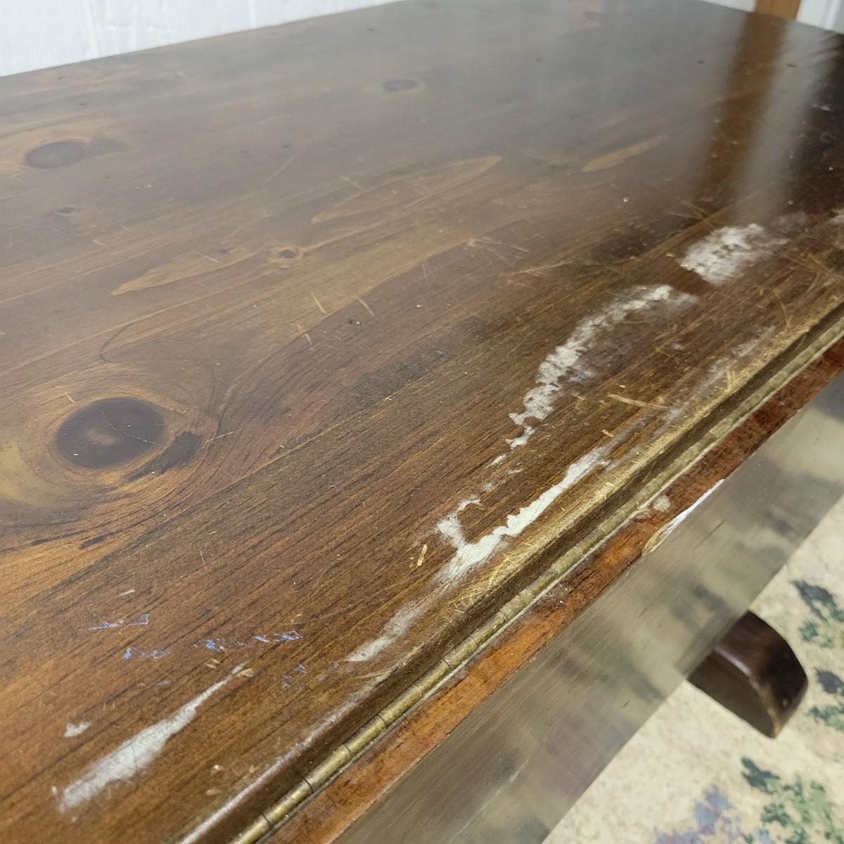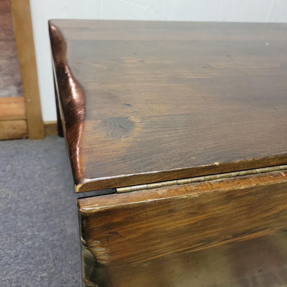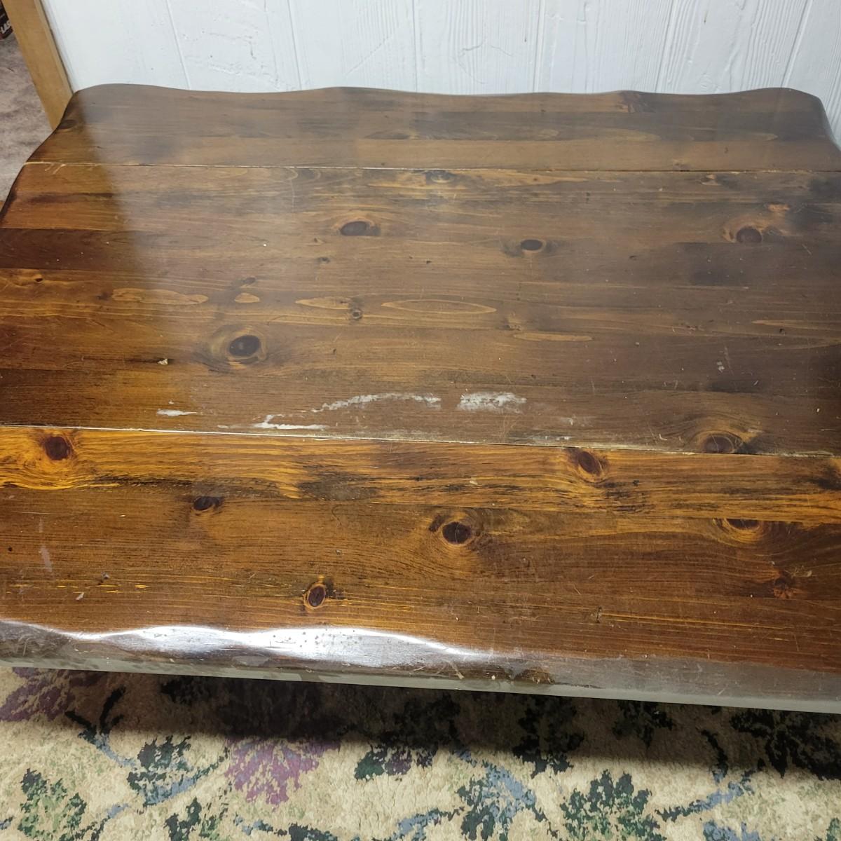 A solid wood drop leaf coffee table in fair condition. There are some notable scratches and blemishes, but this table could be easily refurbished to bring it new life. The table features a 2" slab for the table top and locking, spring loaded steel arms to support the leafs. Table measures approximately 40" x 48" x 19" with the leafs open. Local pickup only