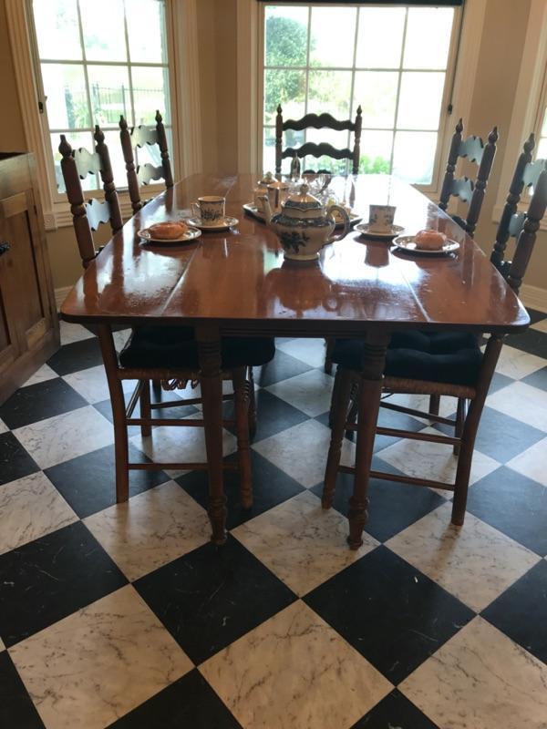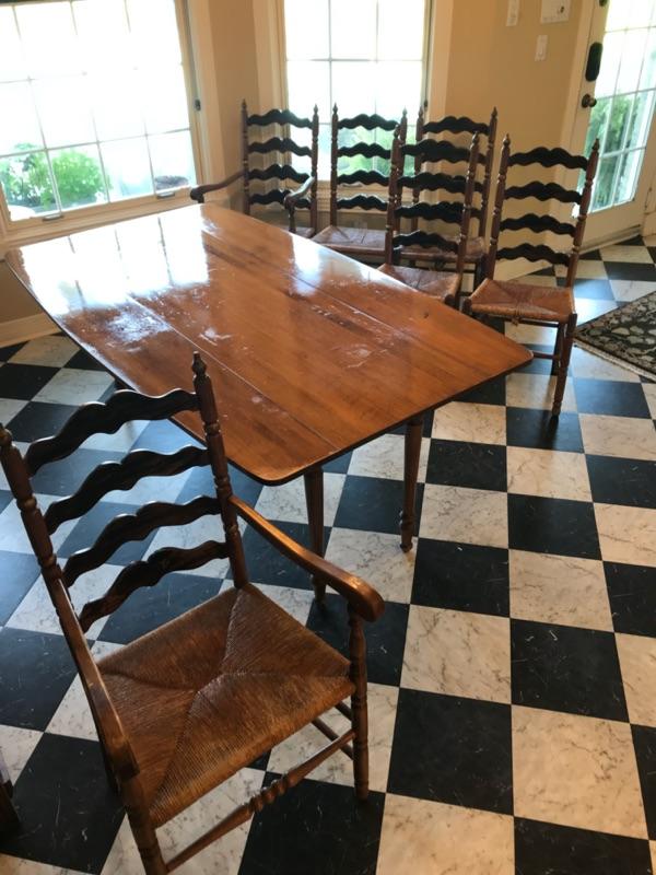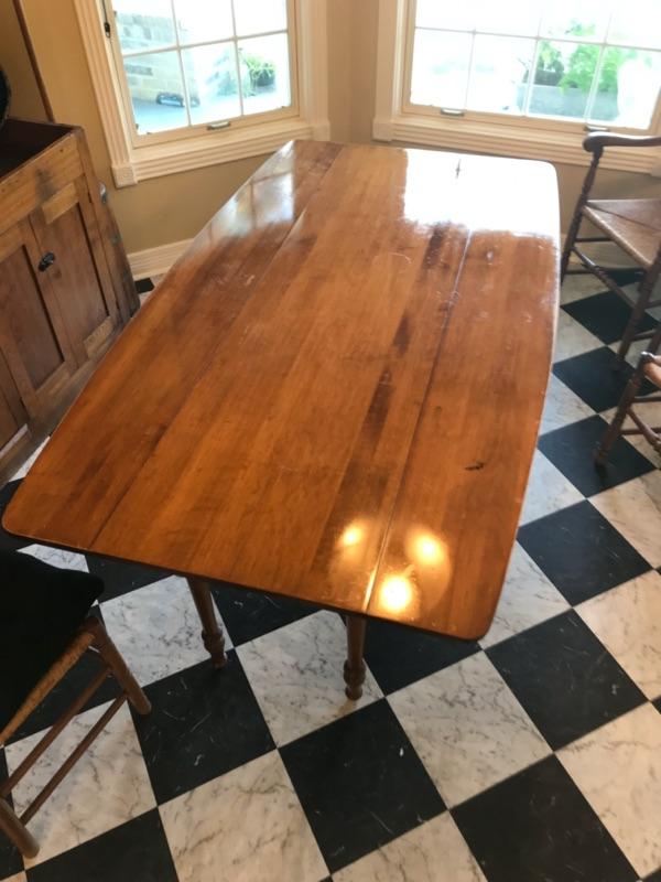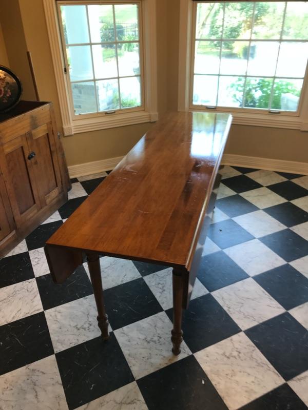 Many a great family meal was had at this table. This table is so versible, you can use it behind a couch, in a hallway, or as shown as a kitchen table.