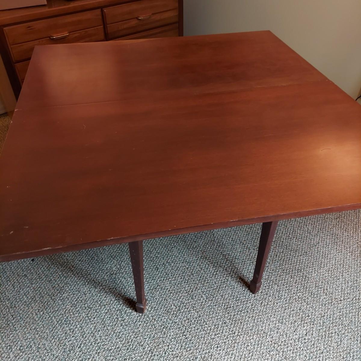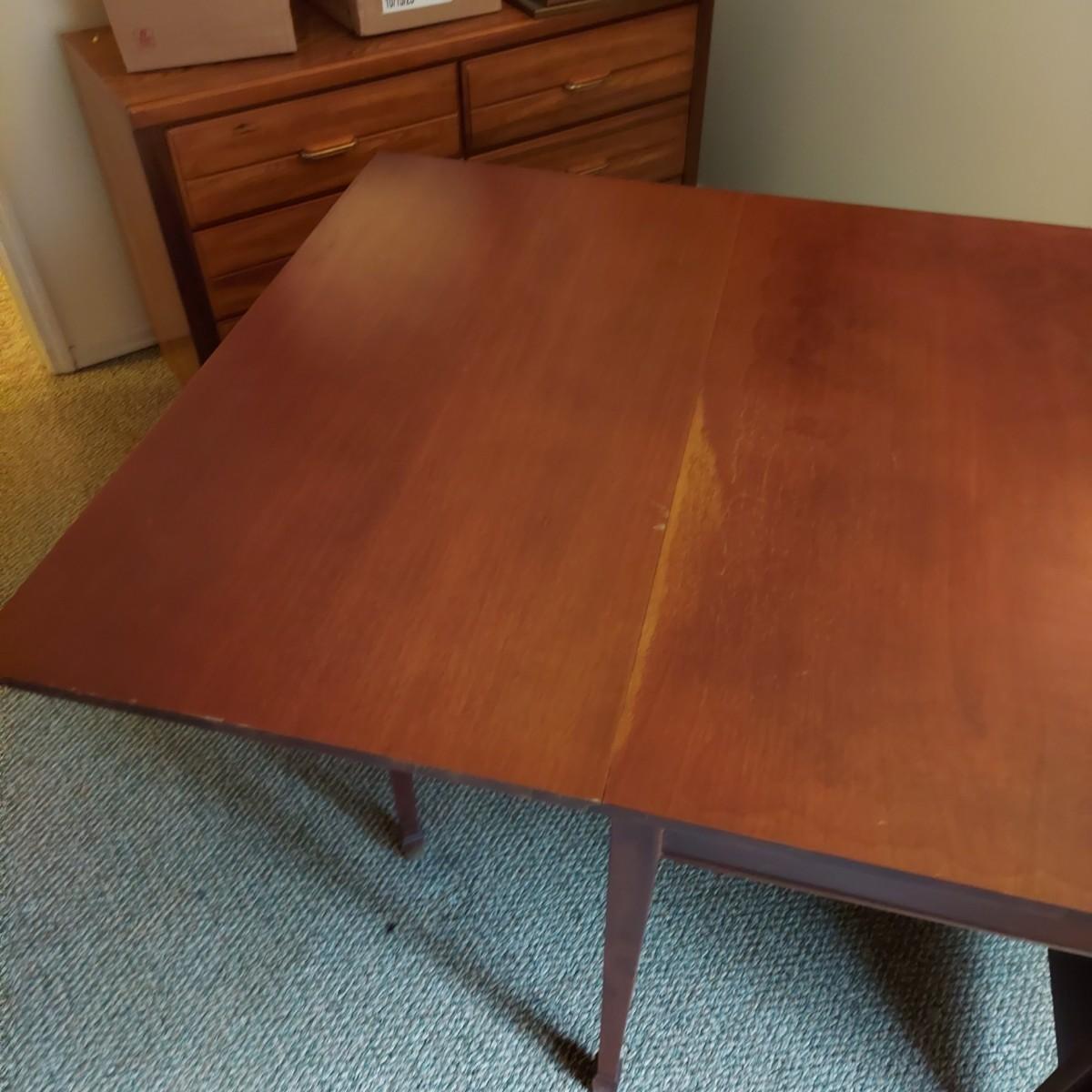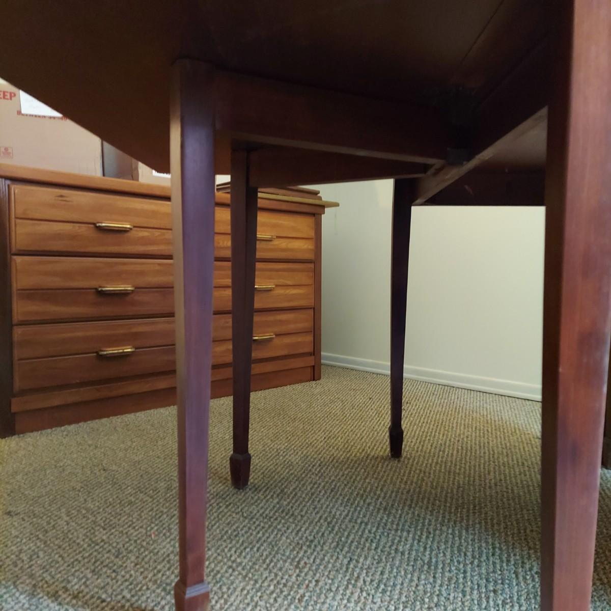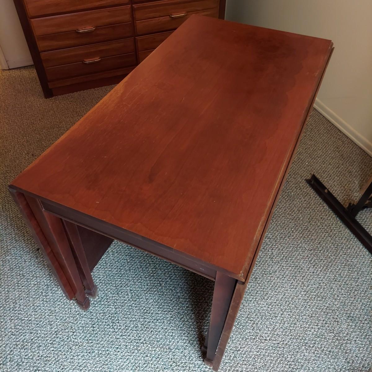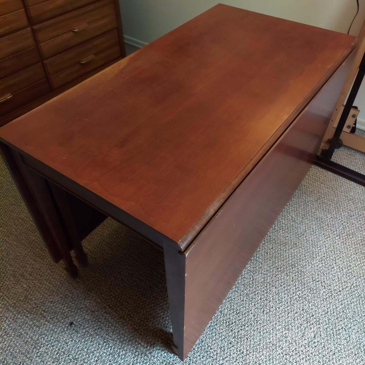 Vintage solid wood dining table with drop leaves on both sides. Has a medium stain finish. Some cosmetic condition issues. See photos. When set up it measures 71" x 44" x 30"H. With leaves dropped it measures 25" x 44" x 30"H. Local Pickup Only. Winning bidder must bring assistance to help move and load this item due to its weight and/or size.