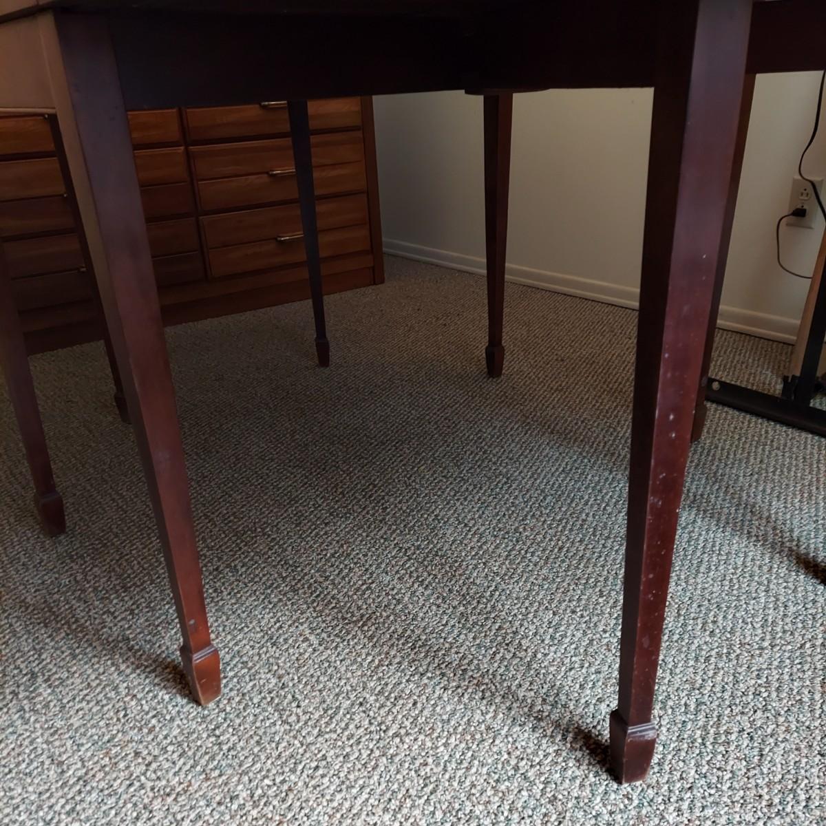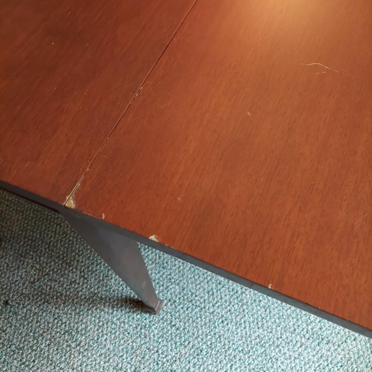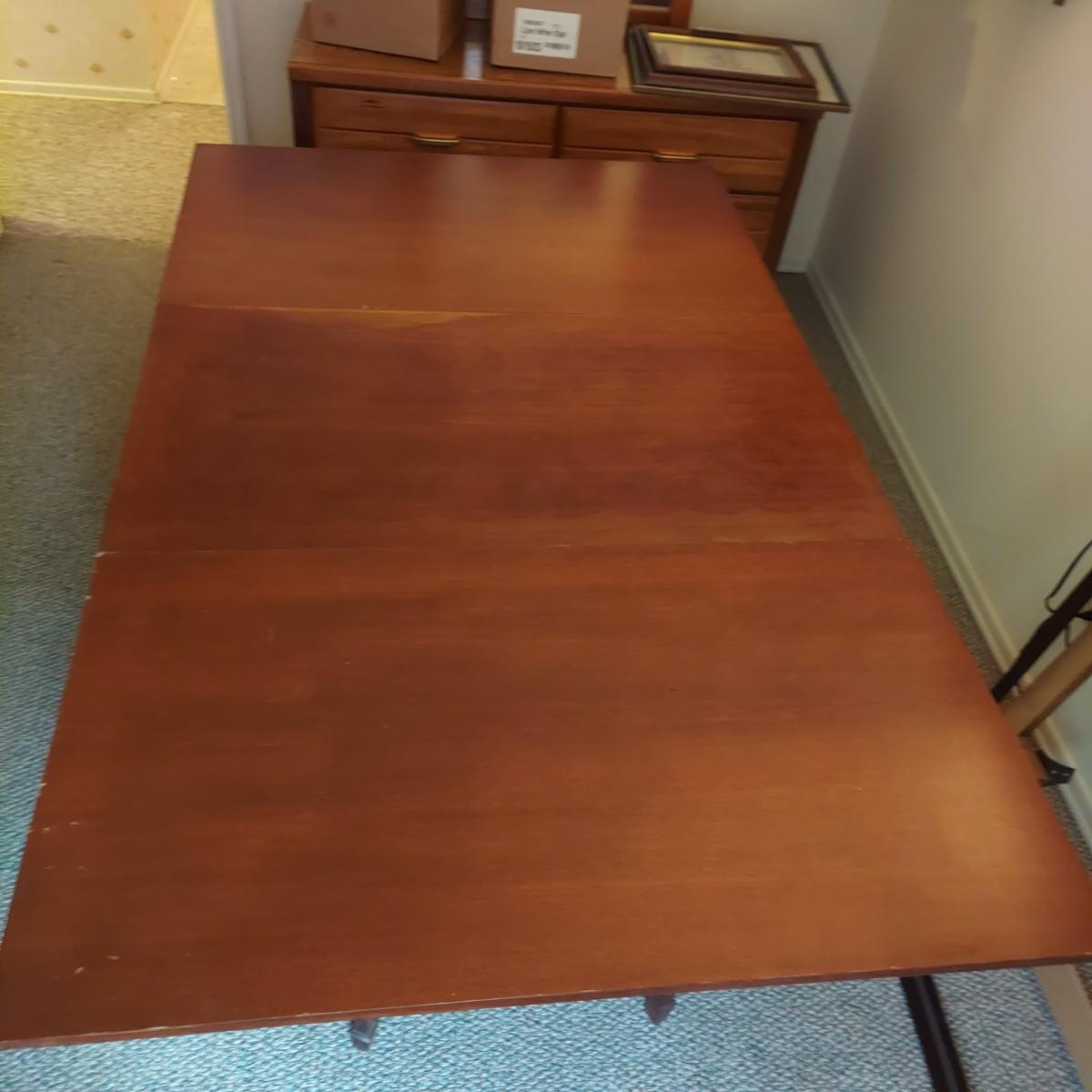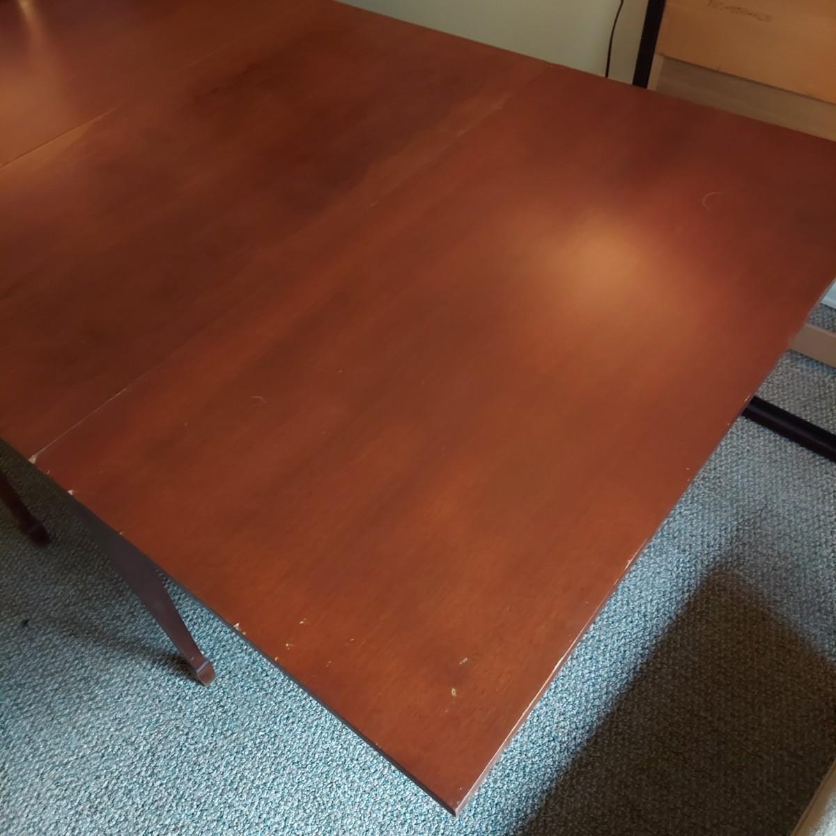 Vintage solid wood dining table with drop leaves on both sides. Has a medium stain finish. Some cosmetic condition issues. See photos. When set up it measures 71" x 44" x 30"H. With leaves dropped it measures 25" x 44" x 30"H. Local Pickup Only. Winning bidder must bring assistance to help move and load this item due to its weight and/or size.