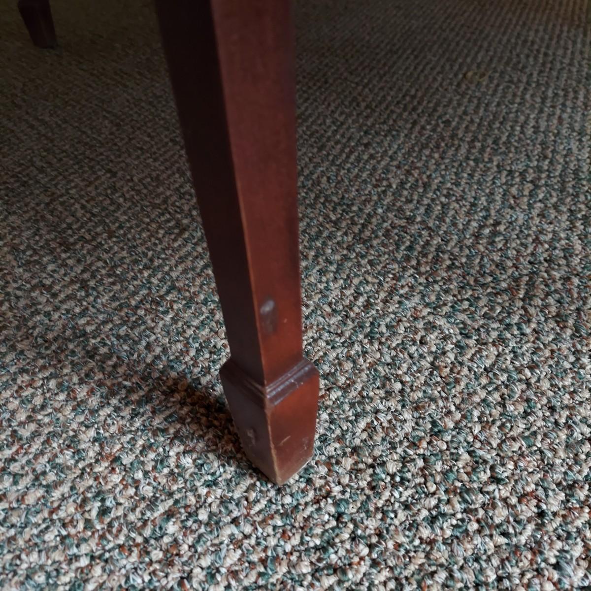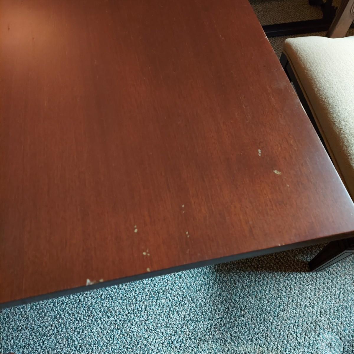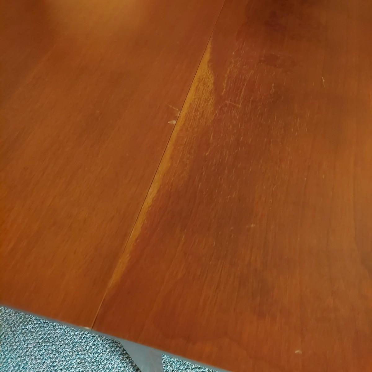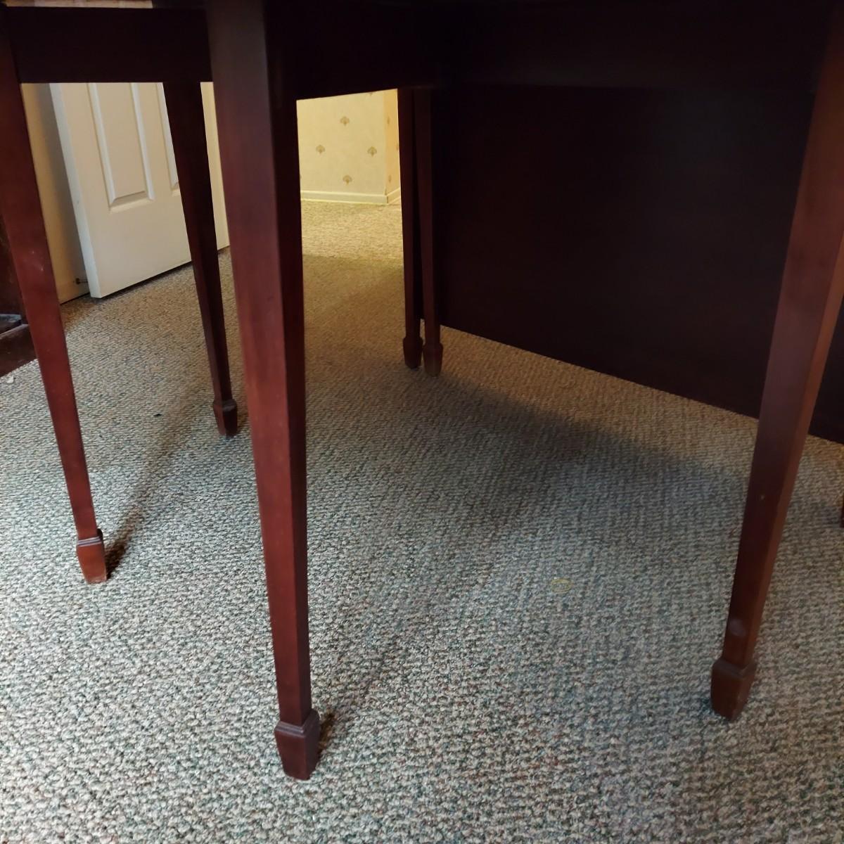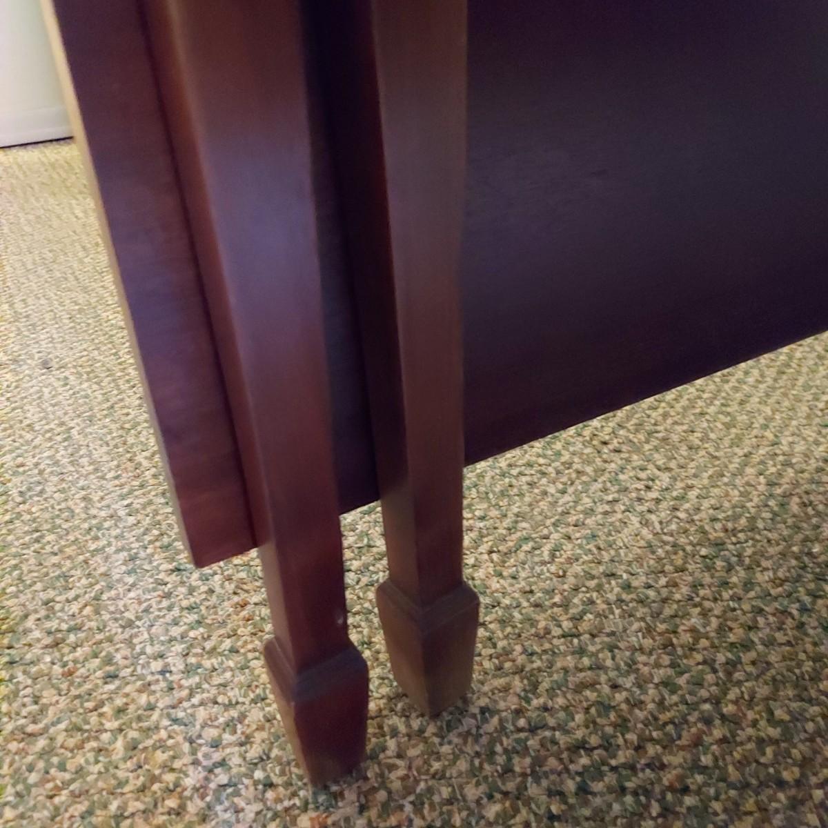 Vintage solid wood dining table with drop leaves on both sides. Has a medium stain finish. Some cosmetic condition issues. See photos. When set up it measures 71" x 44" x 30"H. With leaves dropped it measures 25" x 44" x 30"H. Local Pickup Only. Winning bidder must bring assistance to help move and load this item due to its weight and/or size.