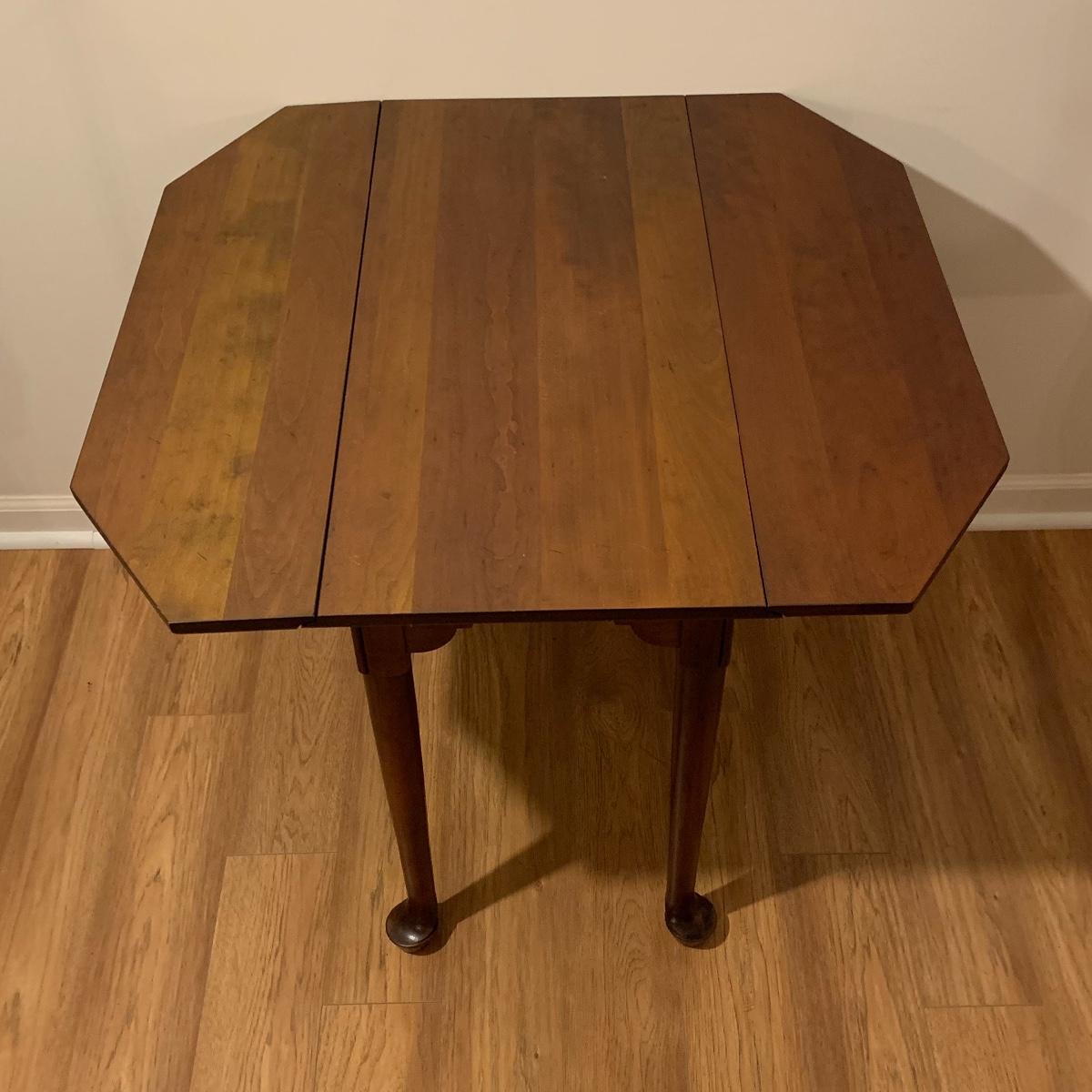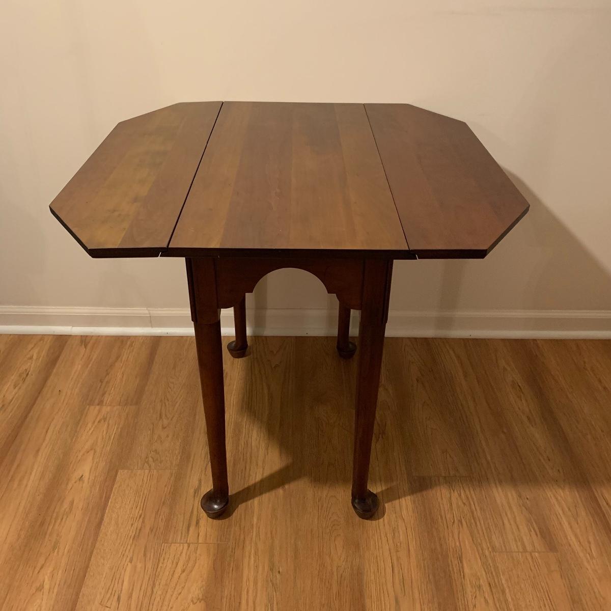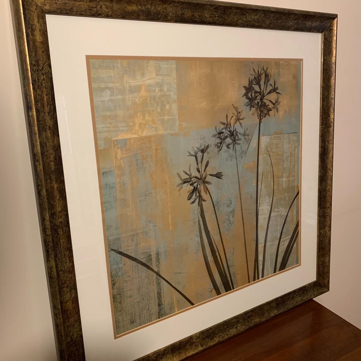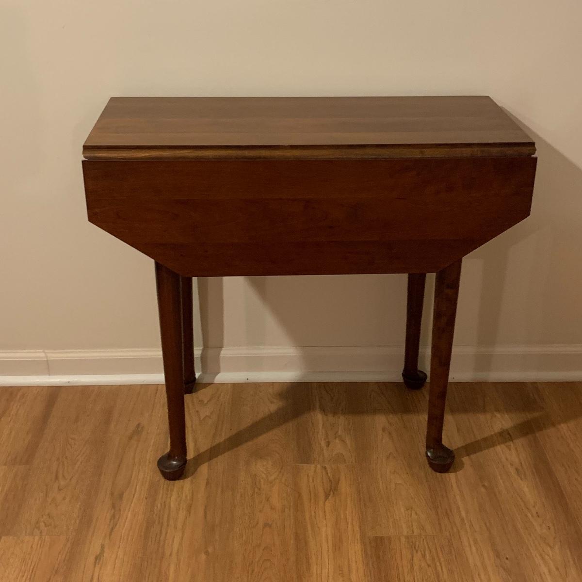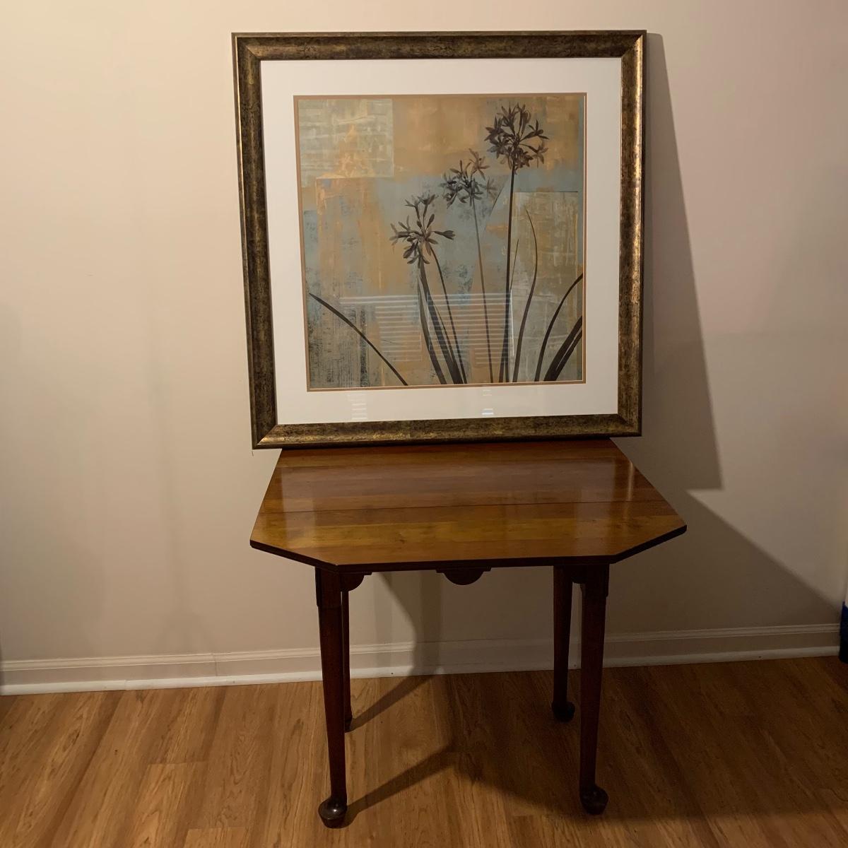 This lot includes one table and one framed print. The table is a wooden drop leaf side table. With the leaves up, it is octagonal and the table top measures 28.75” x 28.5”. The leaves are easily adjustable and have a sliding wooden support to keep them up. With the leaves down the tabletop measures 28.5” x 12.5”. The table is 26” tall. It is in used, but sturdy condition. A few small nicks are found on the surface, but otherwise it is in good condition cosmetically. The framed print has an antiqued gold leaf color on the frame. The frame feels to be made of plastic. It is double matted. There are rings attached to the backing for hanging. It appears to be in very good condition. The frame measures 33.75” x 33.75”. Local Pickup Only
