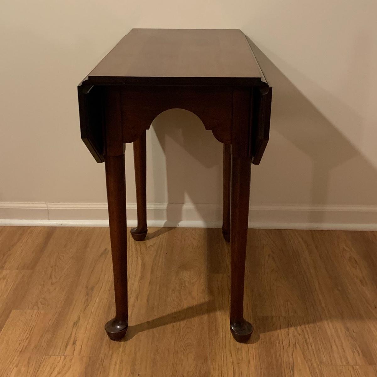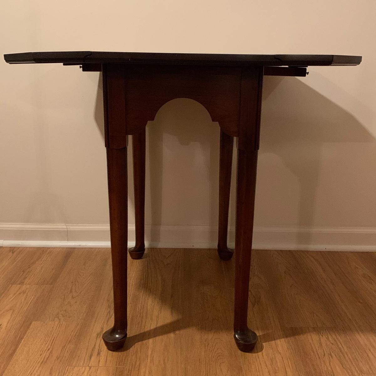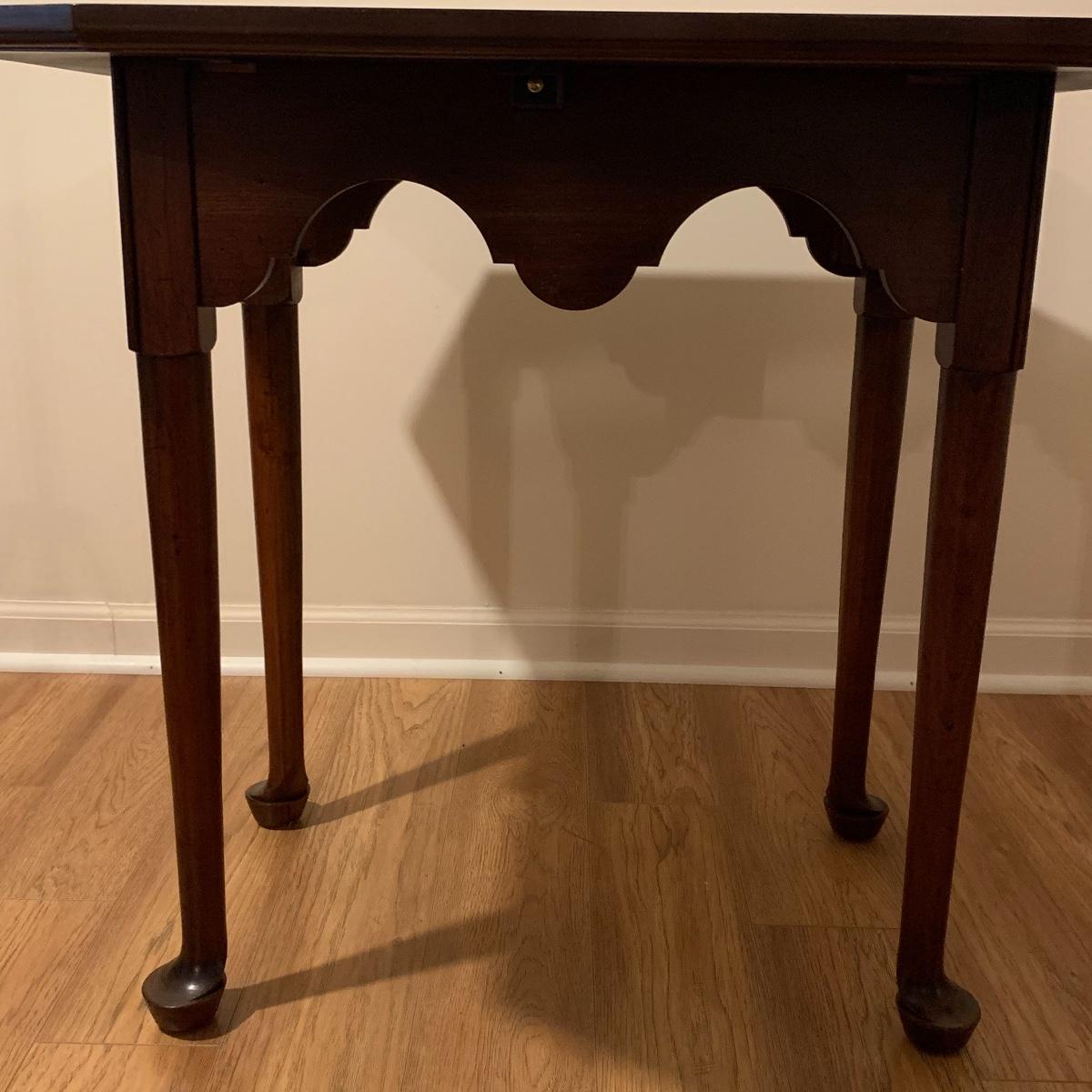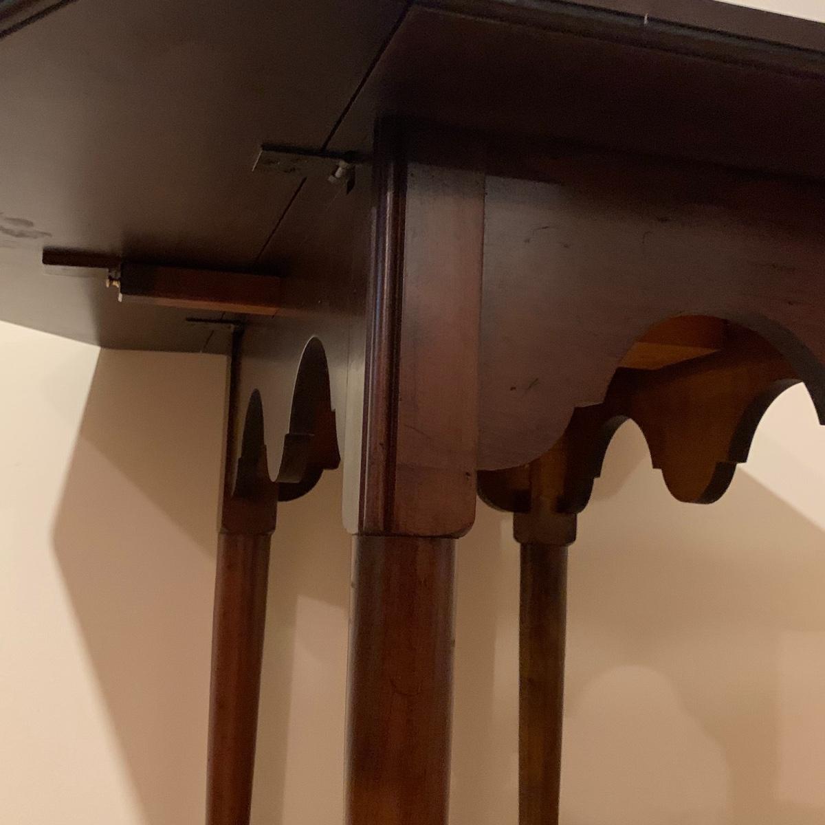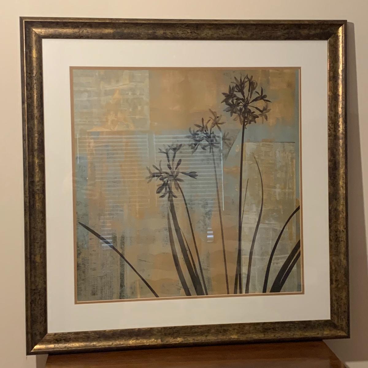 This lot includes one table and one framed print. The table is a wooden drop leaf side table. With the leaves up, it is octagonal and the table top measures 28.75” x 28.5”. The leaves are easily adjustable and have a sliding wooden support to keep them up. With the leaves down the tabletop measures 28.5” x 12.5”. The table is 26” tall. It is in used, but sturdy condition. A few small nicks are found on the surface, but otherwise it is in good condition cosmetically. The framed print has an antiqued gold leaf color on the frame. The frame feels to be made of plastic. It is double matted. There are rings attached to the backing for hanging. It appears to be in very good condition. The frame measures 33.75” x 33.75”. Local Pickup Only