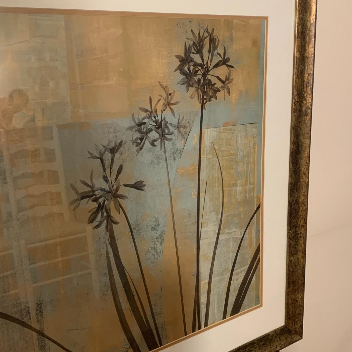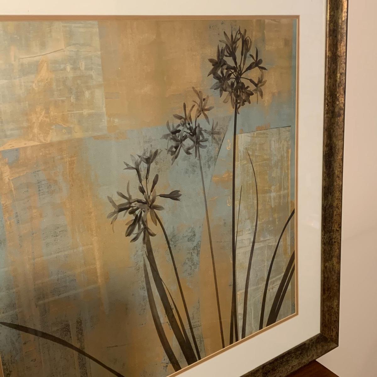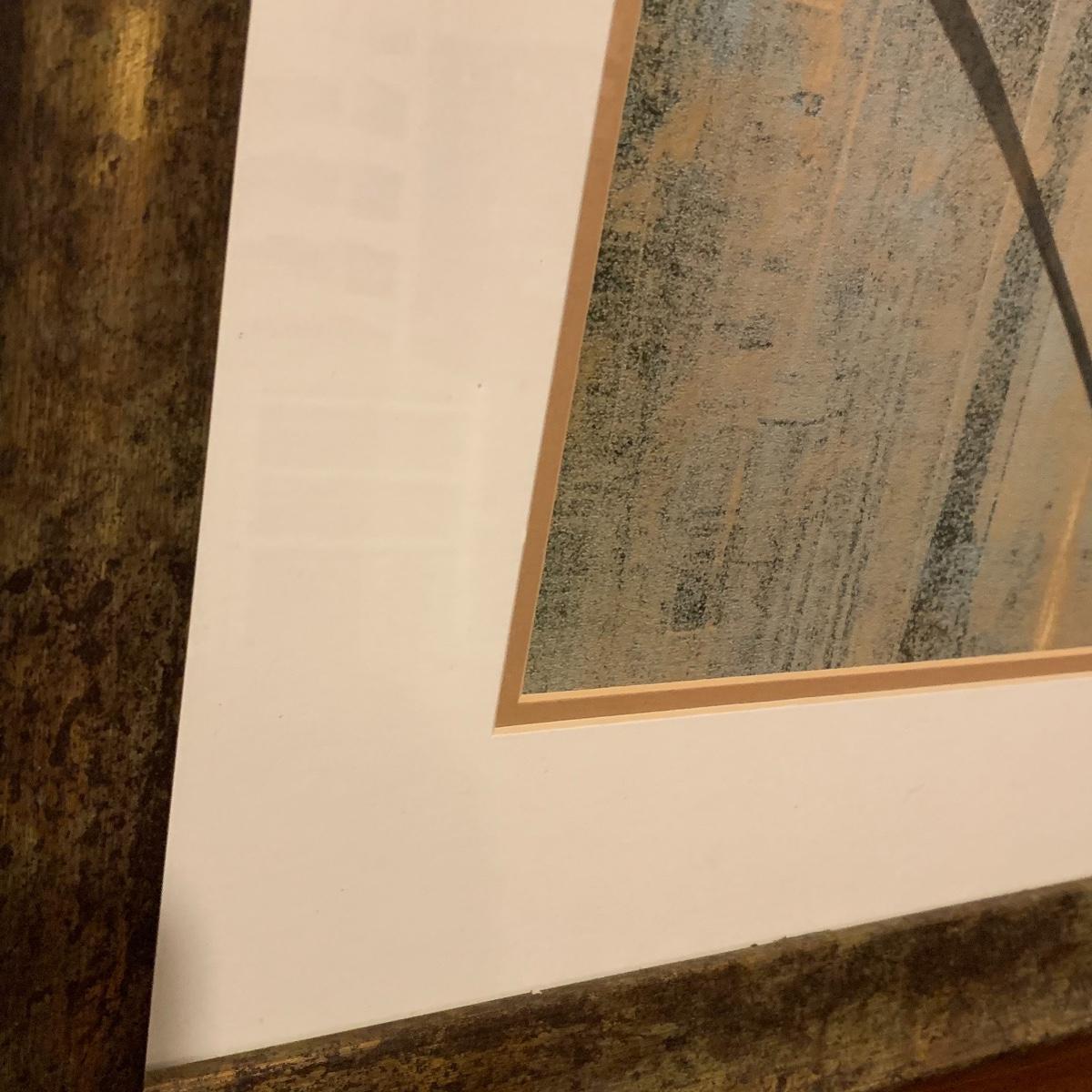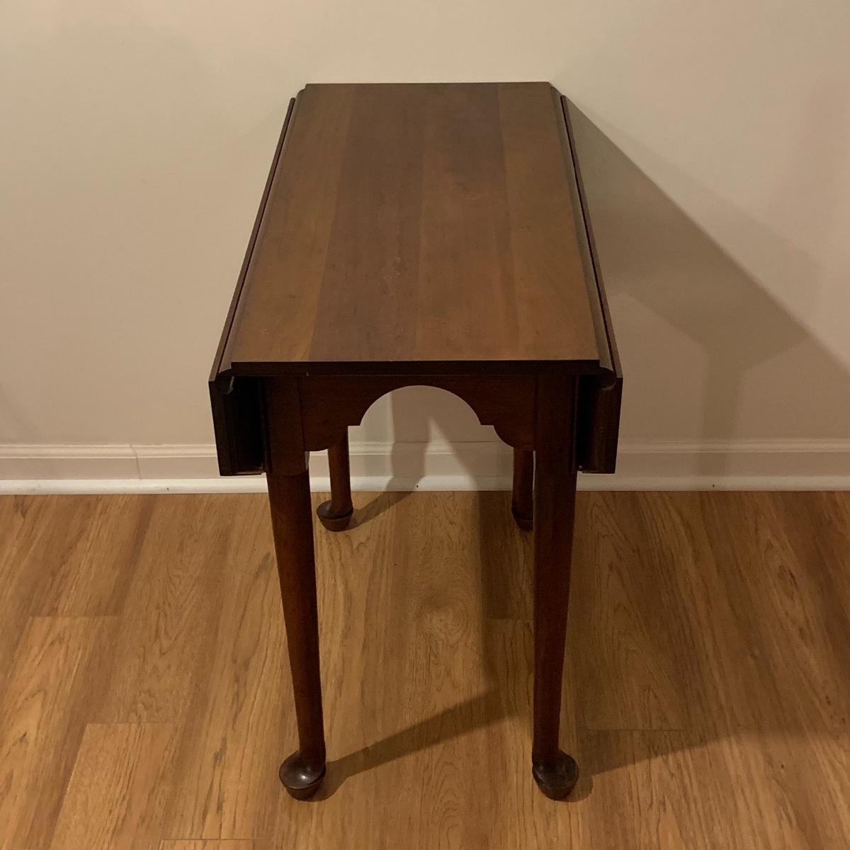This lot includes one table and one framed print. The table is a wooden drop leaf side table. With the leaves up, it is octagonal and the table top measures 28.75” x 28.5”. The leaves are easily adjustable and have a sliding wooden support to keep them up. With the leaves down the tabletop measures 28.5” x 12.5”. The table is 26” tall. It is in used, but sturdy condition. A few small nicks are found on the surface, but otherwise it is in good condition cosmetically. The framed print has an antiqued gold leaf color on the frame. The frame feels to be made of plastic. It is double matted. There are rings attached to the backing for hanging. It appears to be in very good condition. The frame measures 33.75” x 33.75”. Local Pickup Only