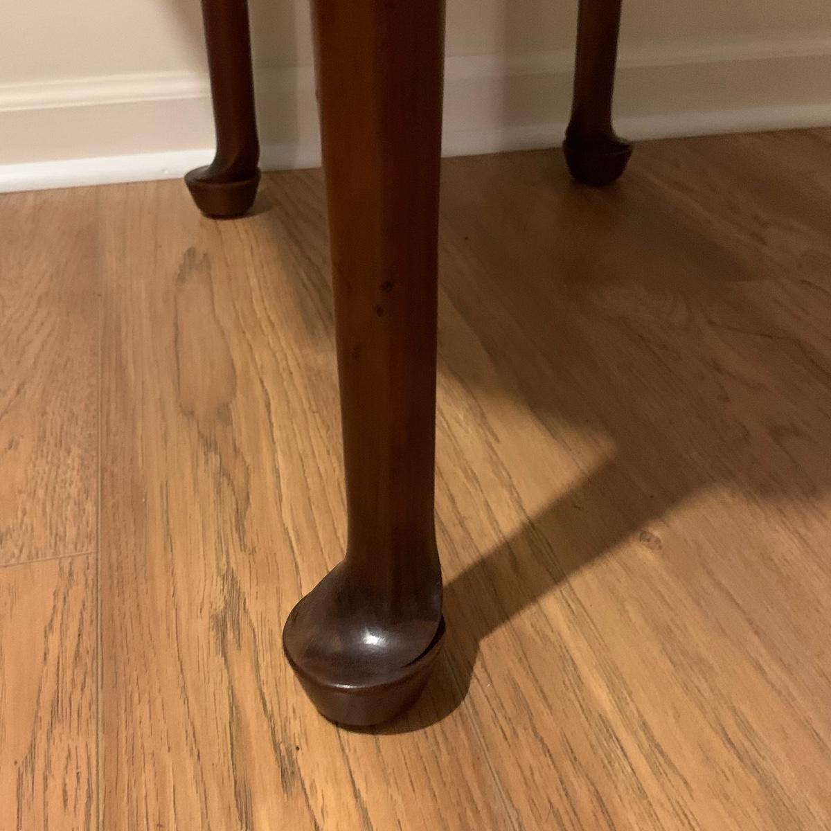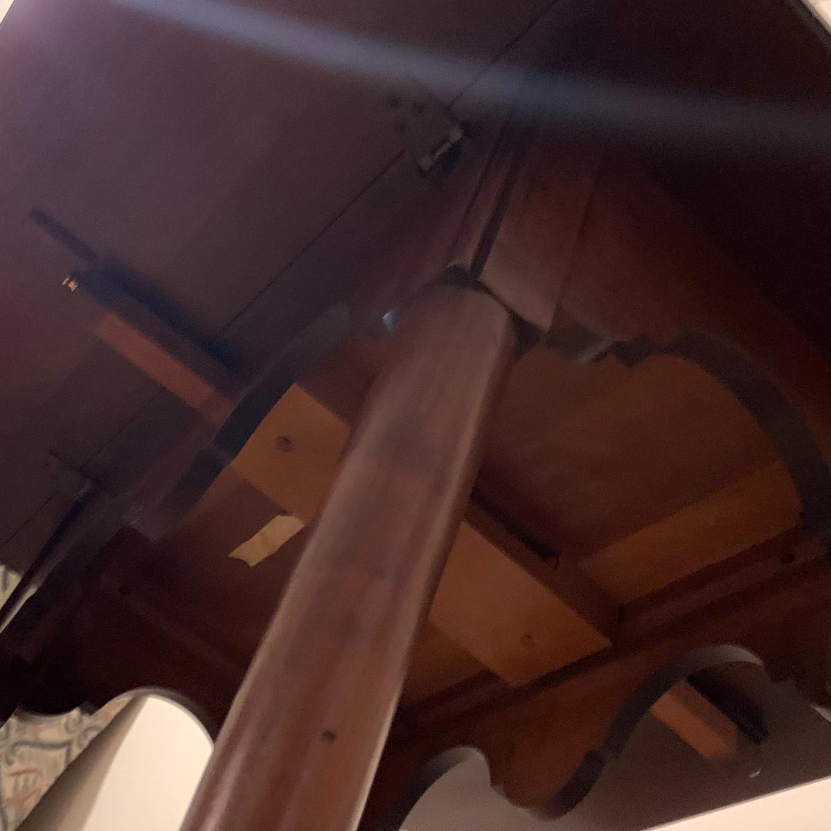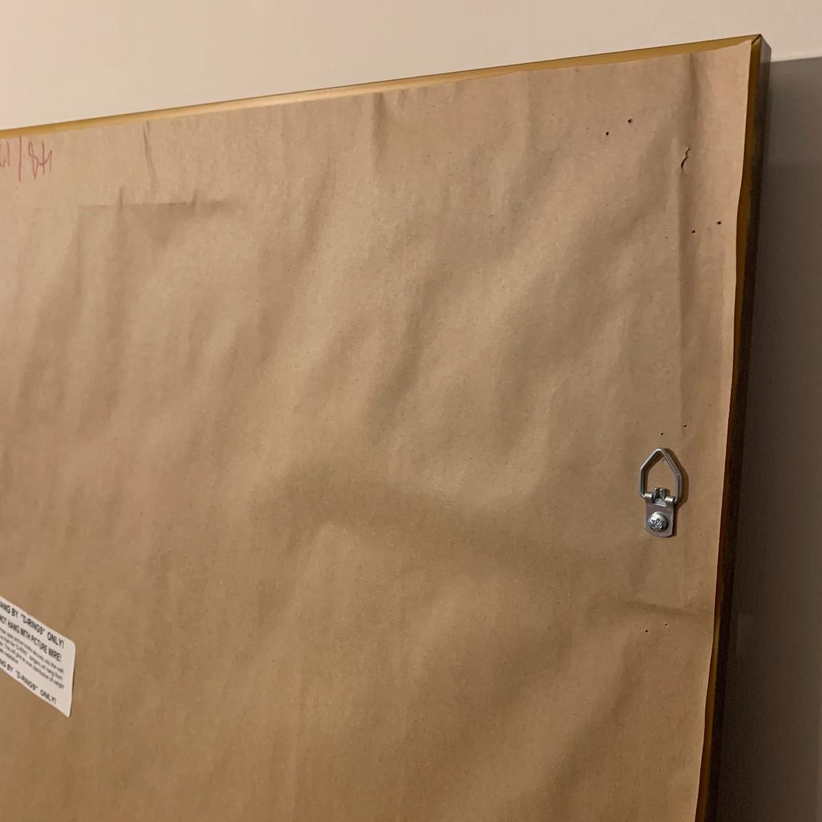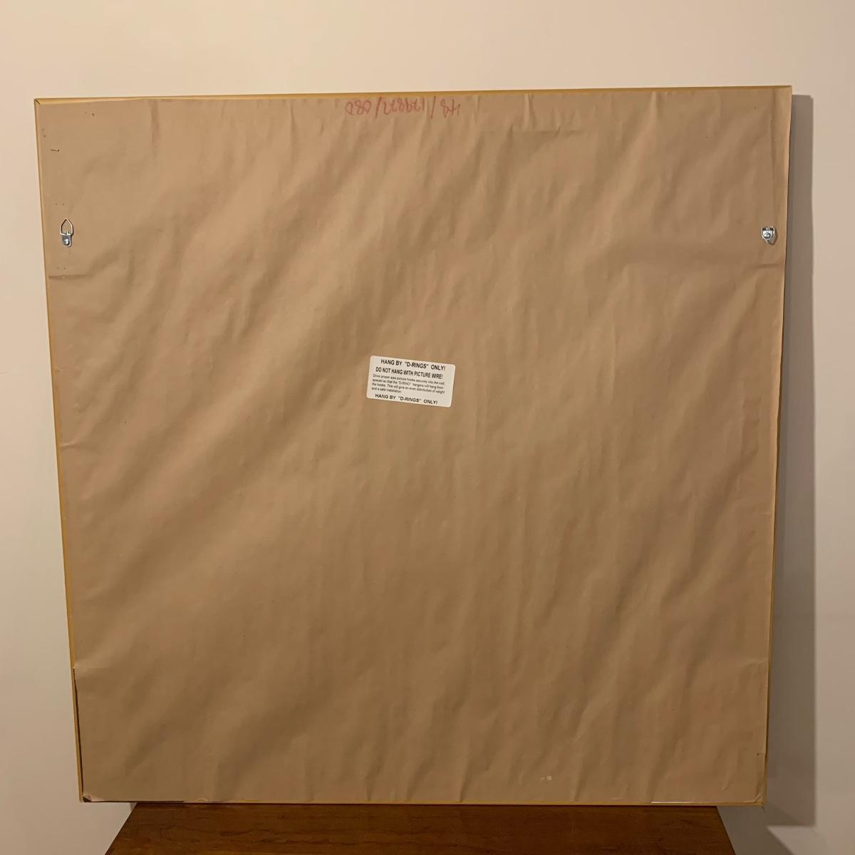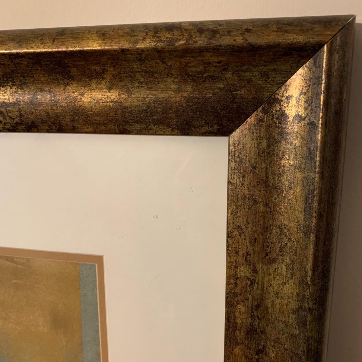 This lot includes one table and one framed print. The table is a wooden drop leaf side table. With the leaves up, it is octagonal and the table top measures 28.75” x 28.5”. The leaves are easily adjustable and have a sliding wooden support to keep them up. With the leaves down the tabletop measures 28.5” x 12.5”. The table is 26” tall. It is in used, but sturdy condition. A few small nicks are found on the surface, but otherwise it is in good condition cosmetically. The framed print has an antiqued gold leaf color on the frame. The frame feels to be made of plastic. It is double matted. There are rings attached to the backing for hanging. It appears to be in very good condition. The frame measures 33.75” x 33.75”. Local Pickup Only