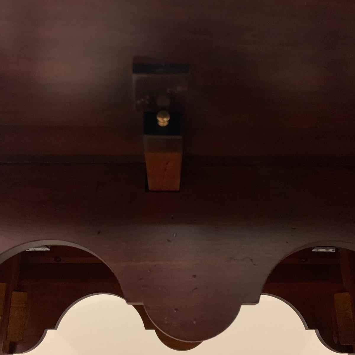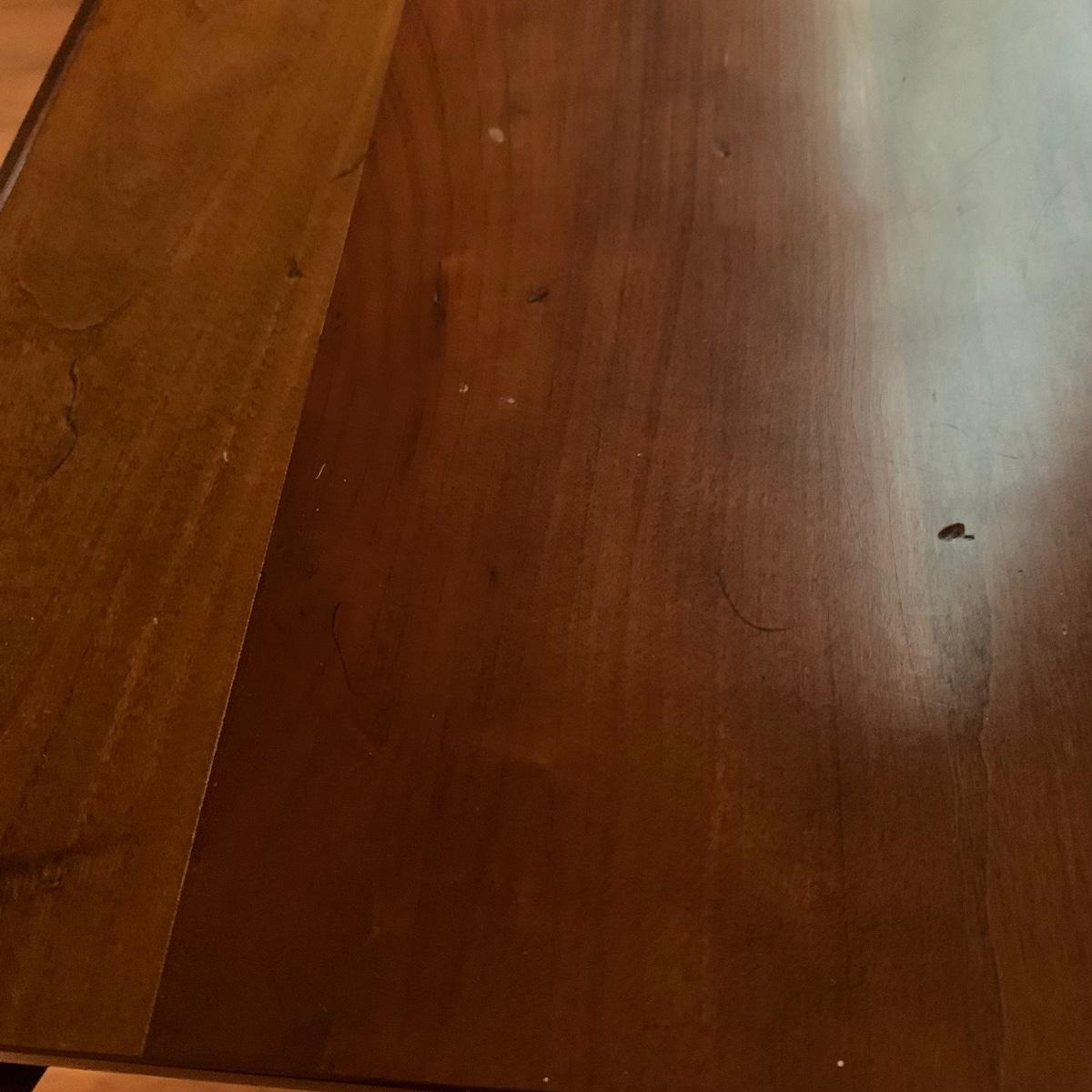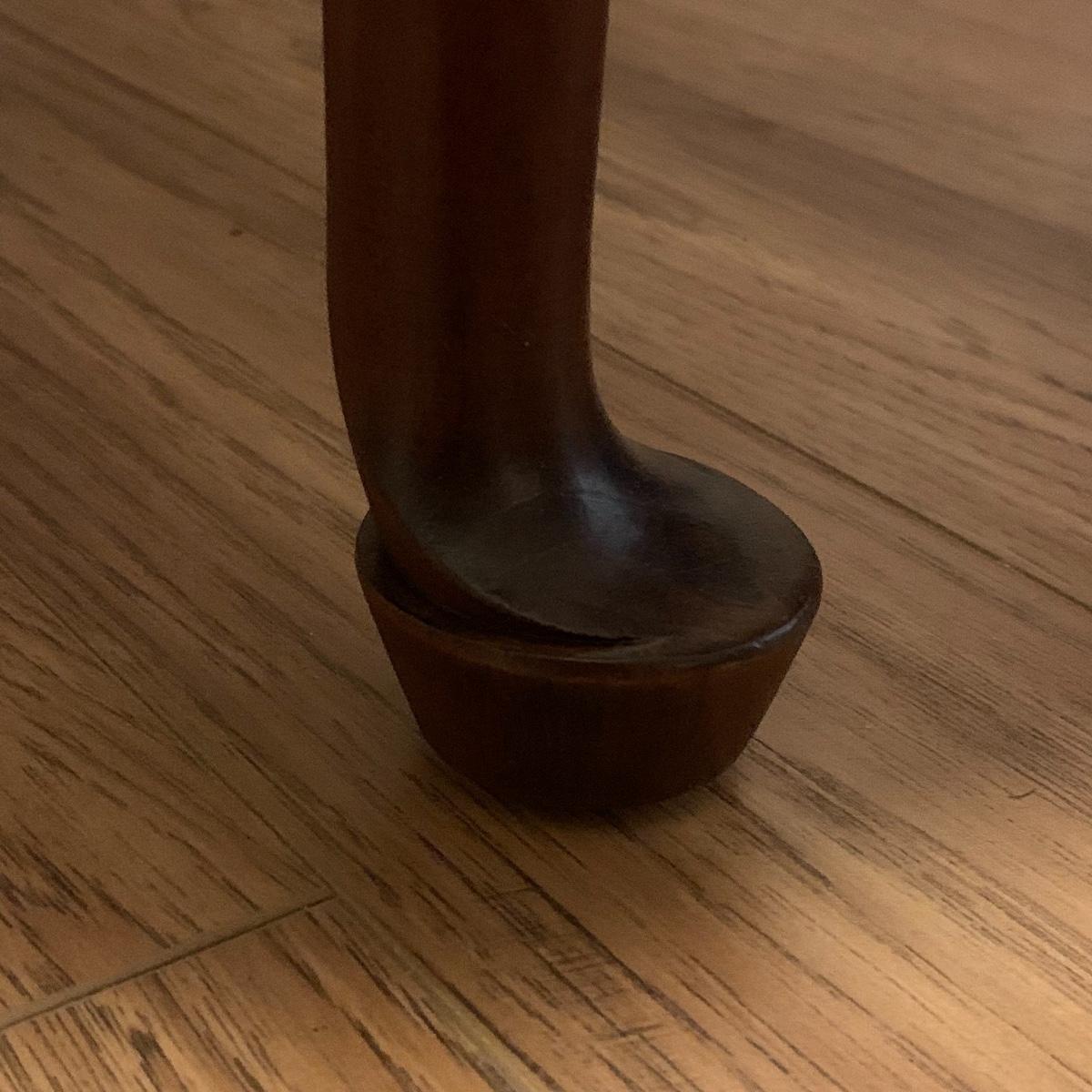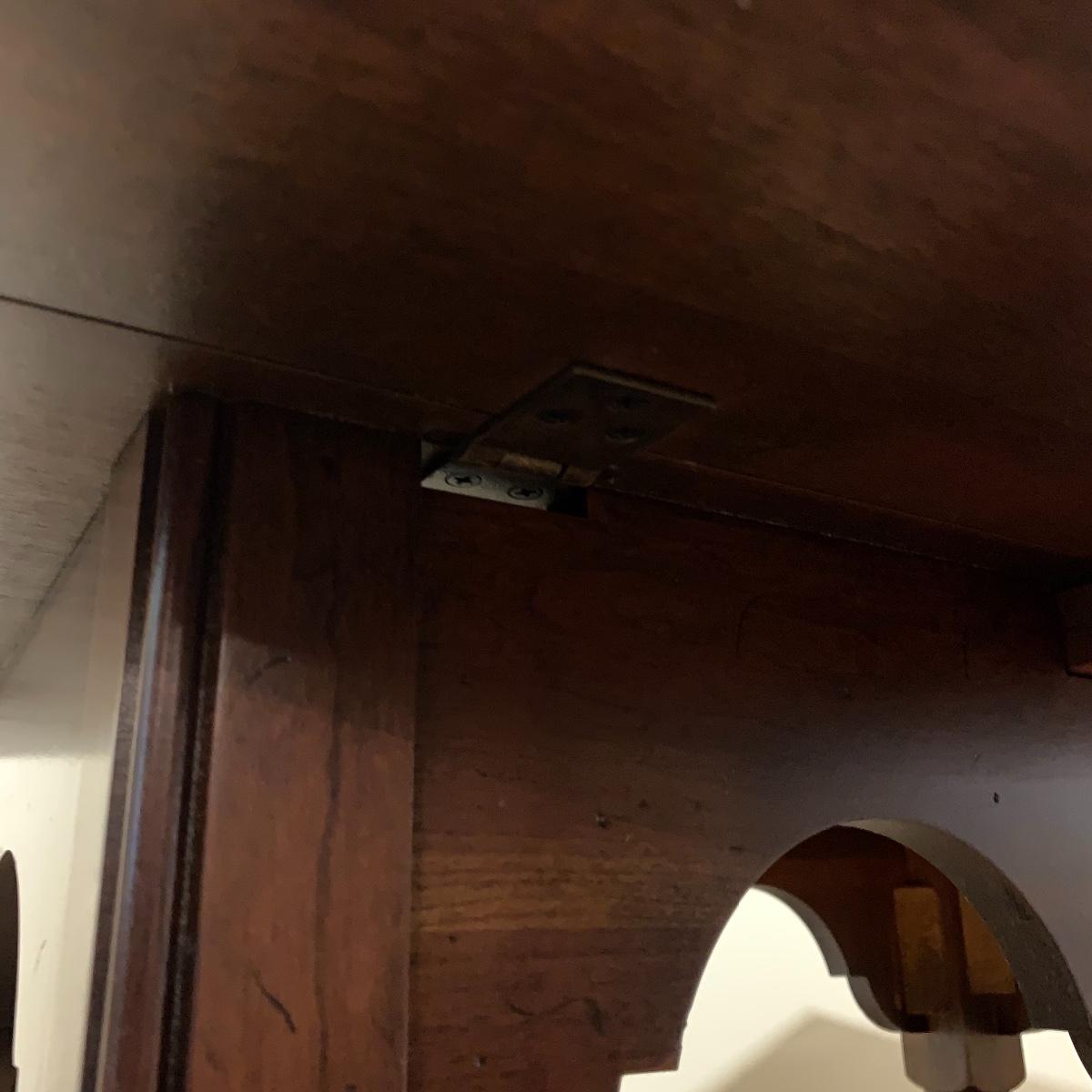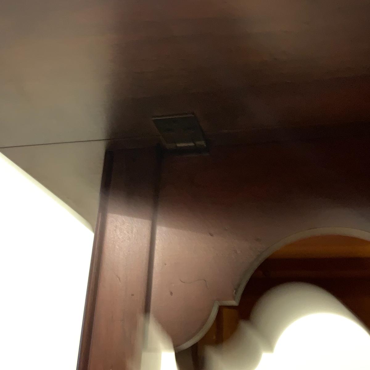 This lot includes one table and one framed print. The table is a wooden drop leaf side table. With the leaves up, it is octagonal and the table top measures 28.75” x 28.5”. The leaves are easily adjustable and have a sliding wooden support to keep them up. With the leaves down the tabletop measures 28.5” x 12.5”. The table is 26” tall. It is in used, but sturdy condition. A few small nicks are found on the surface, but otherwise it is in good condition cosmetically. The framed print has an antiqued gold leaf color on the frame. The frame feels to be made of plastic. It is double matted. There are rings attached to the backing for hanging. It appears to be in very good condition. The frame measures 33.75” x 33.75”. Local Pickup Only