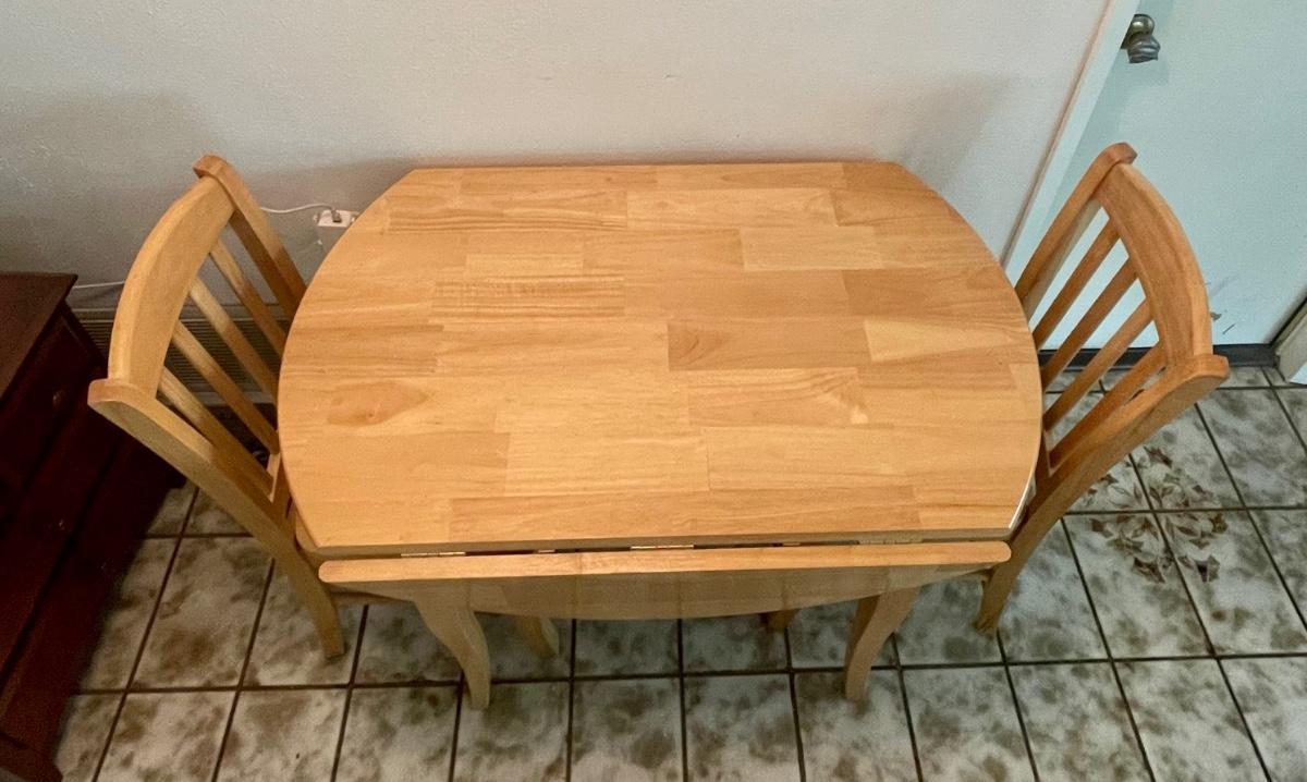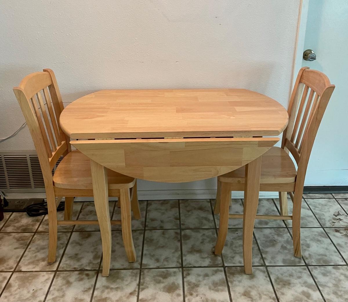 Light finished Wood Table and Chairs Set Drop leaf style, 39” high, 42” round. PICK UP IN CYPRESS 6/3.