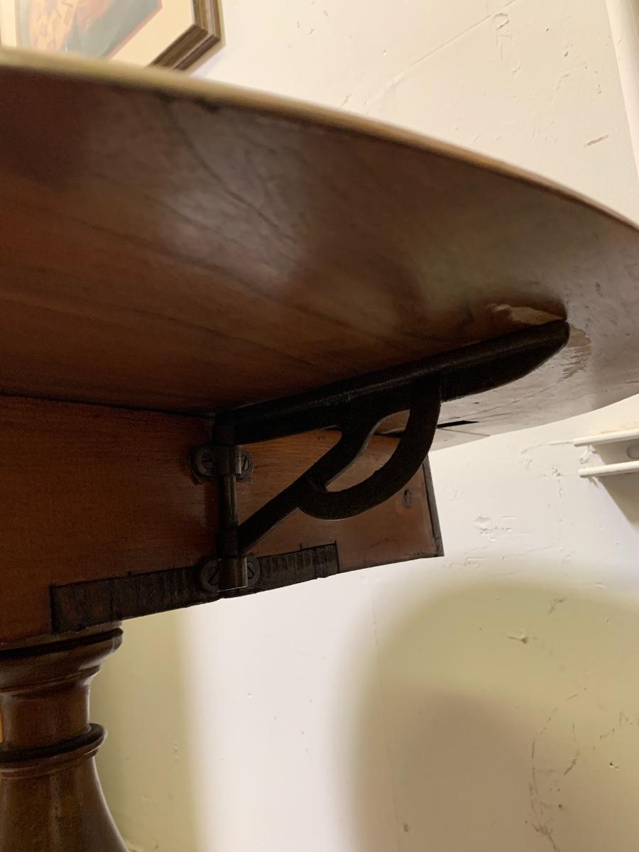 Solid wood Drop leaf table with cast iron leaf supports. Size of a small dining room table.