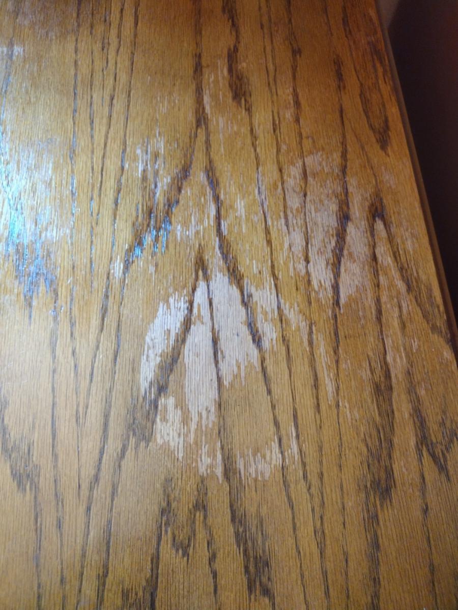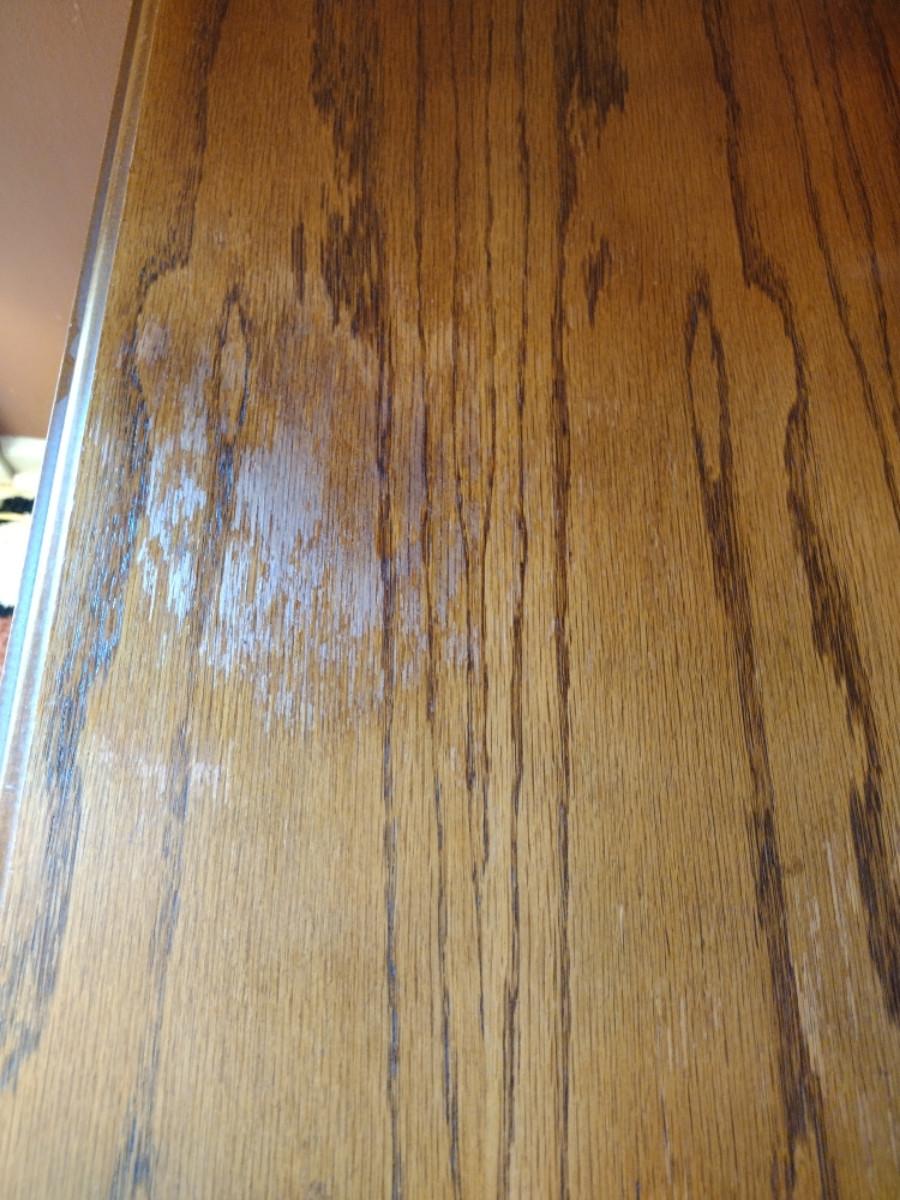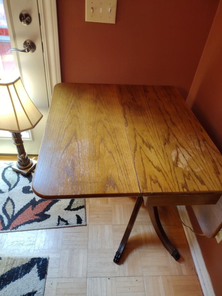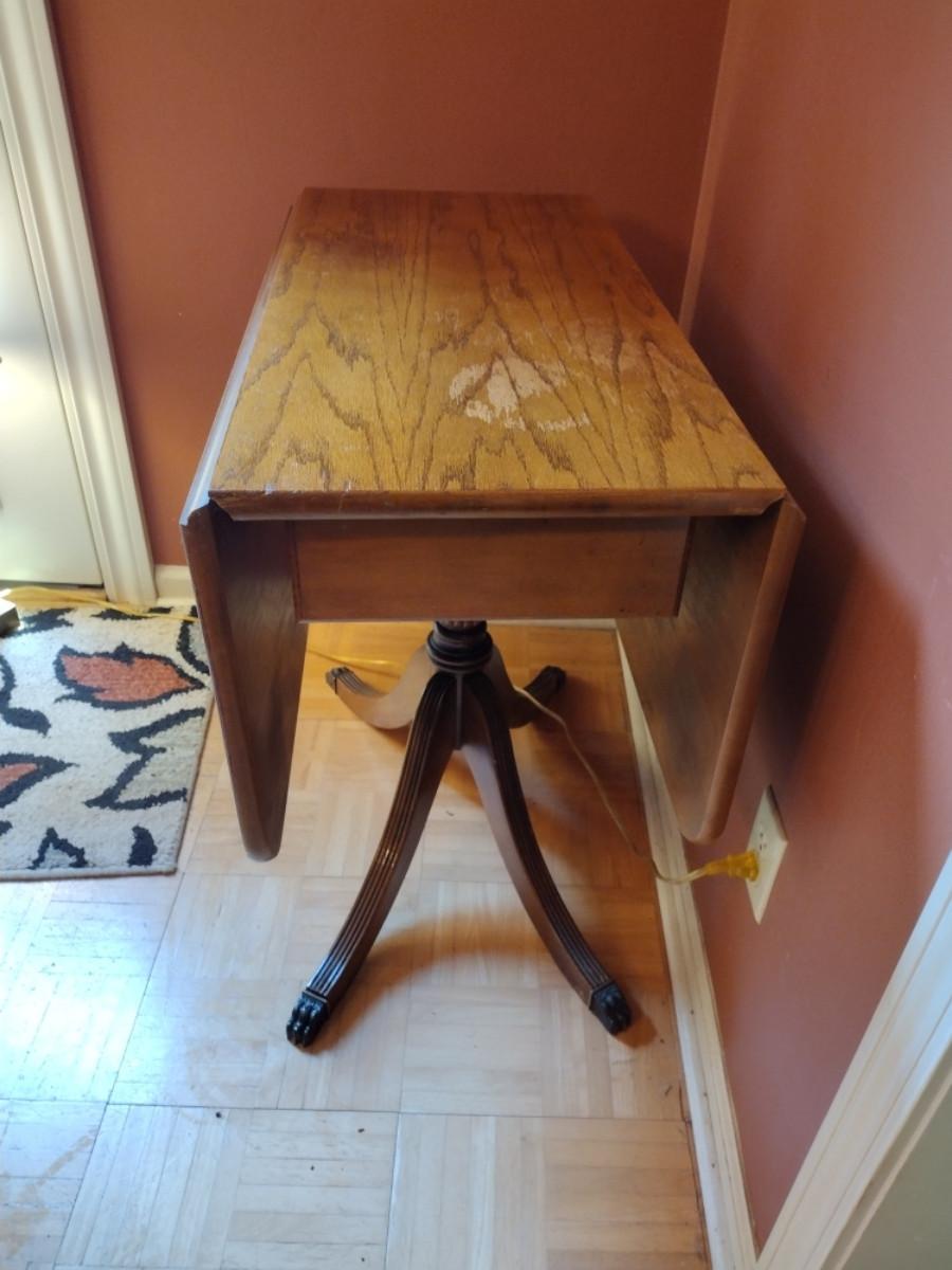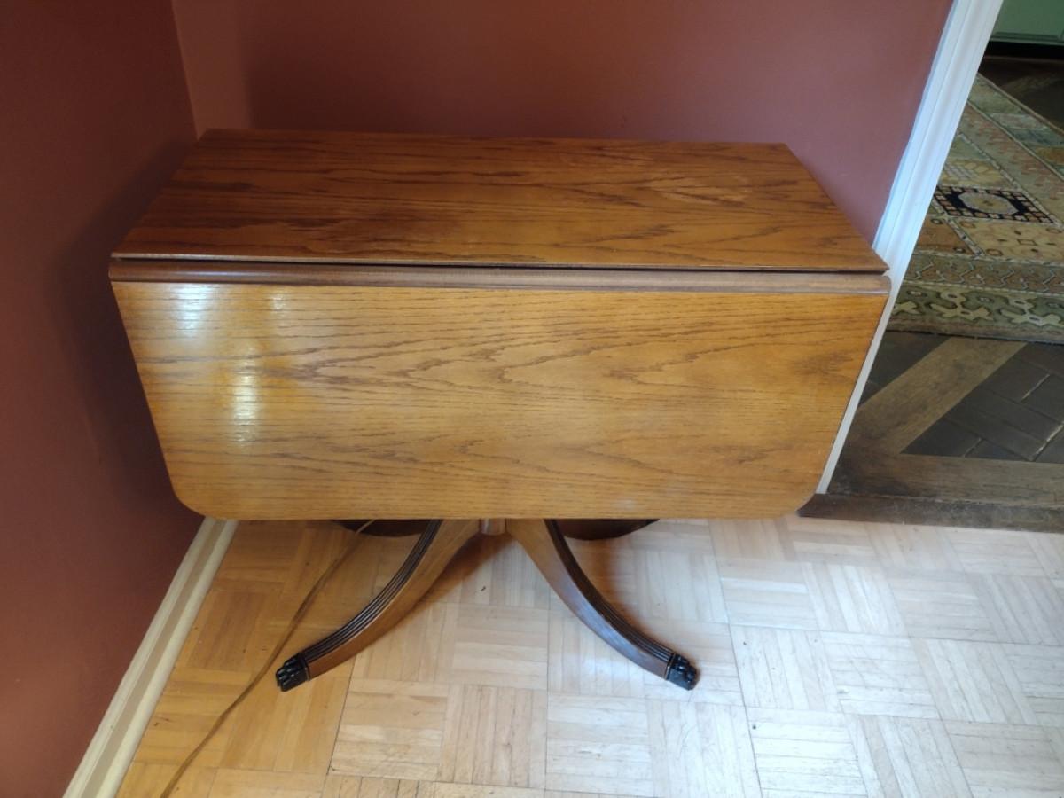 This drop leaf table has a 4 footed pedestal base and two folding sides. Table measures 42"x32"x29" with each leaf measuring 14" each. Table has several watermarks. Please see pictures for more detail.