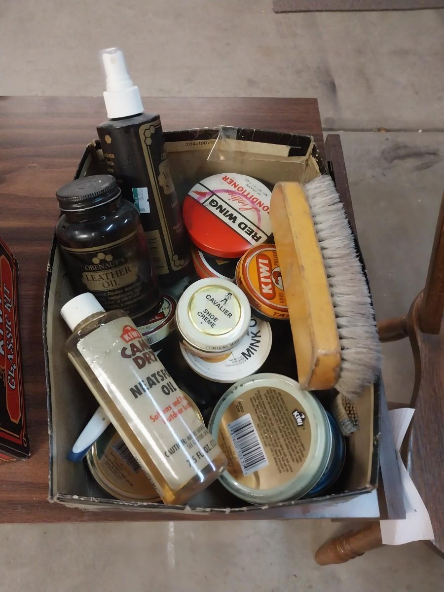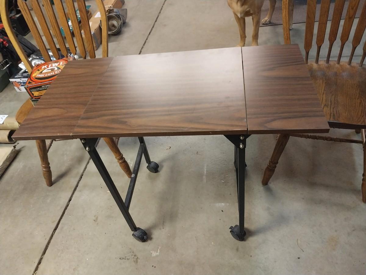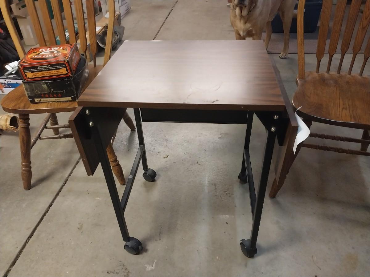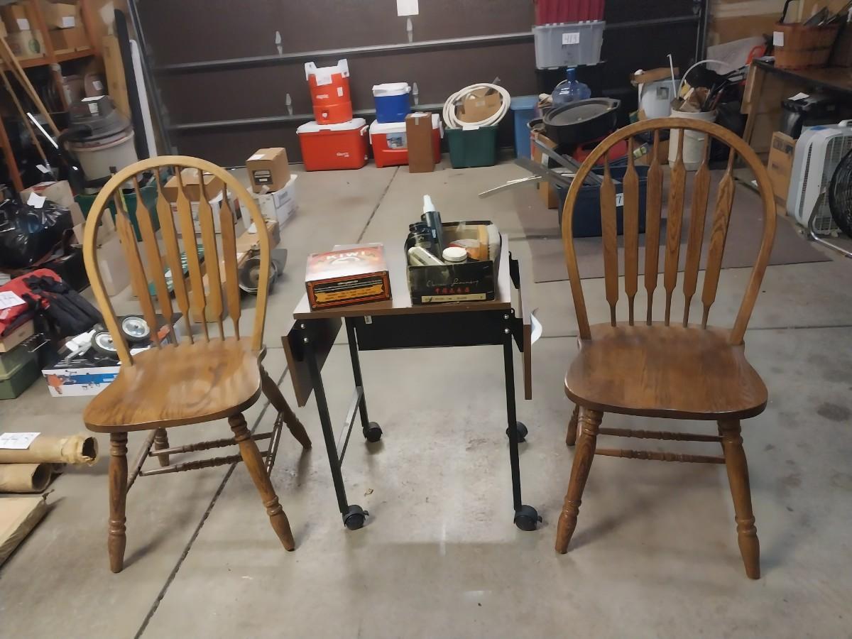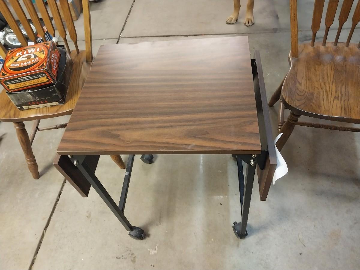 DROP LEAF TABLE ON WHEELS, 2 OAK CHAIRS AND SHOE POLISH