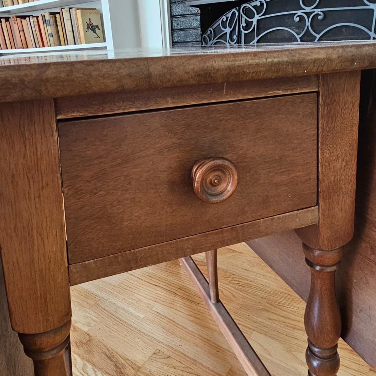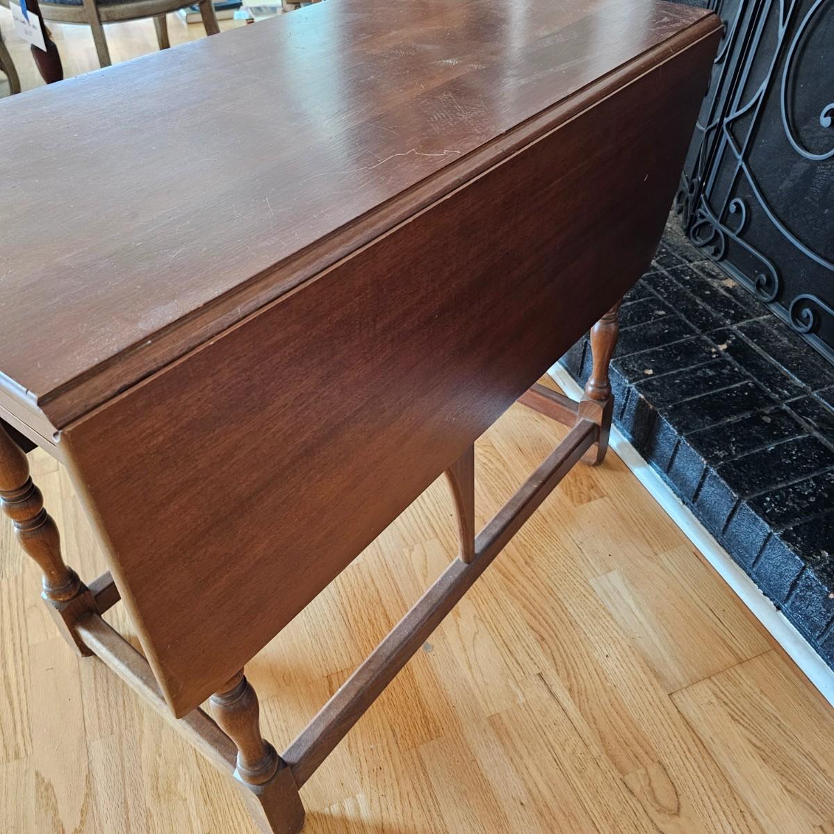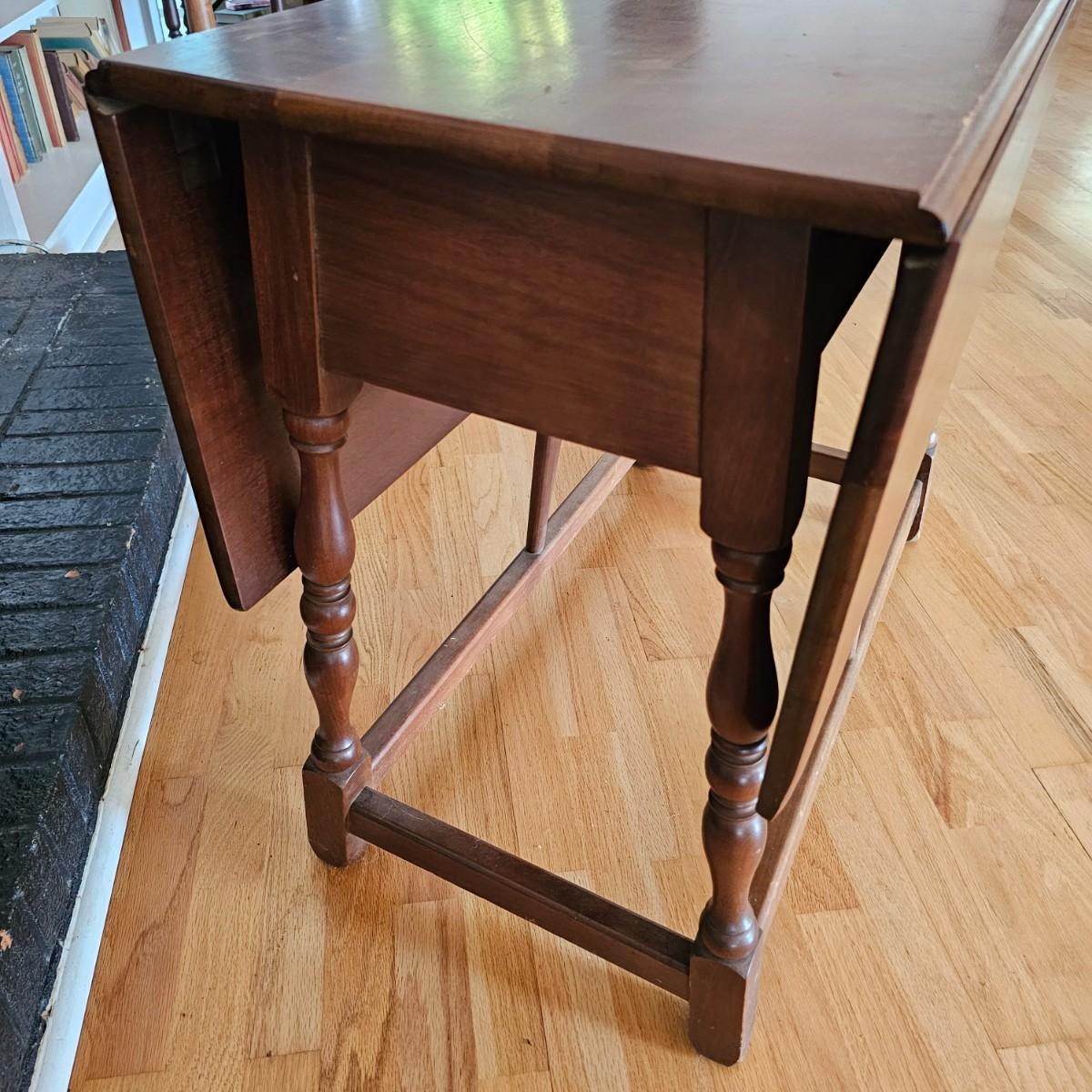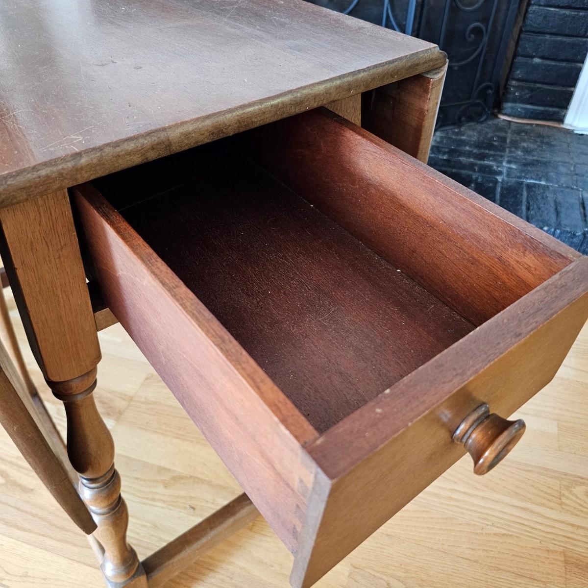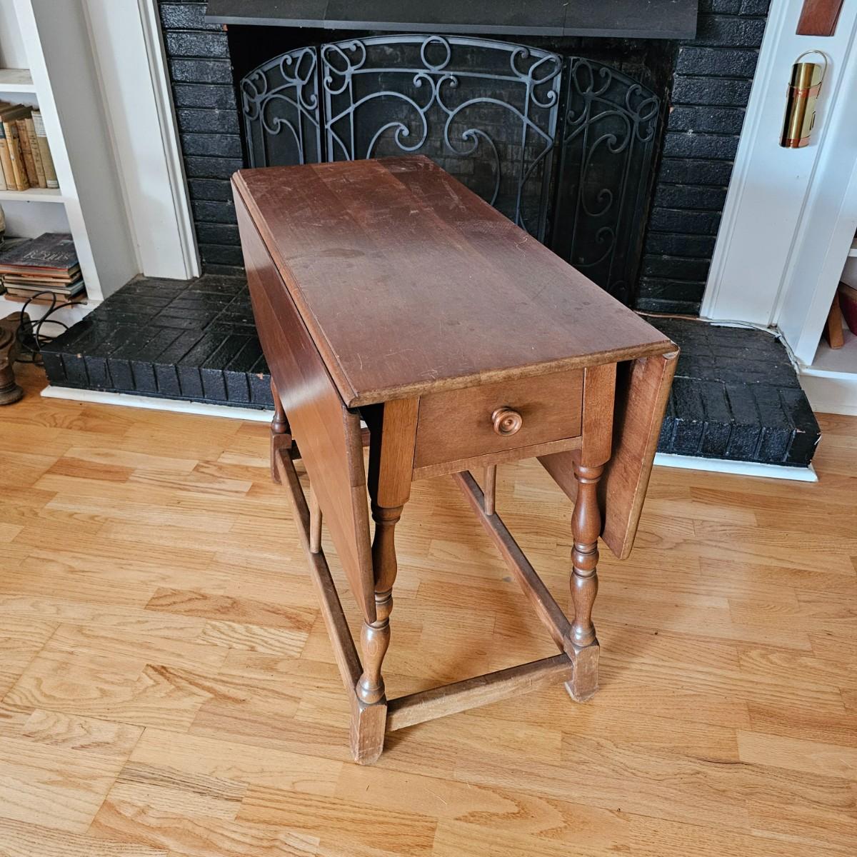 Slender drop leaf table has center drawer w/dovetail corners. Side wings swing up and are held up by two curved supports. Table measures 16.5" x 36" x 28.5"H closed, and 42.5" wide open. Some small scratches and blemishes on top, see photos for details. Local pickup only.