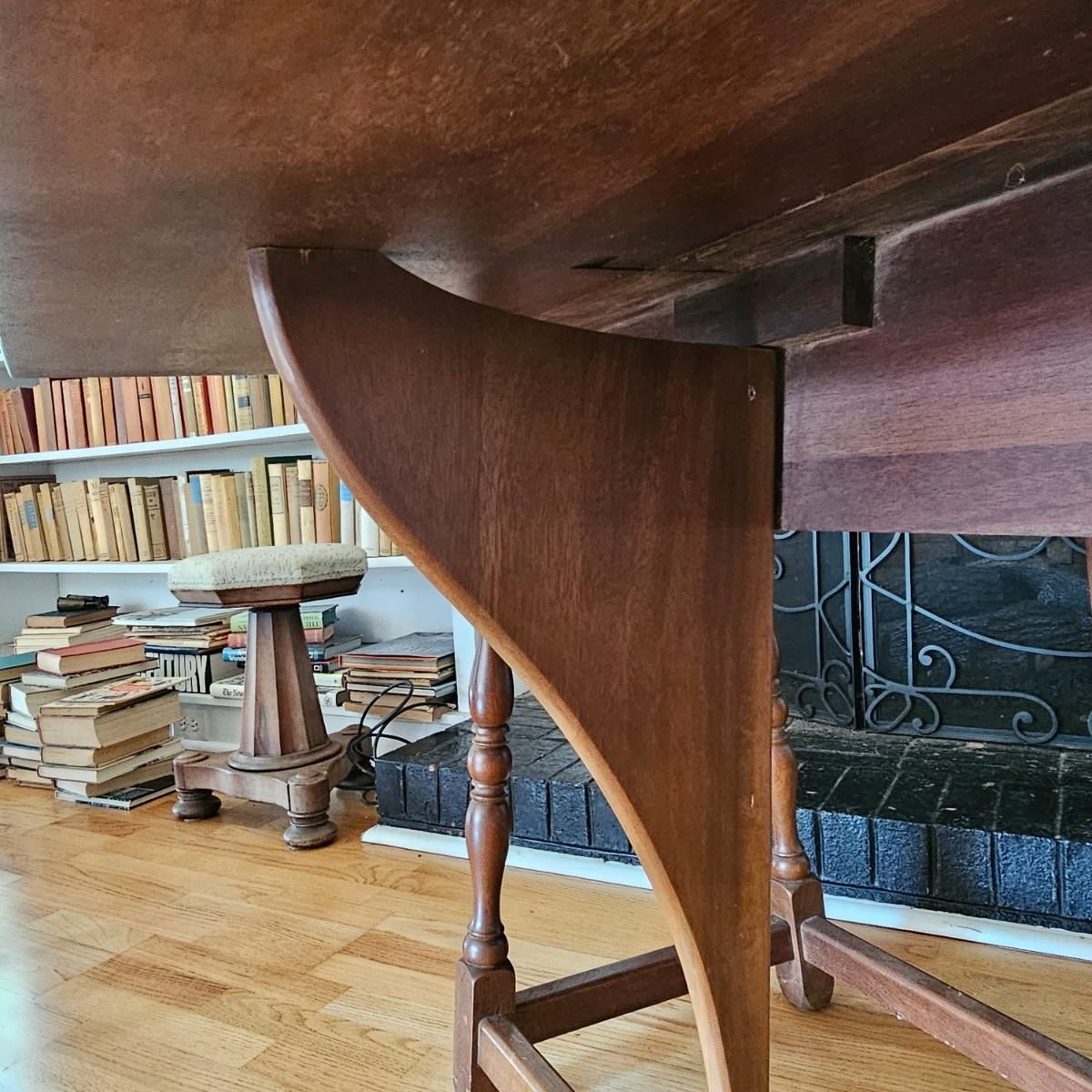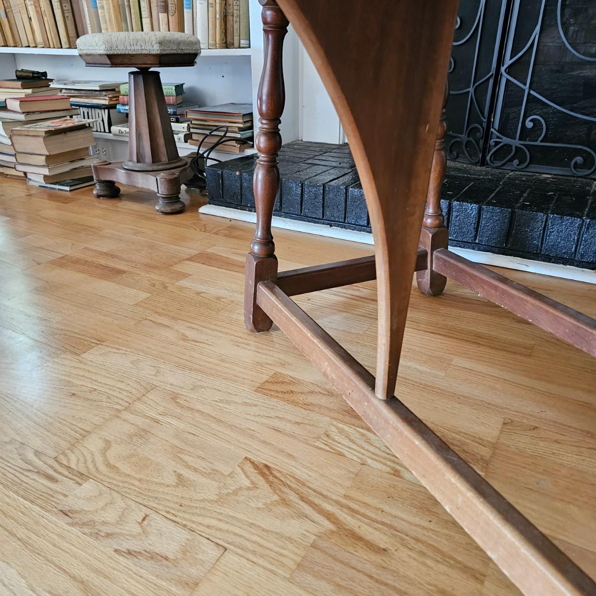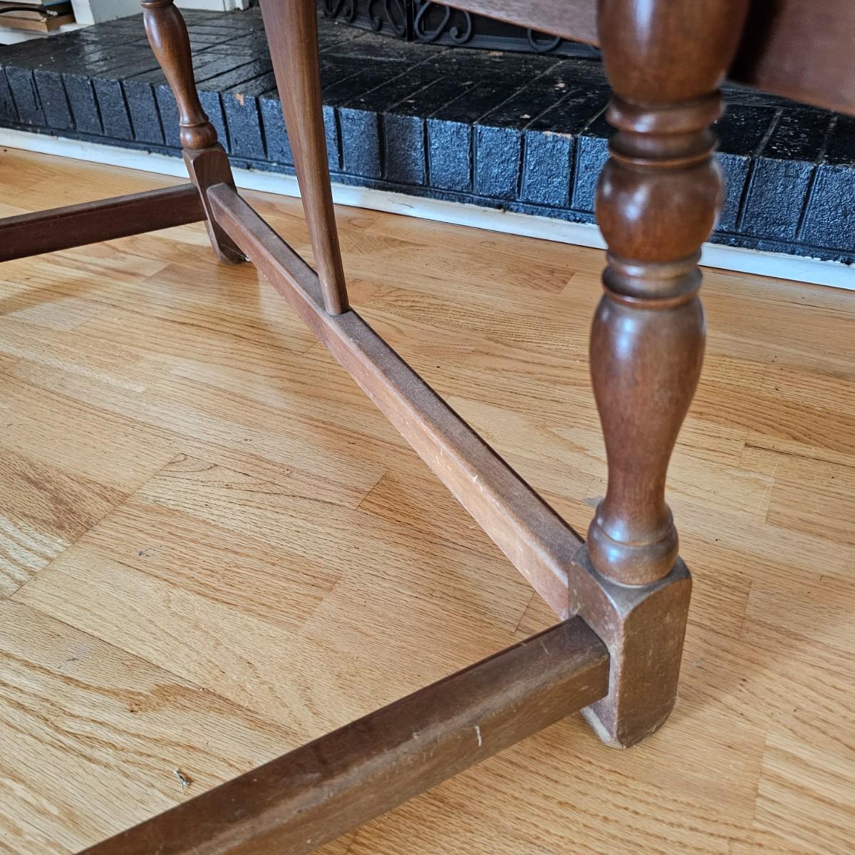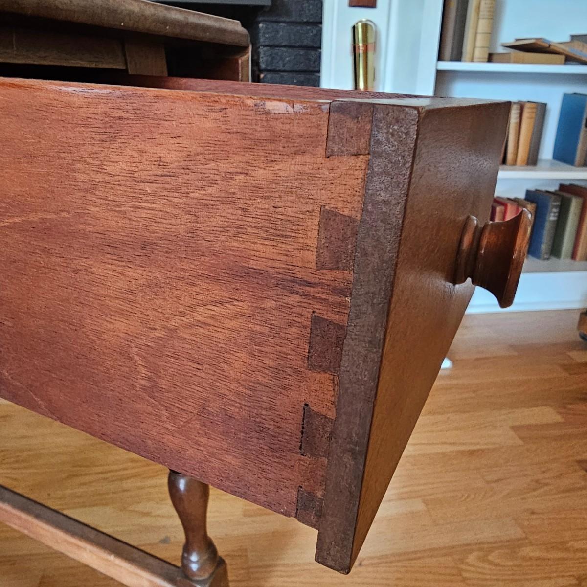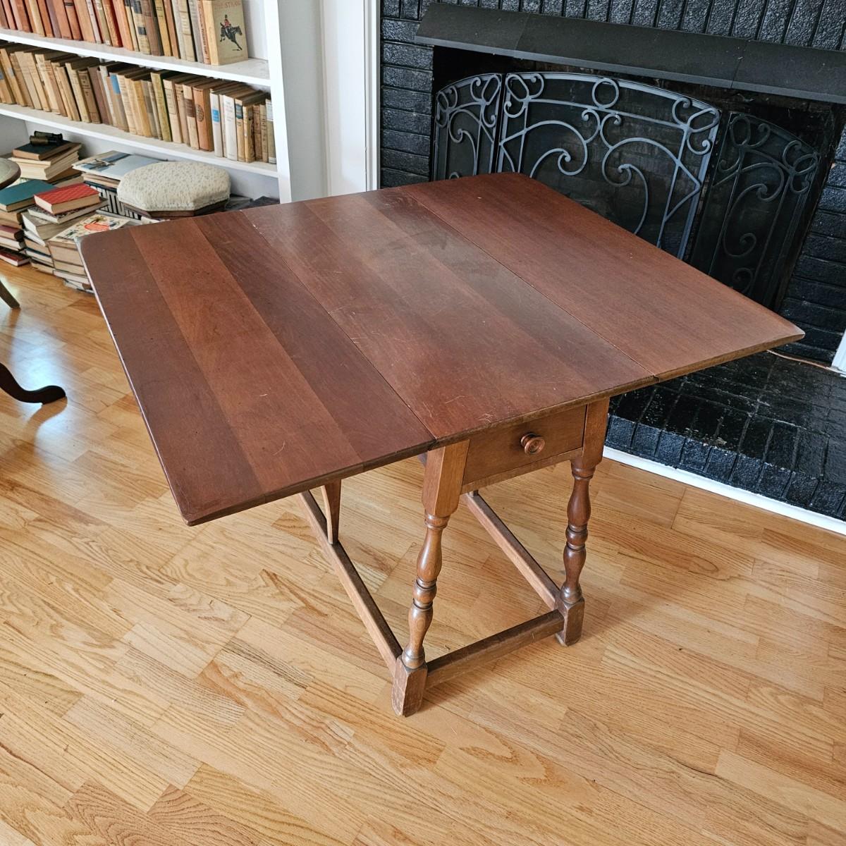 Slender drop leaf table has center drawer w/dovetail corners. Side wings swing up and are held up by two curved supports. Table measures 16.5" x 36" x 28.5"H closed, and 42.5" wide open. Some small scratches and blemishes on top, see photos for details. Local pickup only.