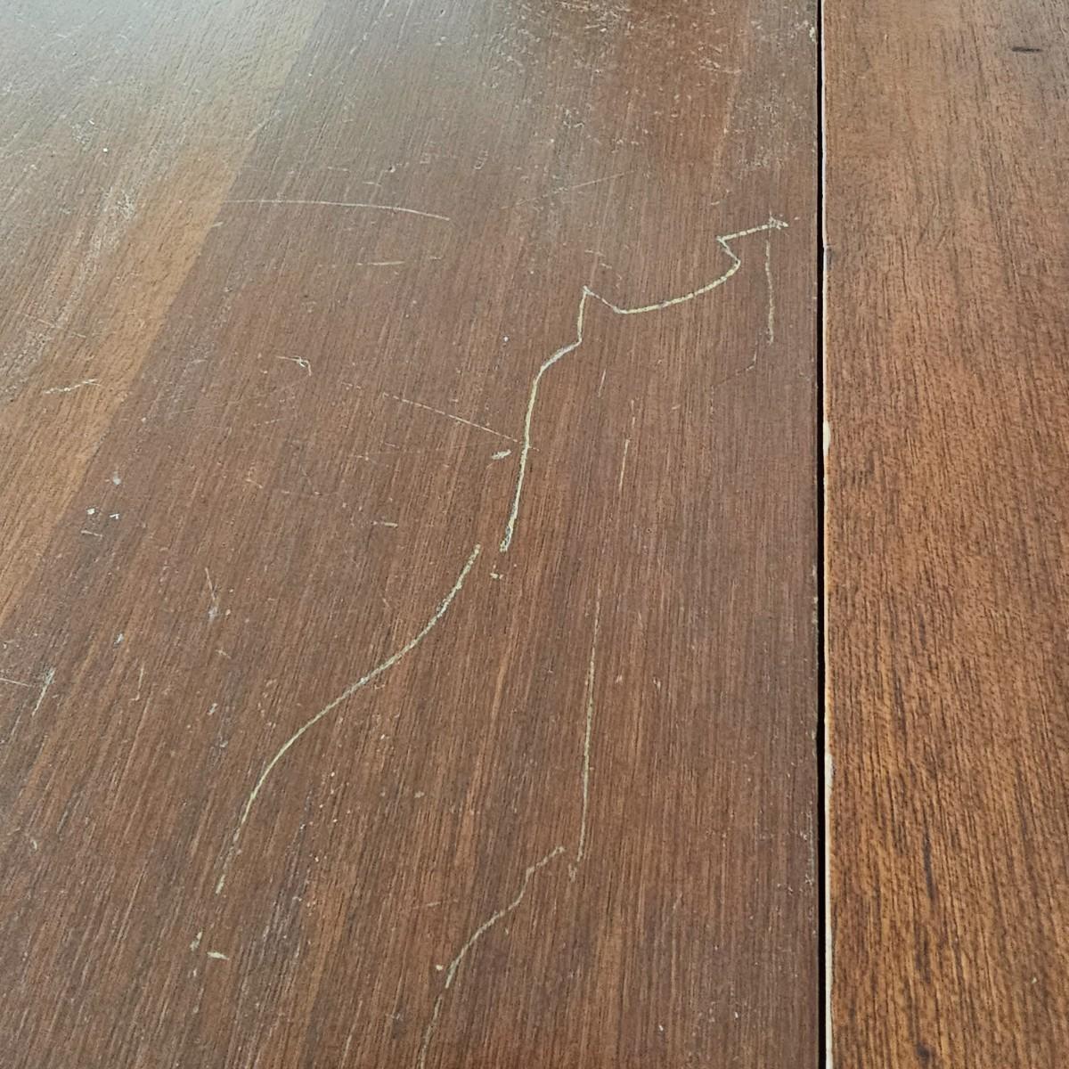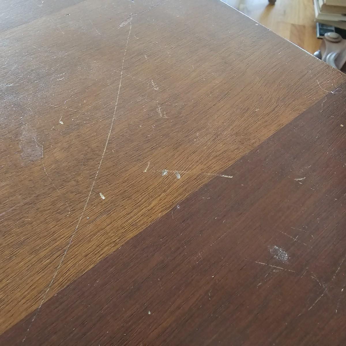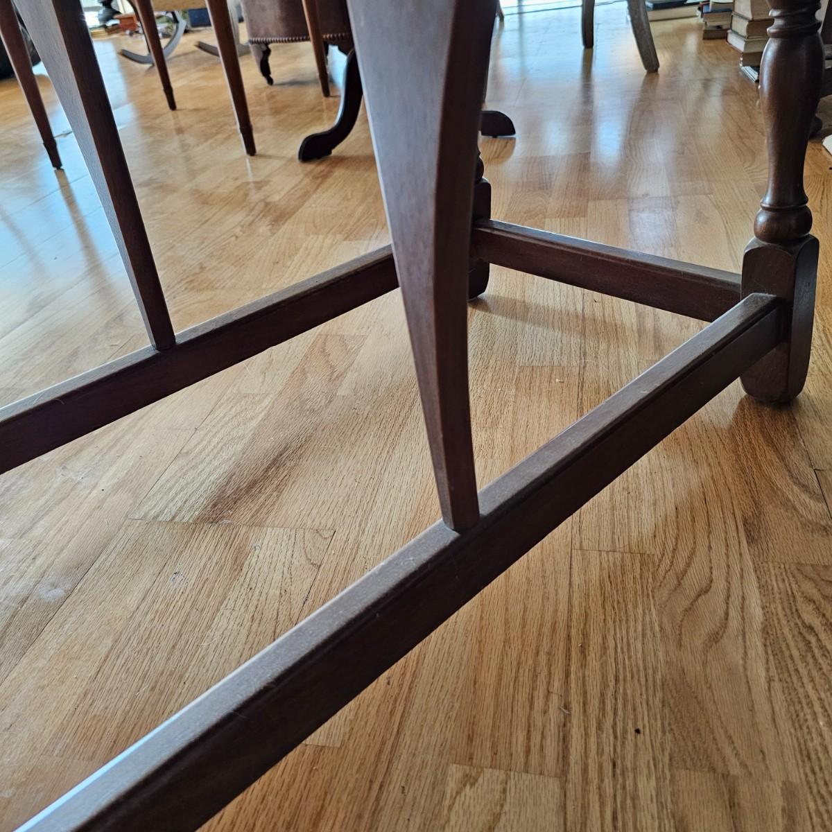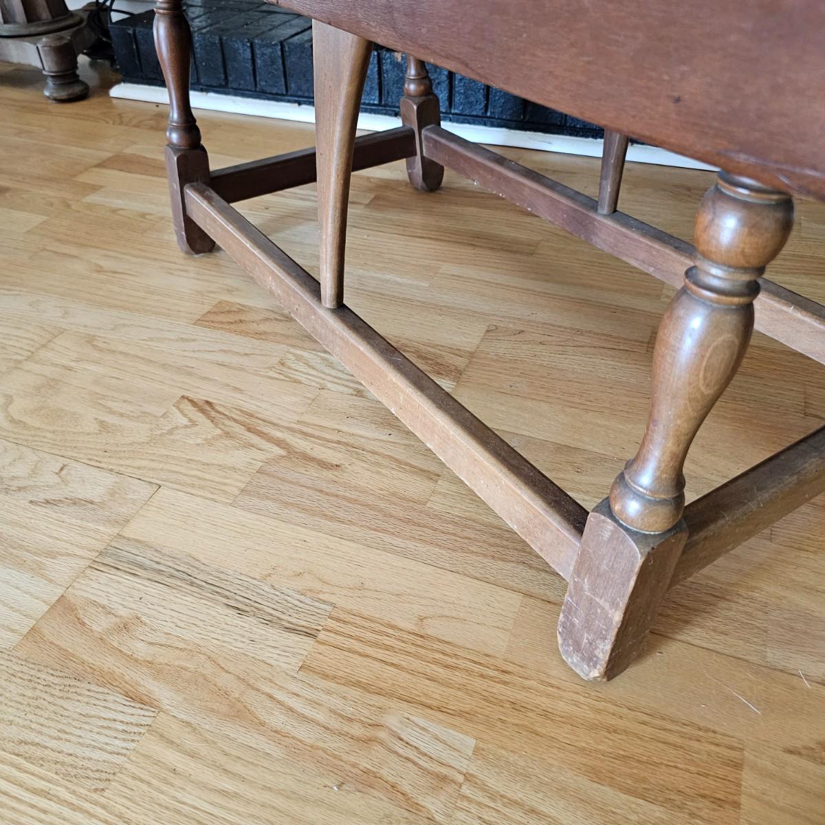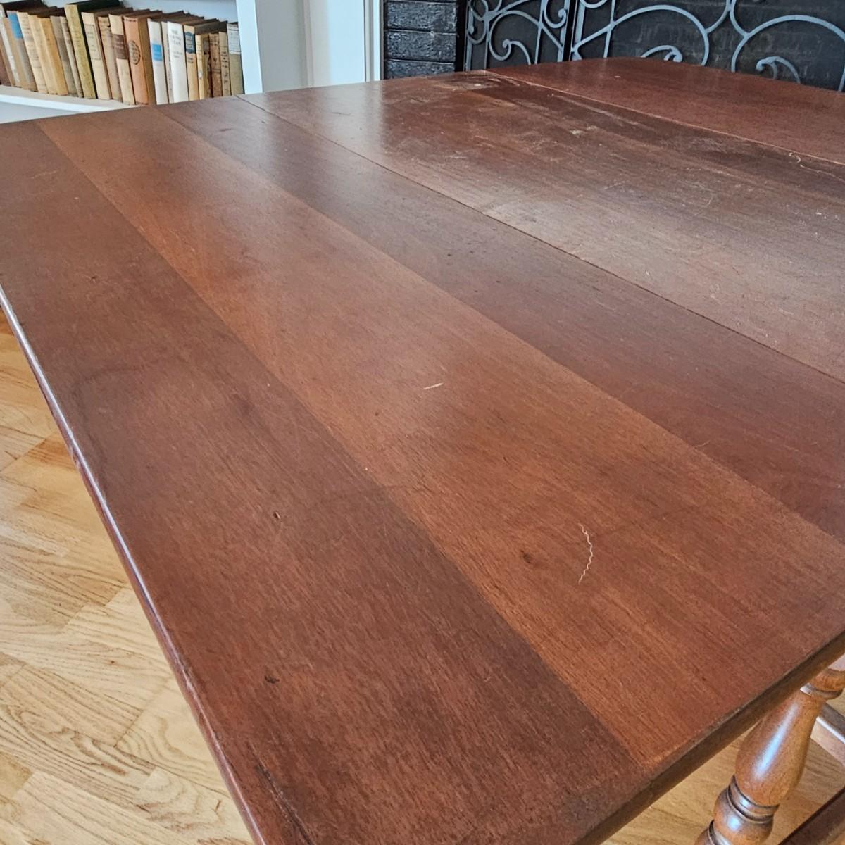 Slender drop leaf table has center drawer w/dovetail corners. Side wings swing up and are held up by two curved supports. Table measures 16.5" x 36" x 28.5"H closed, and 42.5" wide open. Some small scratches and blemishes on top, see photos for details. Local pickup only.