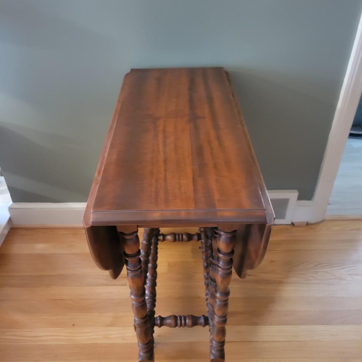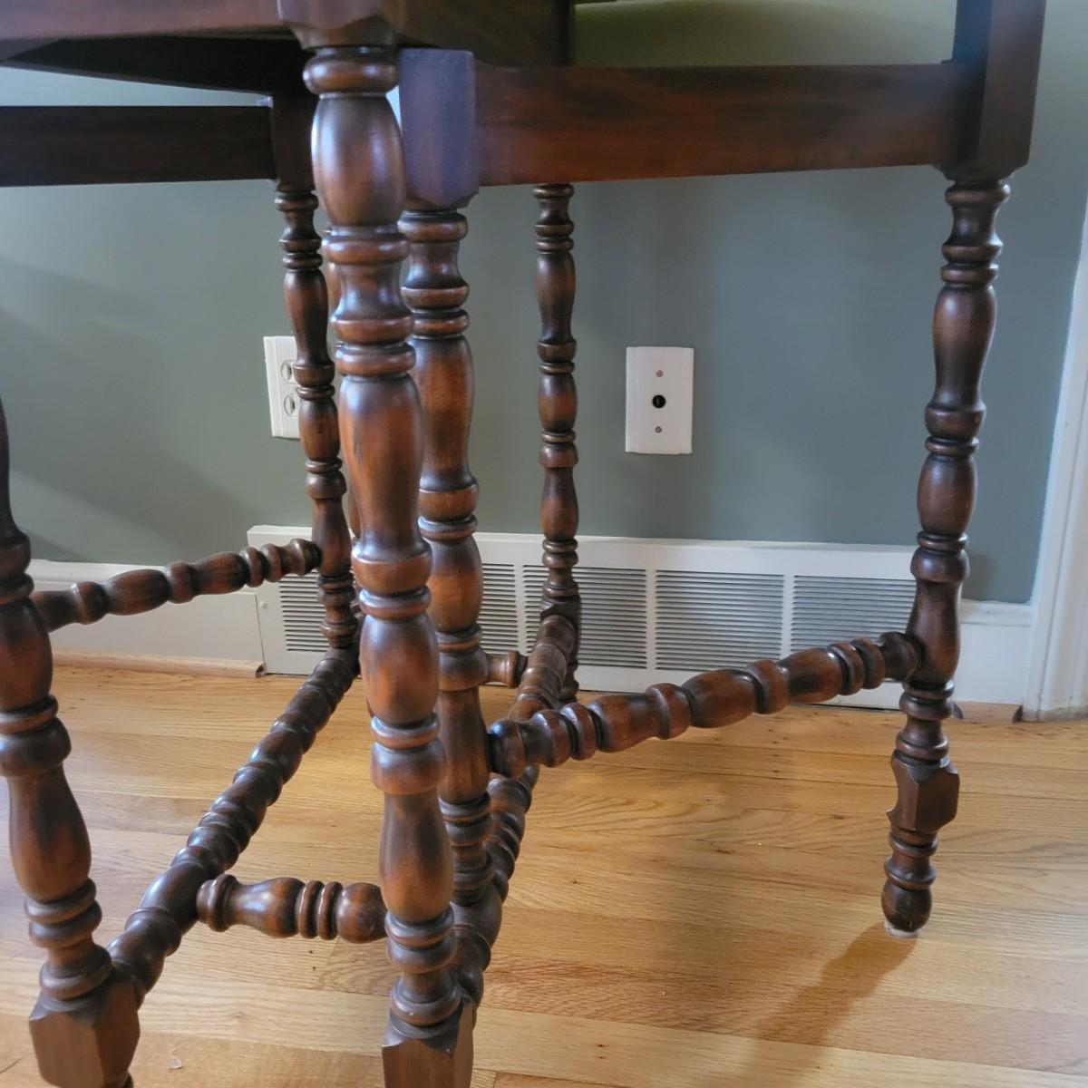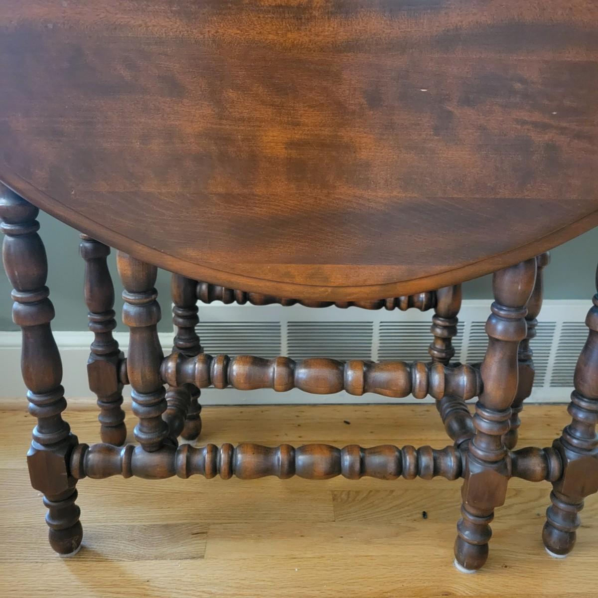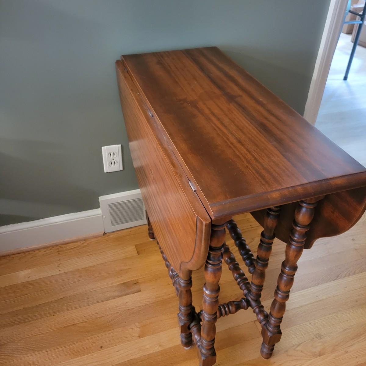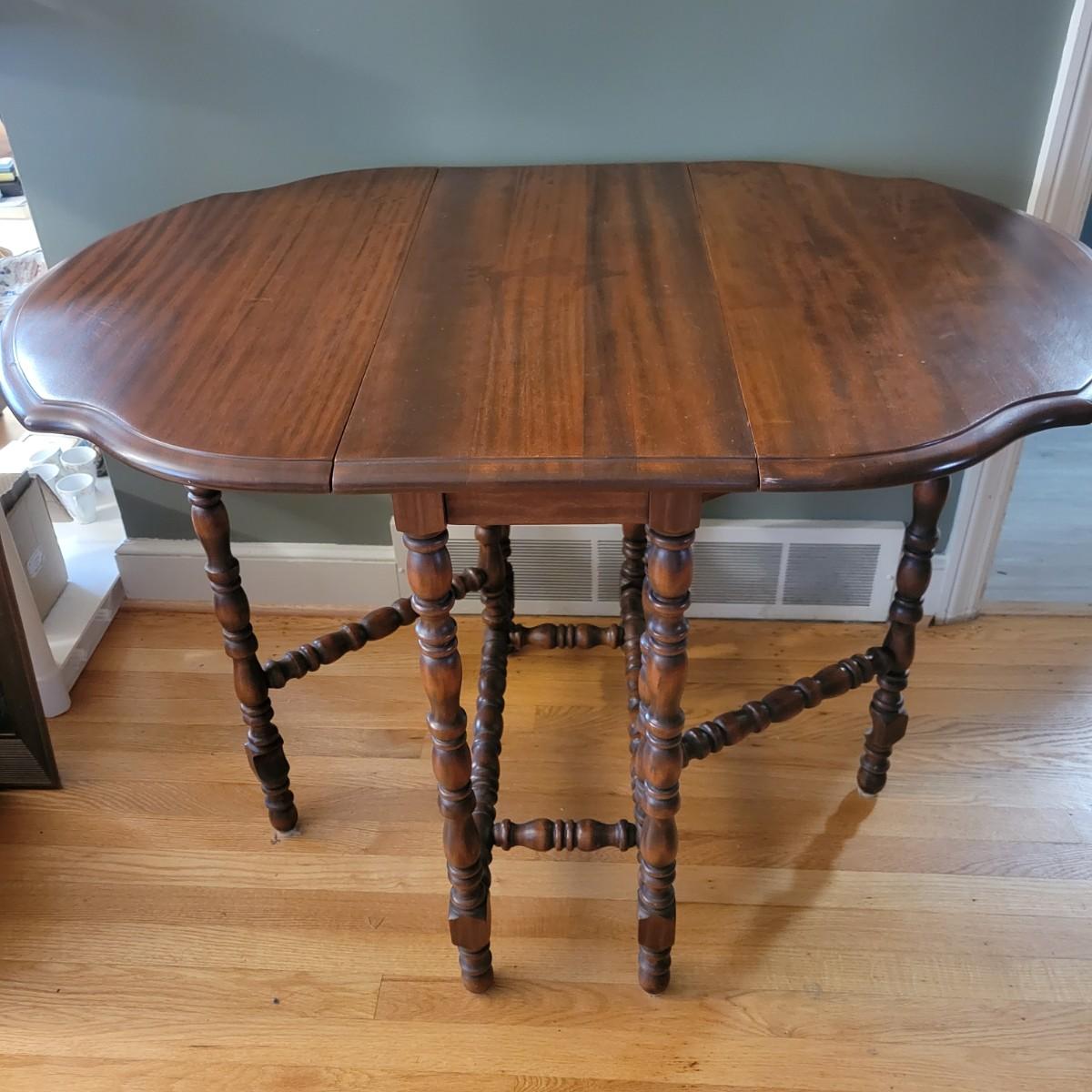 A wooden drop leaf accent table with spindle legs in good condition with some minor scratches and a stain. This table features a beautiful, rich stain with a unique supports for the leafs. Table measures approximately 42" x 30" x 29.5 " Local pickup only