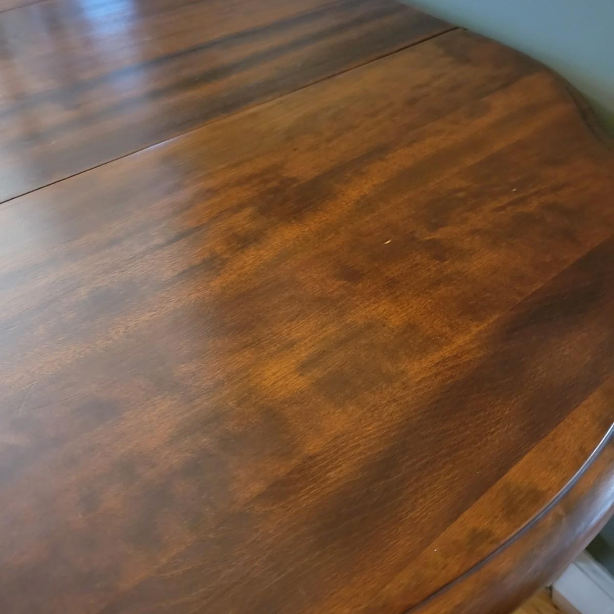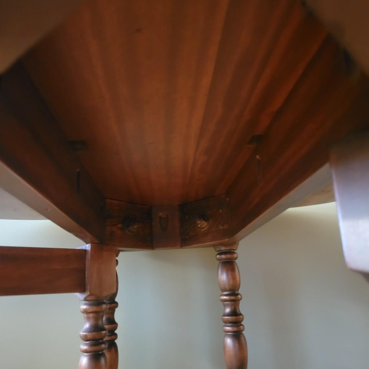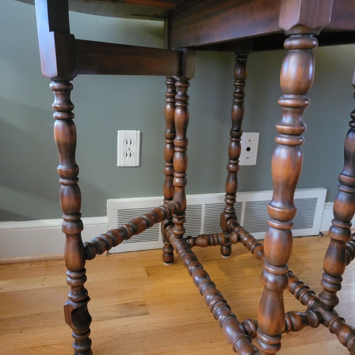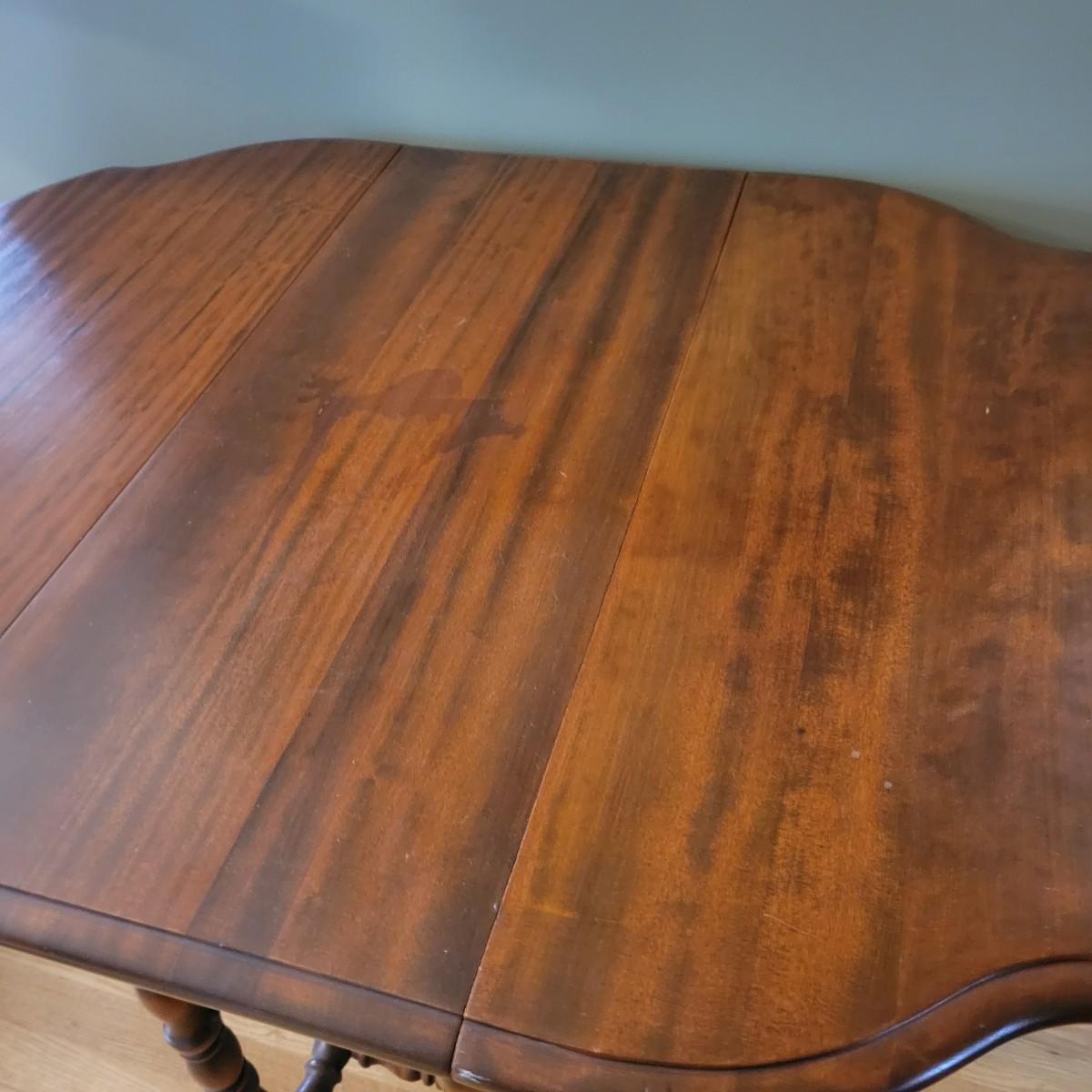 A wooden drop leaf accent table with spindle legs in good condition with some minor scratches and a stain. This table features a beautiful, rich stain with a unique supports for the leafs. Table measures approximately 42" x 30" x 29.5 " Local pickup only