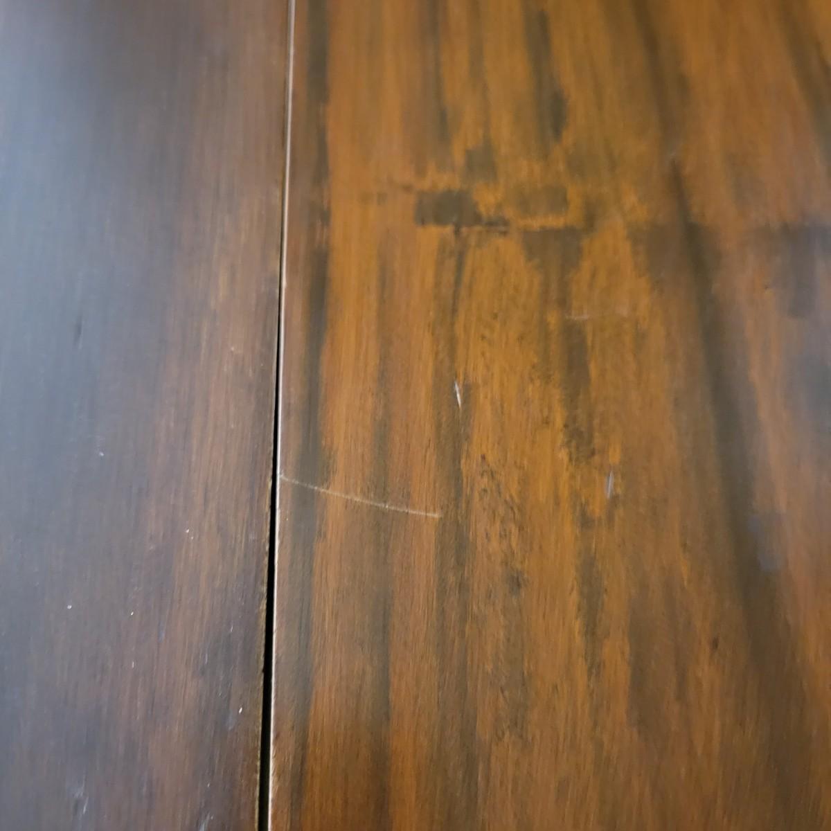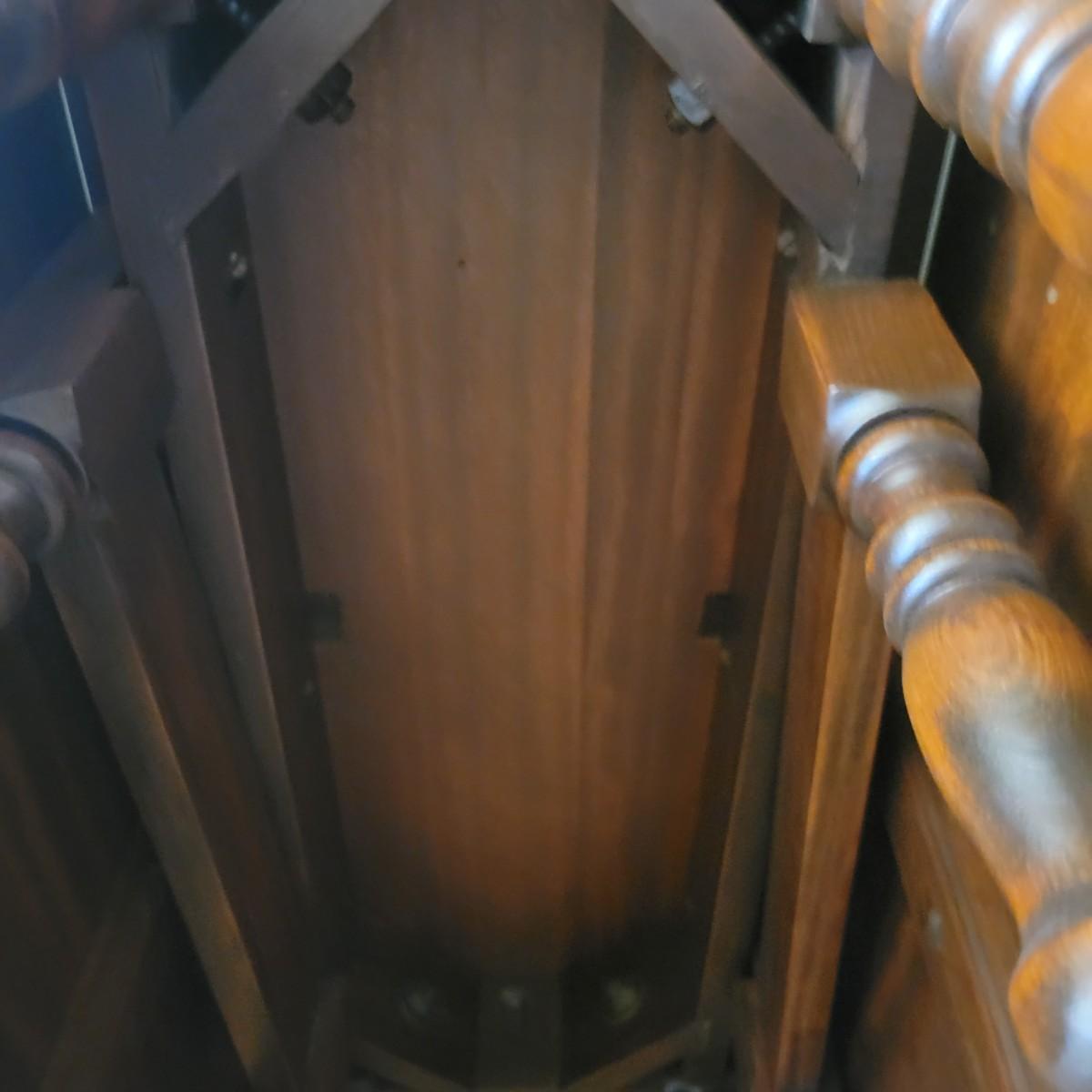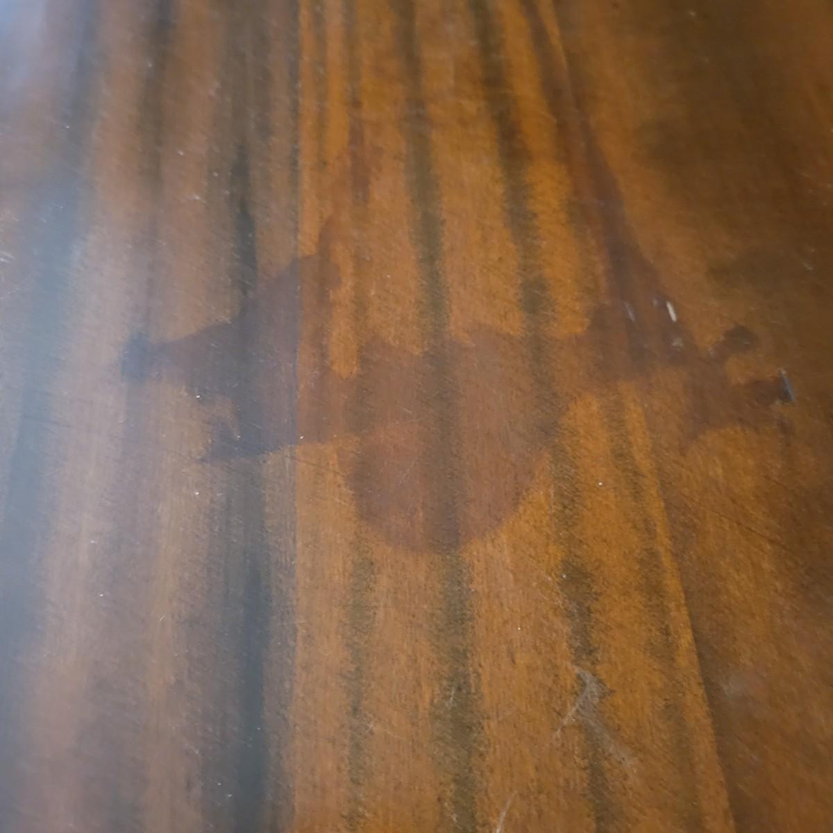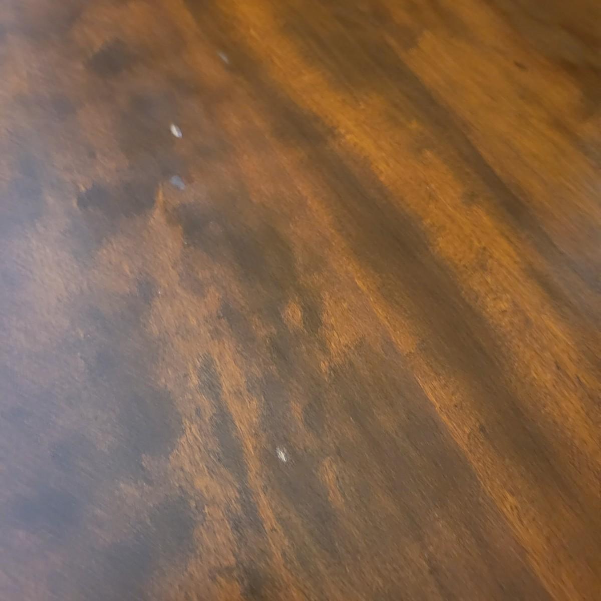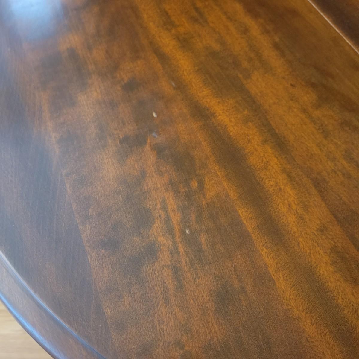 A wooden drop leaf accent table with spindle legs in good condition with some minor scratches and a stain. This table features a beautiful, rich stain with a unique supports for the leafs. Table measures approximately 42" x 30" x 29.5 " Local pickup only