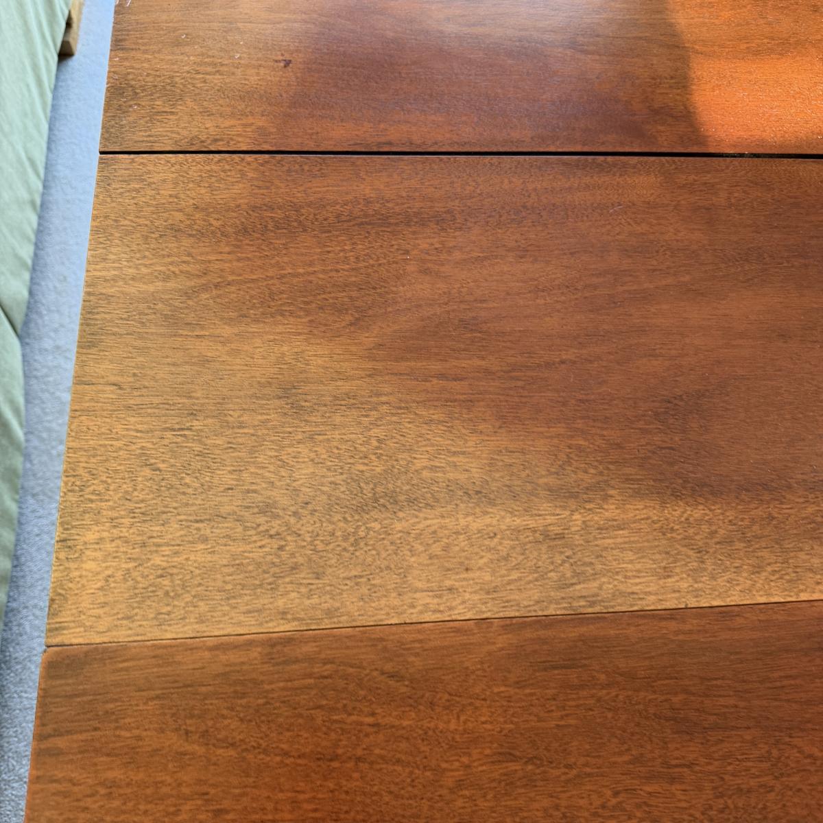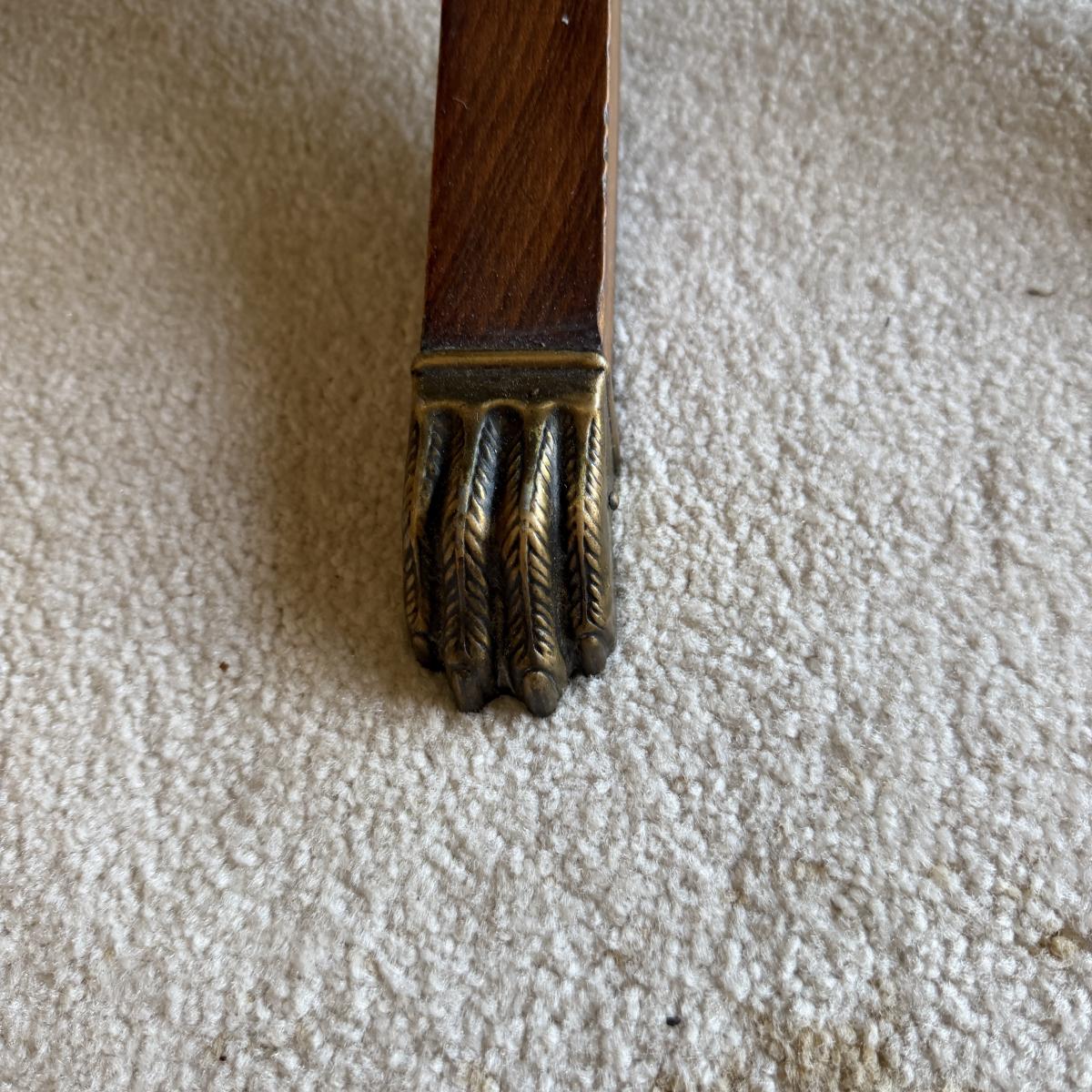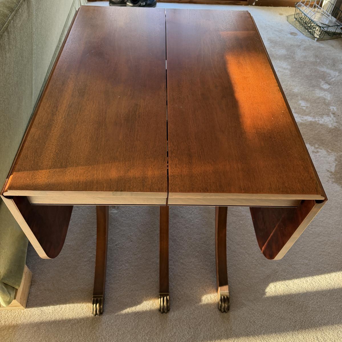 Lot includes a triple pedestal drop leaf table with brass capped claw feet. Table measures 56” x 36” x 30”H when open and 27.5” x 36” x 30”H with leaves dropped. There is no Removable leaf included. Table top has fading, see pictures.