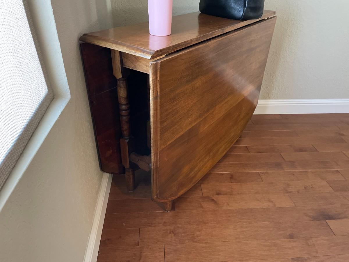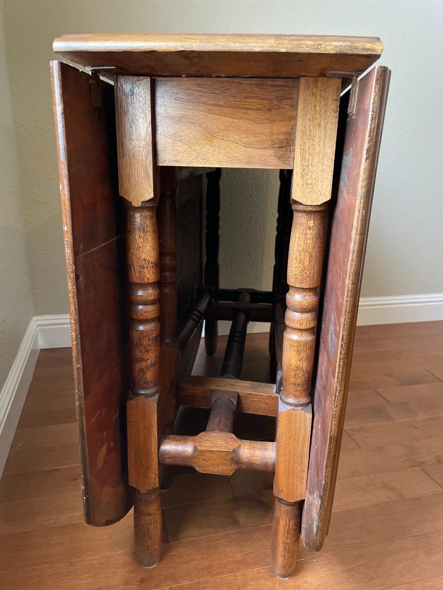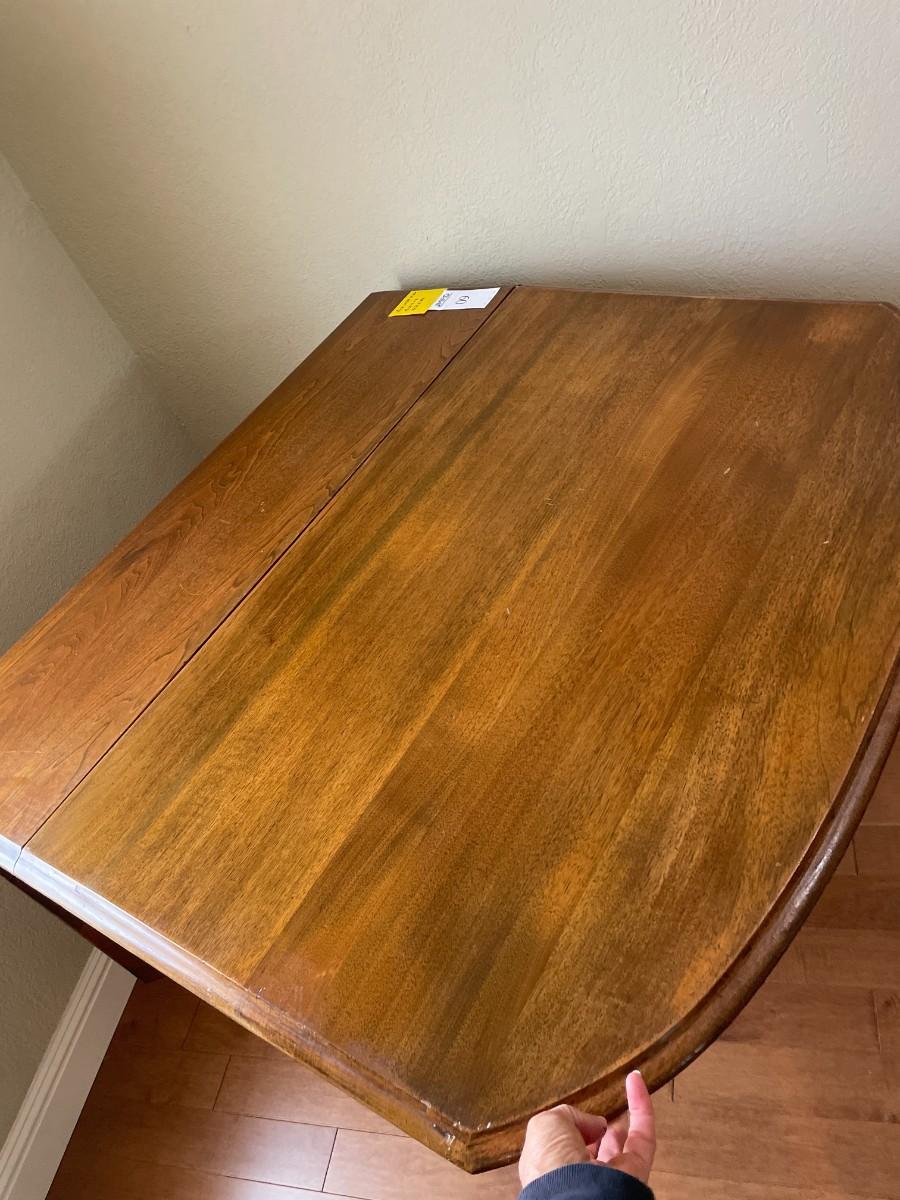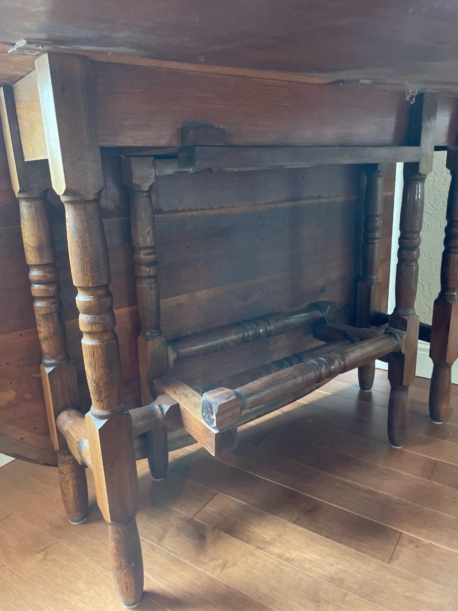 Oval table. Full size 42x58x30, closed: 42x13x30. Sturdy solid wood construction.