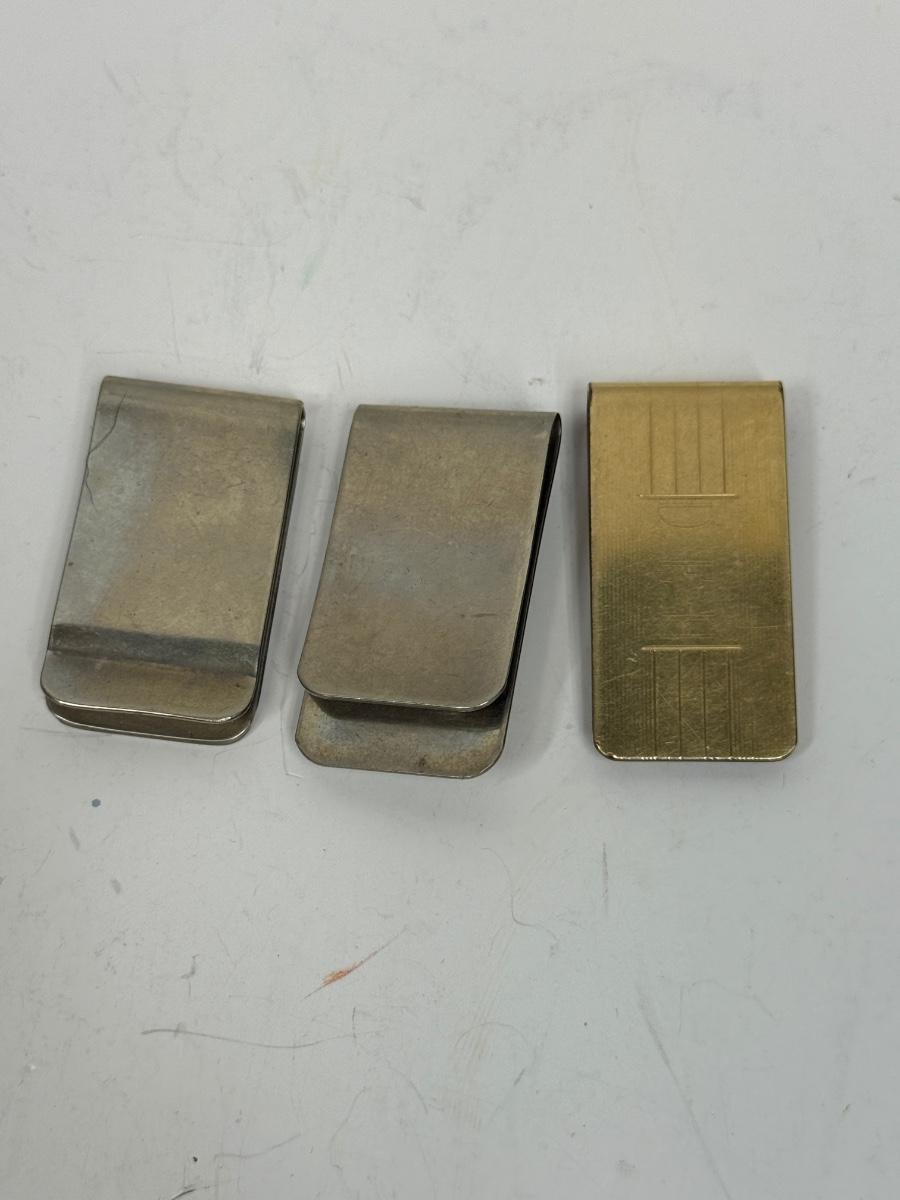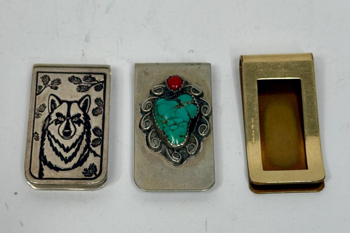 3 money clips: Wolf image, encrusted turquoise and red raised design, and simple smooth gold-tone clip.