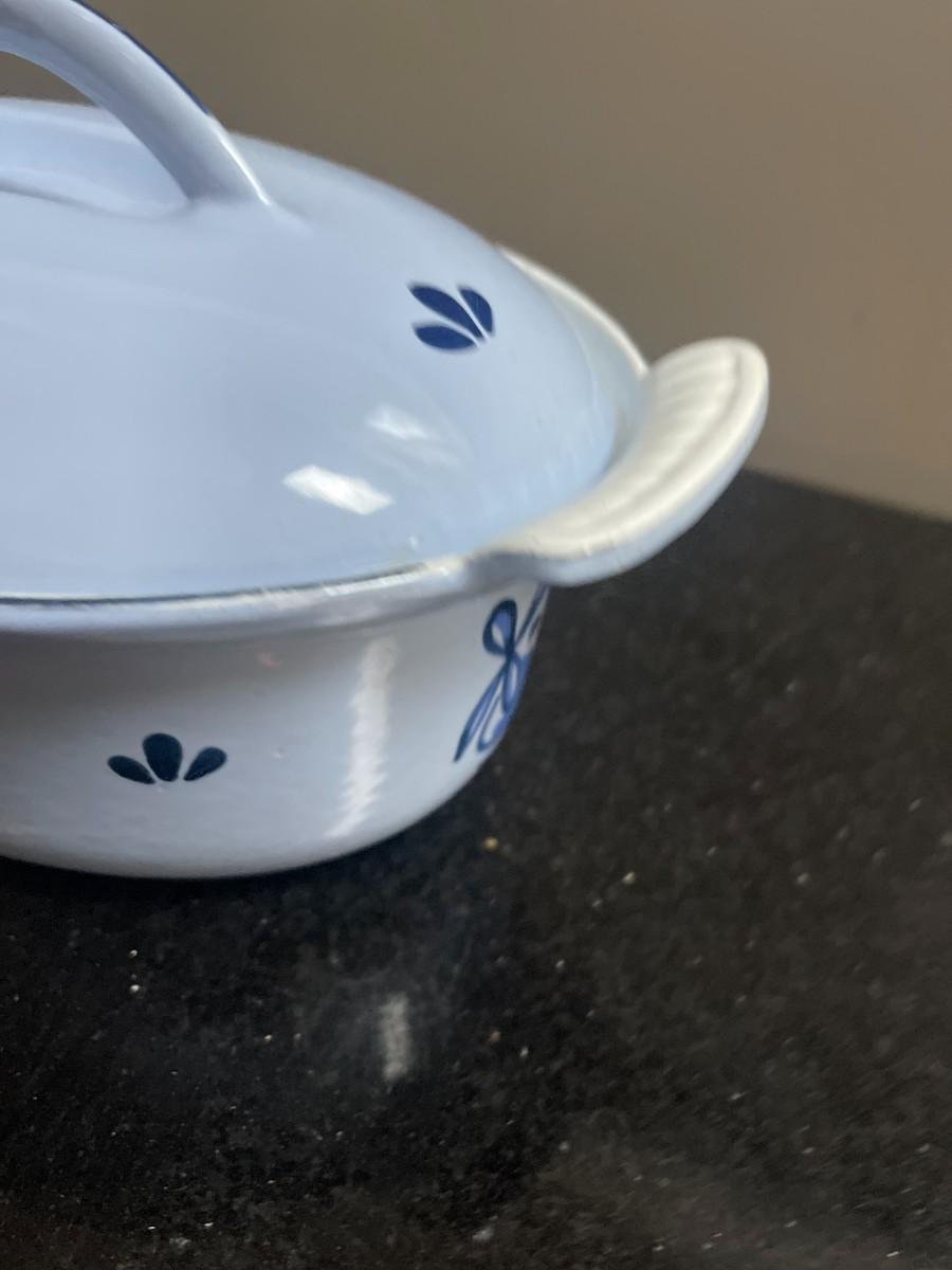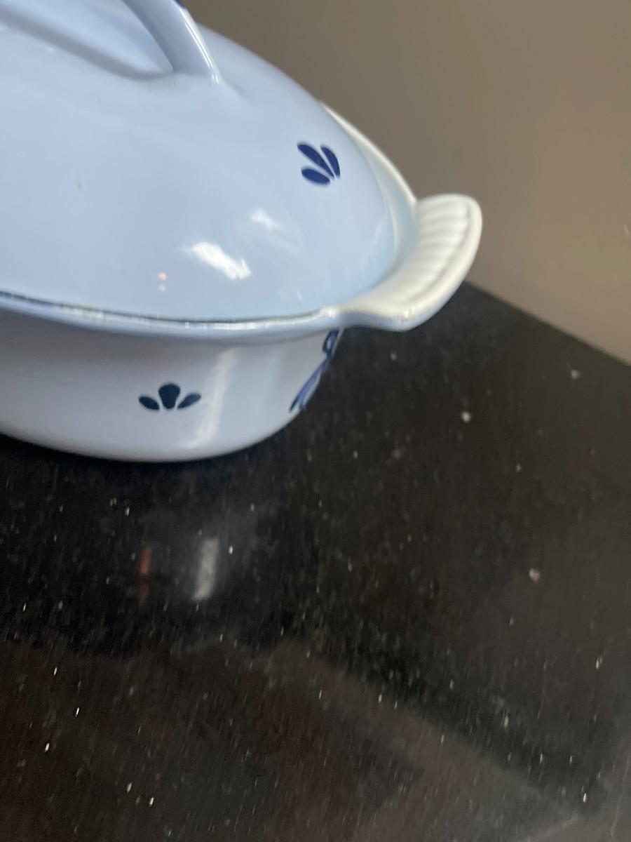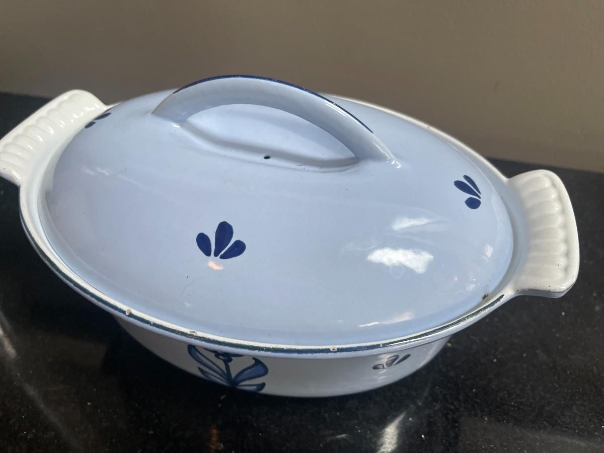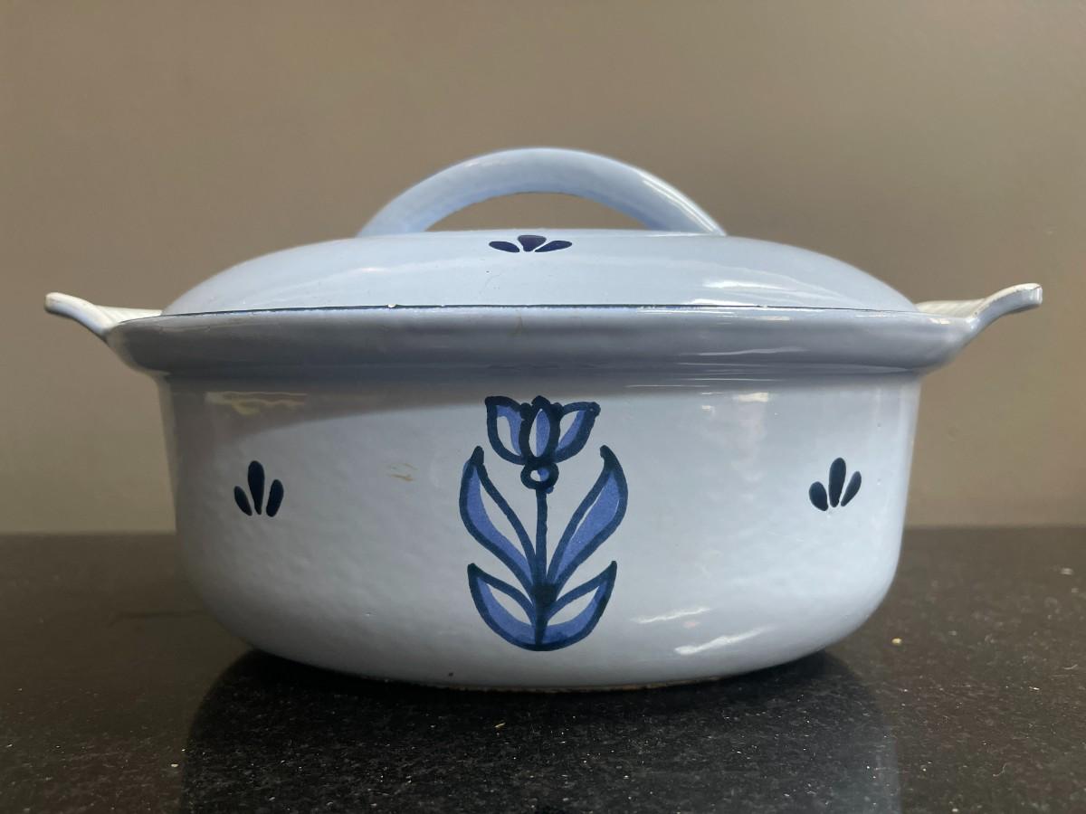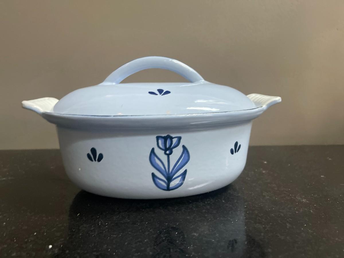 Dru Holland Enamel Cast Iron Blue Tulip Covered Casserole