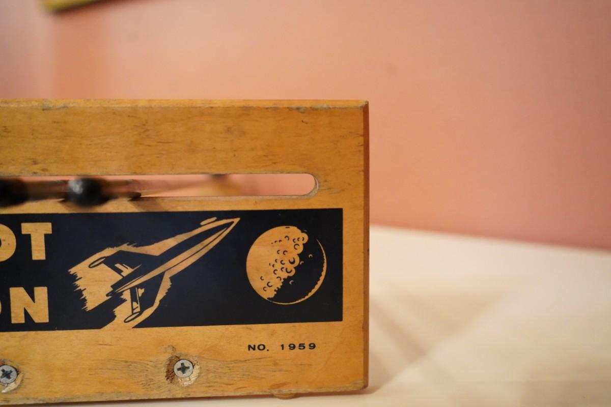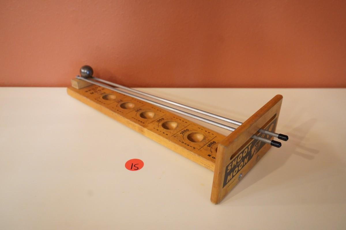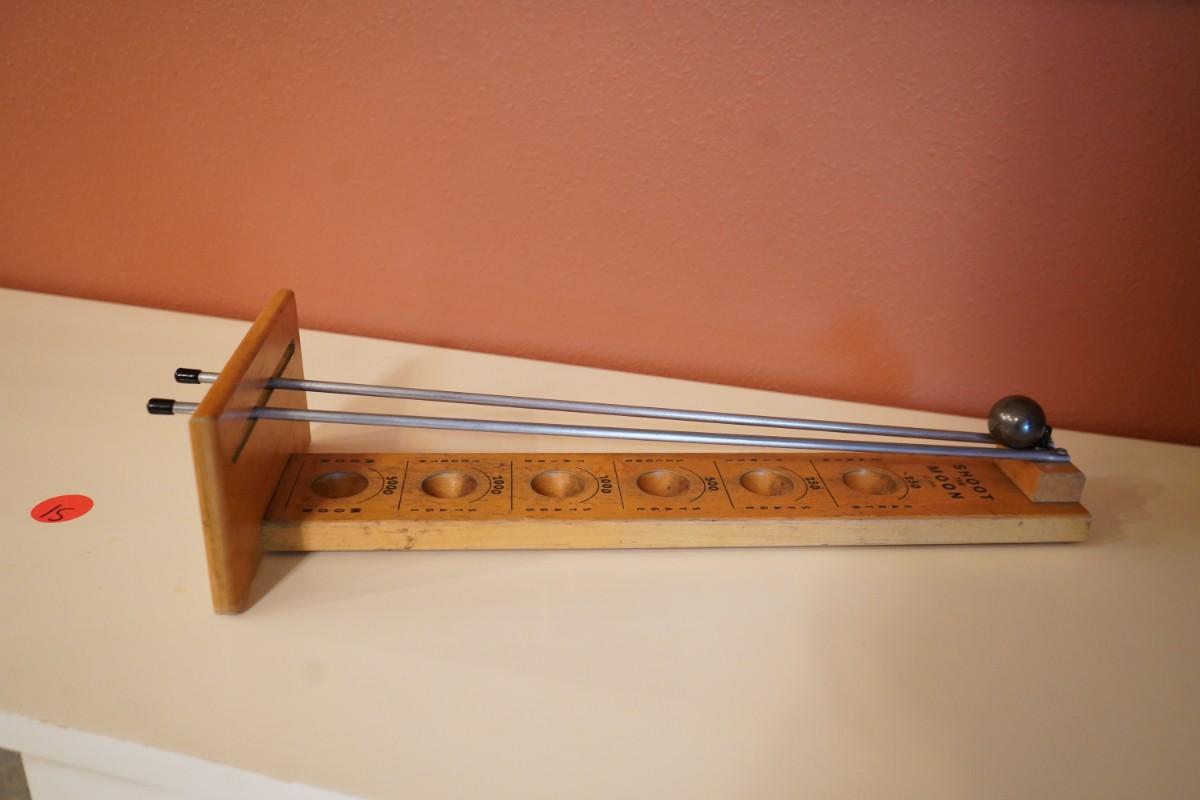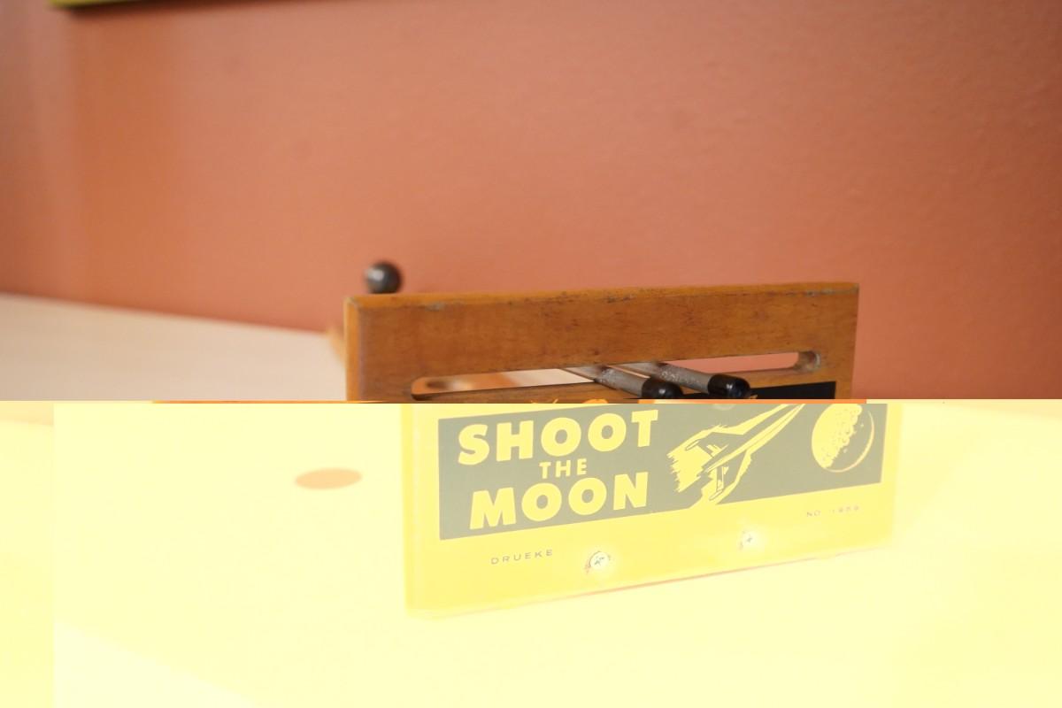 Vintage 1959 Shoot the Moon game by Drueke. A skill and action game that can be played with just one player. Original condition with one steel ball. - 7.5 W x 18.5 D x 4 H.