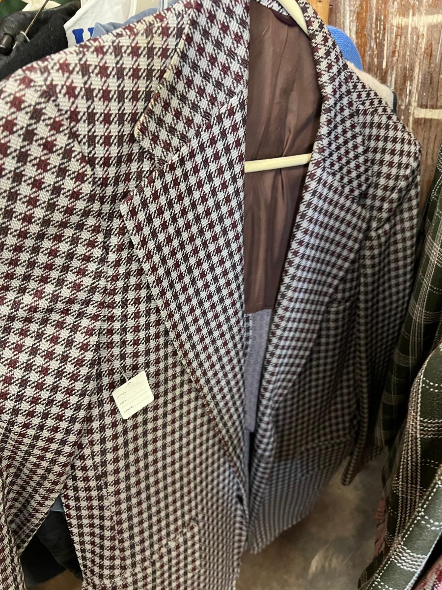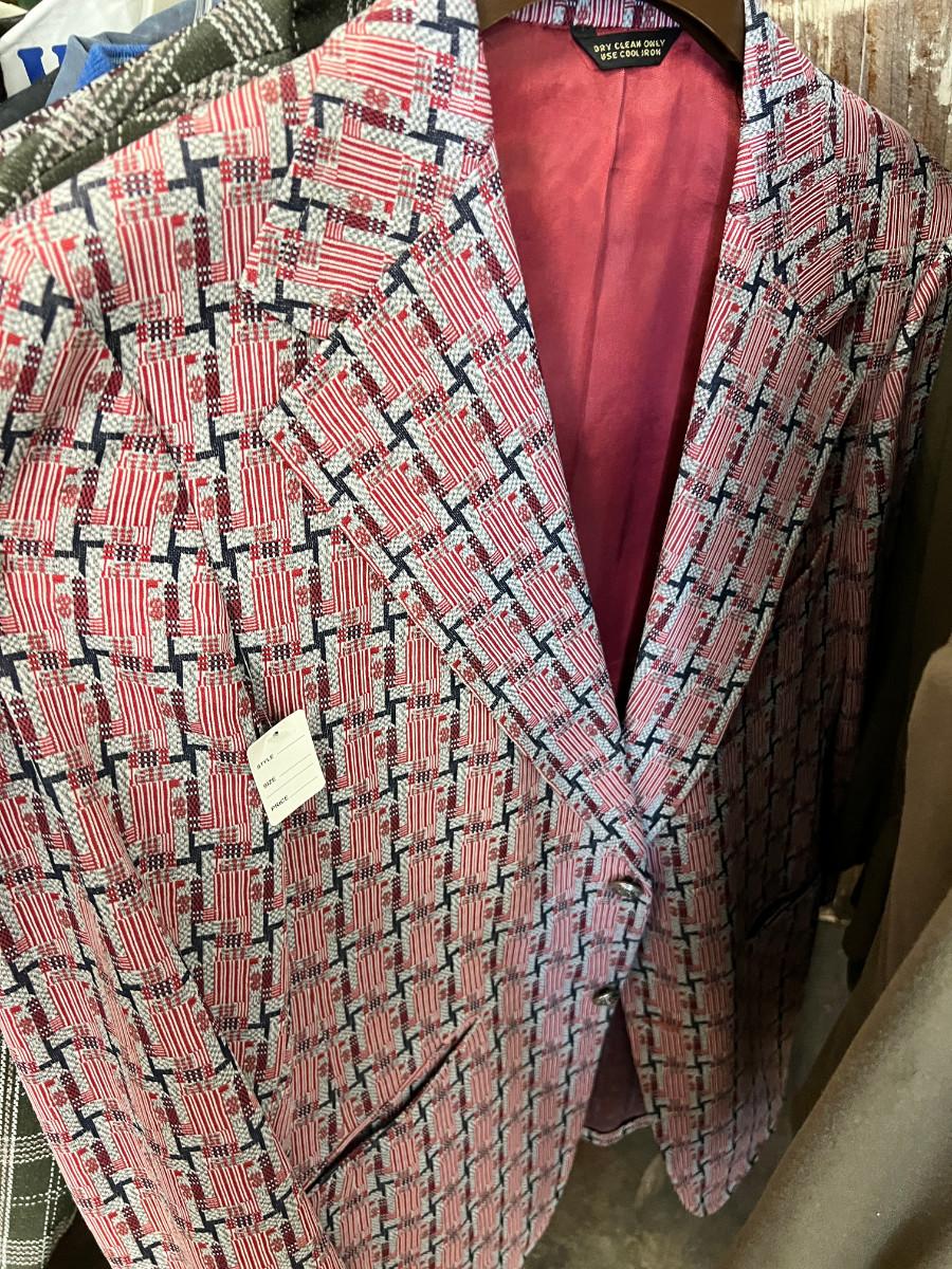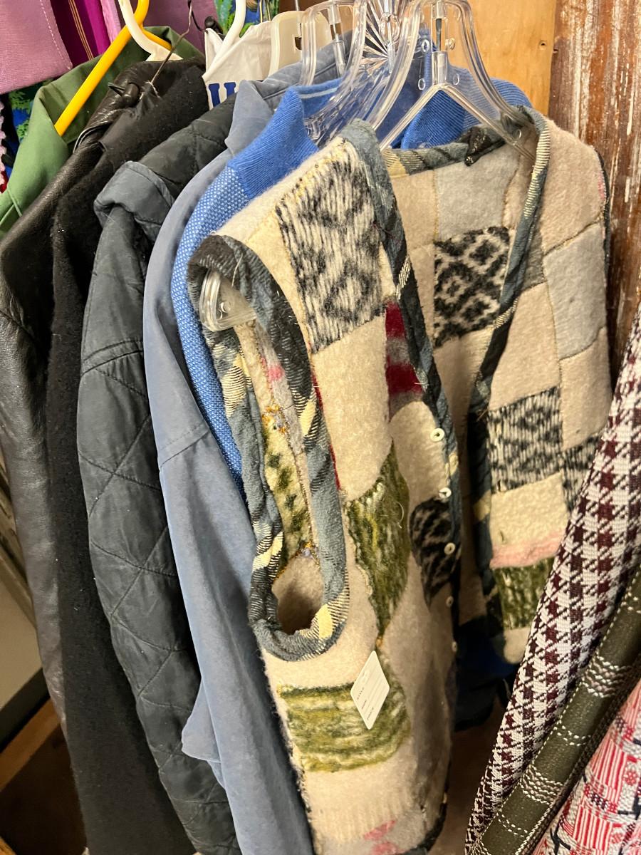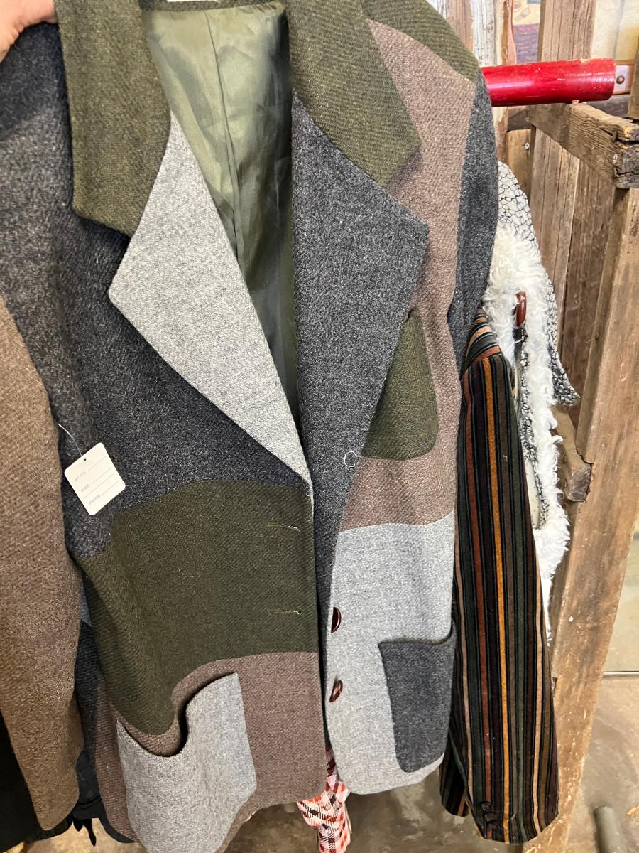 Men's Polyester sport coats with wild checks, 2 homemade vests , 1 made of recycled sweaters. Lather jacket, Vanguard Jacket, Wood patchwork jacket.