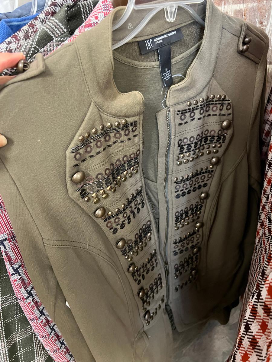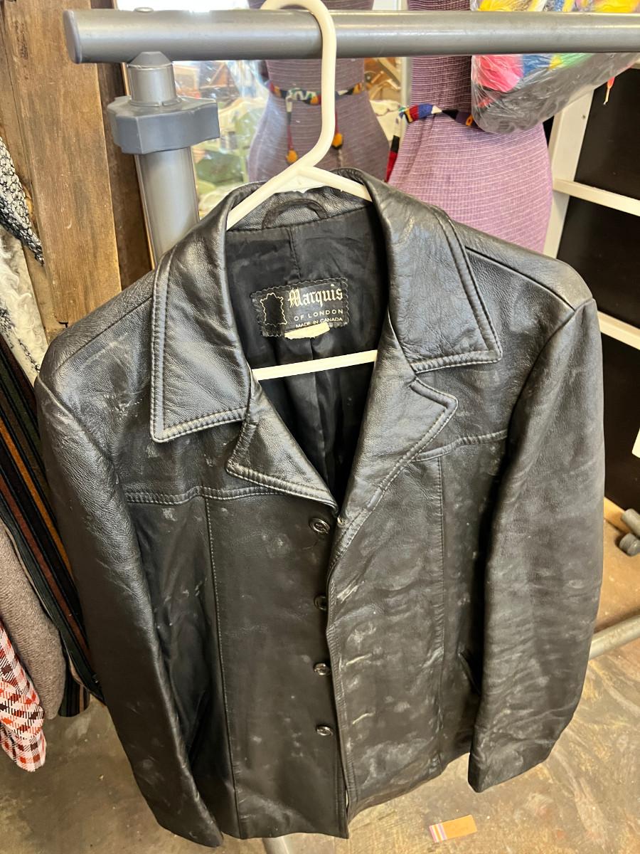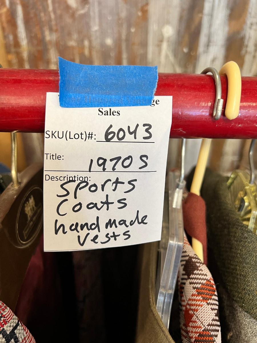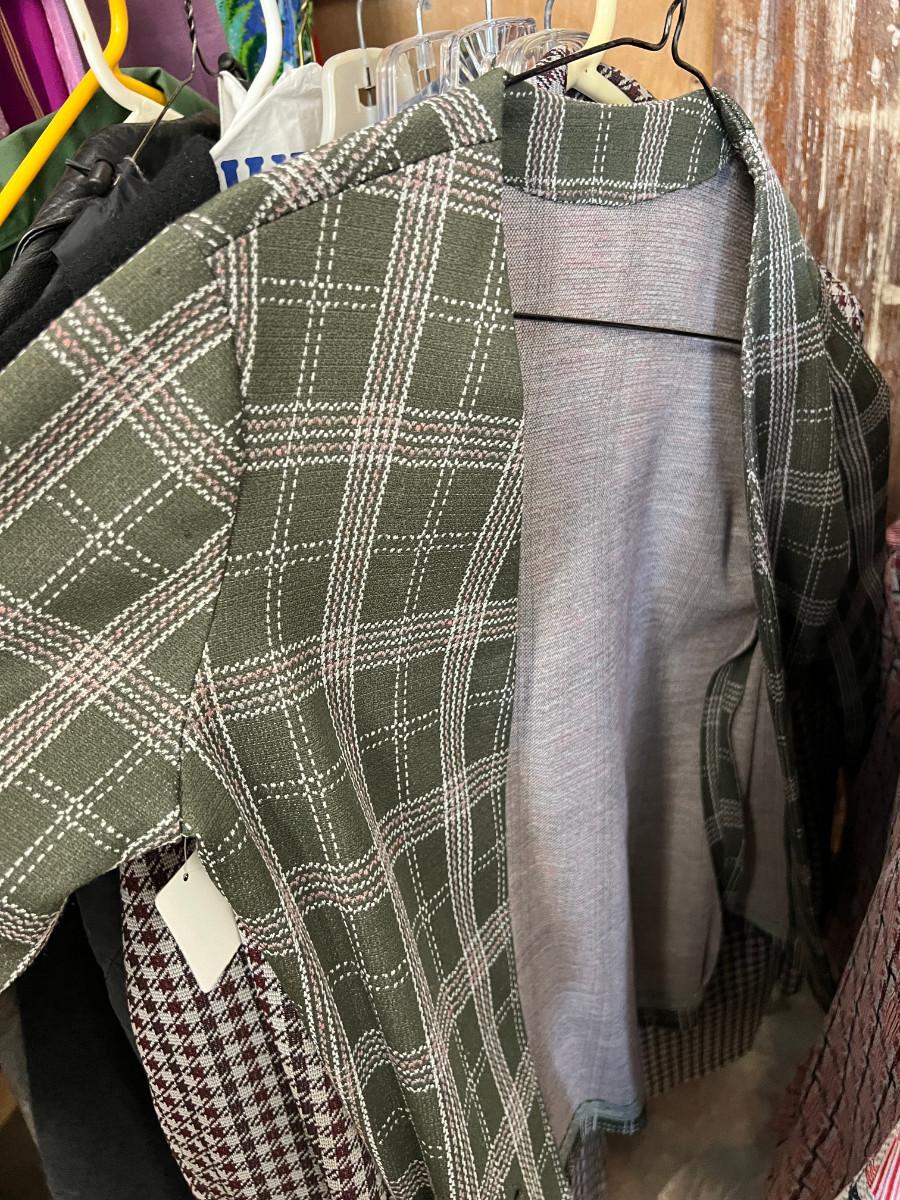 Men's Polyester sport coats with wild checks, 2 homemade vests , 1 made of recycled sweaters. Lather jacket, Vanguard Jacket, Wood patchwork jacket.