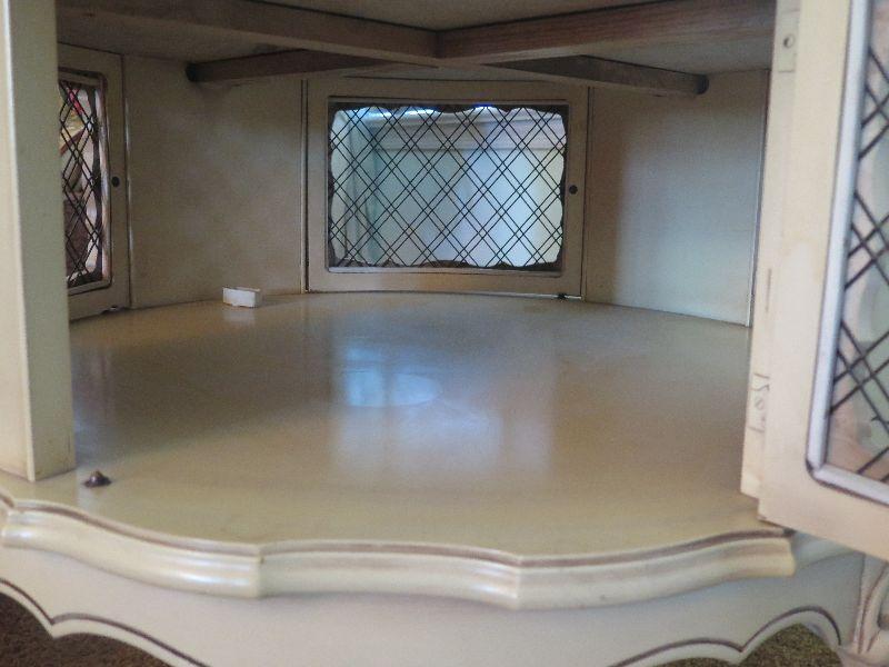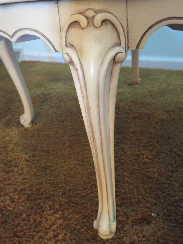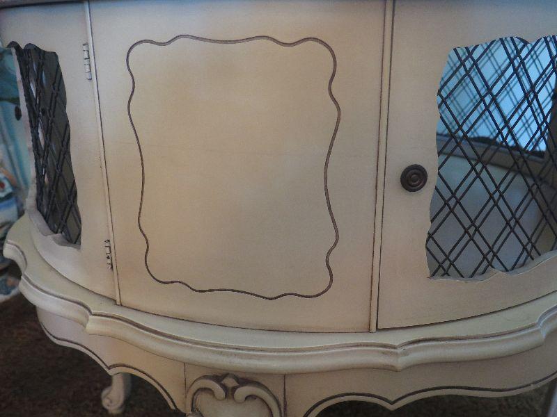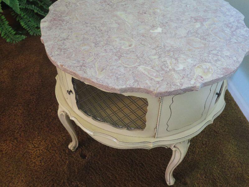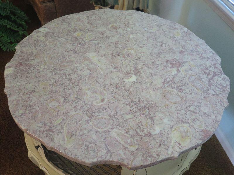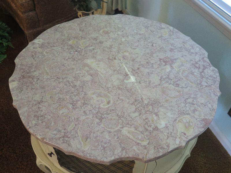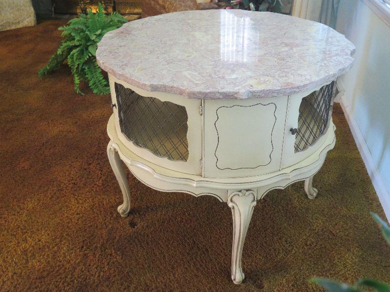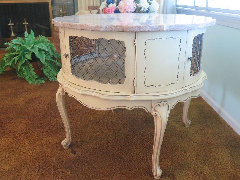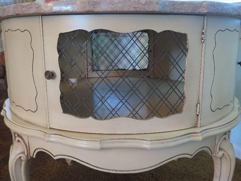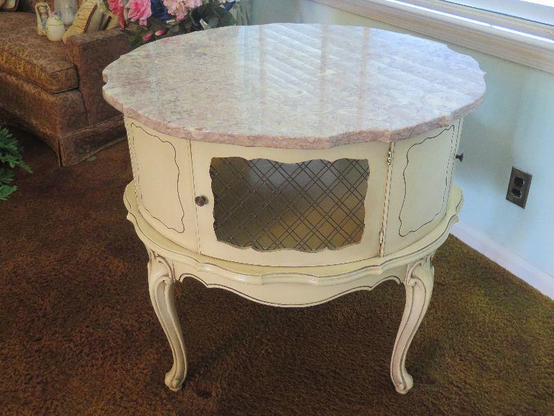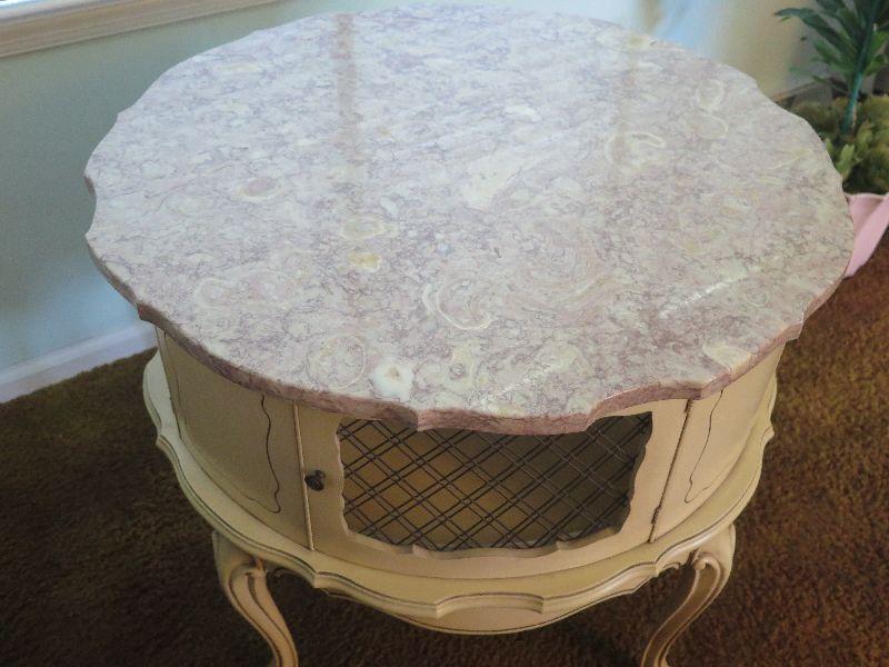 Beautiful mid-century French Provincial drum table, wired doors that open for inside storage, and a scalloped rose marble top. Matches tiered side tables. 32x32x28. Please review all photos and read Terms and Conditions before placing a bid. Pick up is Wednesday, November 20 from 4-7pm and Saturday, November 23 from 9am-2pm in Mantua, New Jersey. All sales are final. All sales are as is, where is. Please bring all boxes, tools, and muscle needed to remove your items. Any photo props are not included. All measurements are approximate. Items come from dog-friendly home.