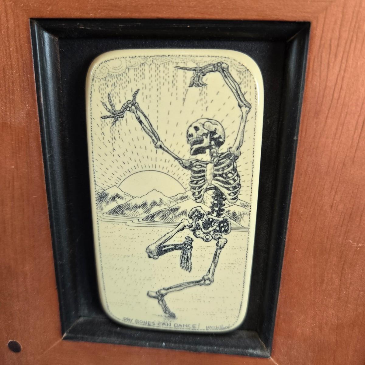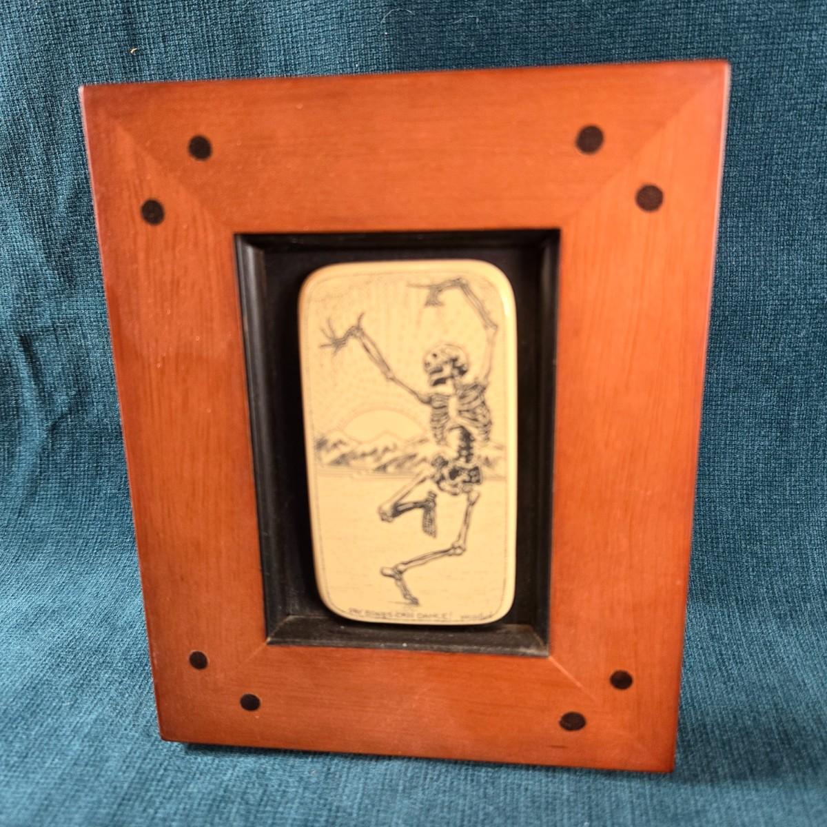 This auction lot is for a "Dry Bones Can Dance" Scrimshaw Style Art . We have no idea of the artist (signed but not able to read) or what this is made of but it does look mighty cool. Frame size is 4-1/2 inches wide x 5-1/2 inches tall.