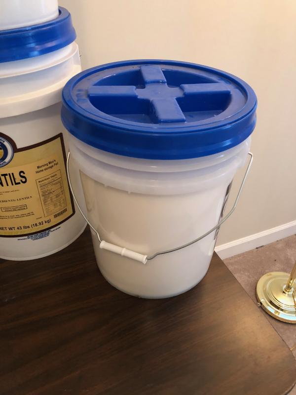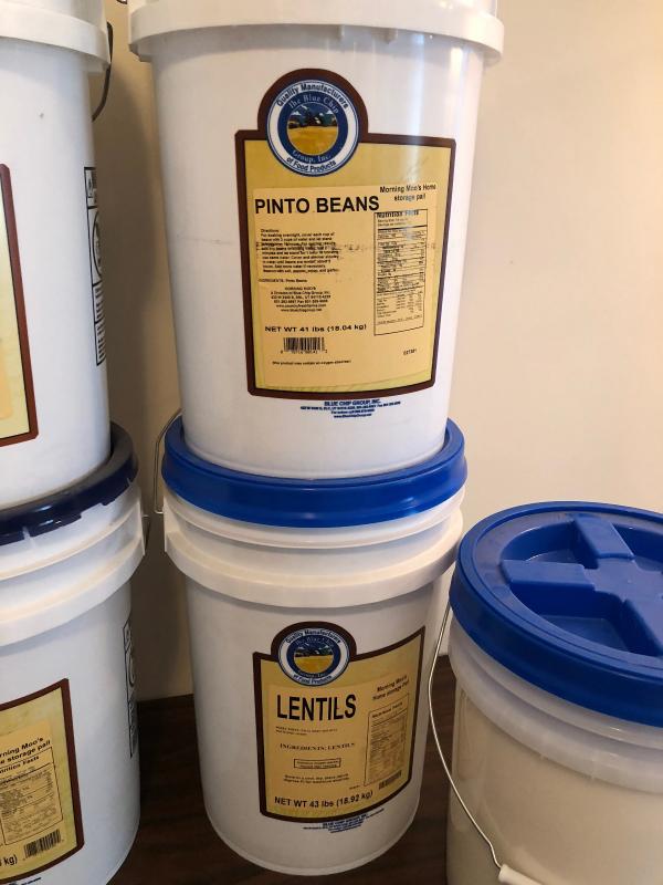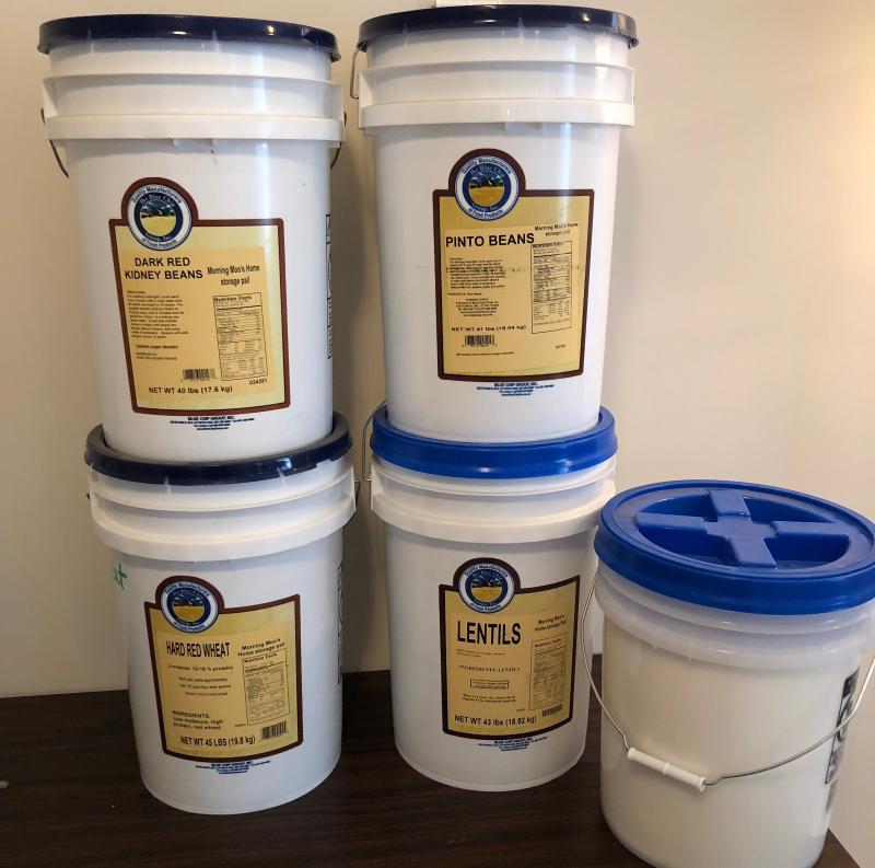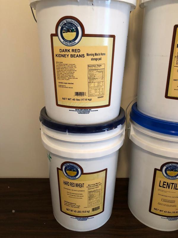 Survivalist dry bulk food lot of beans and wheat...40 lb sealed plastic containers...(5)...from Blue Chip....